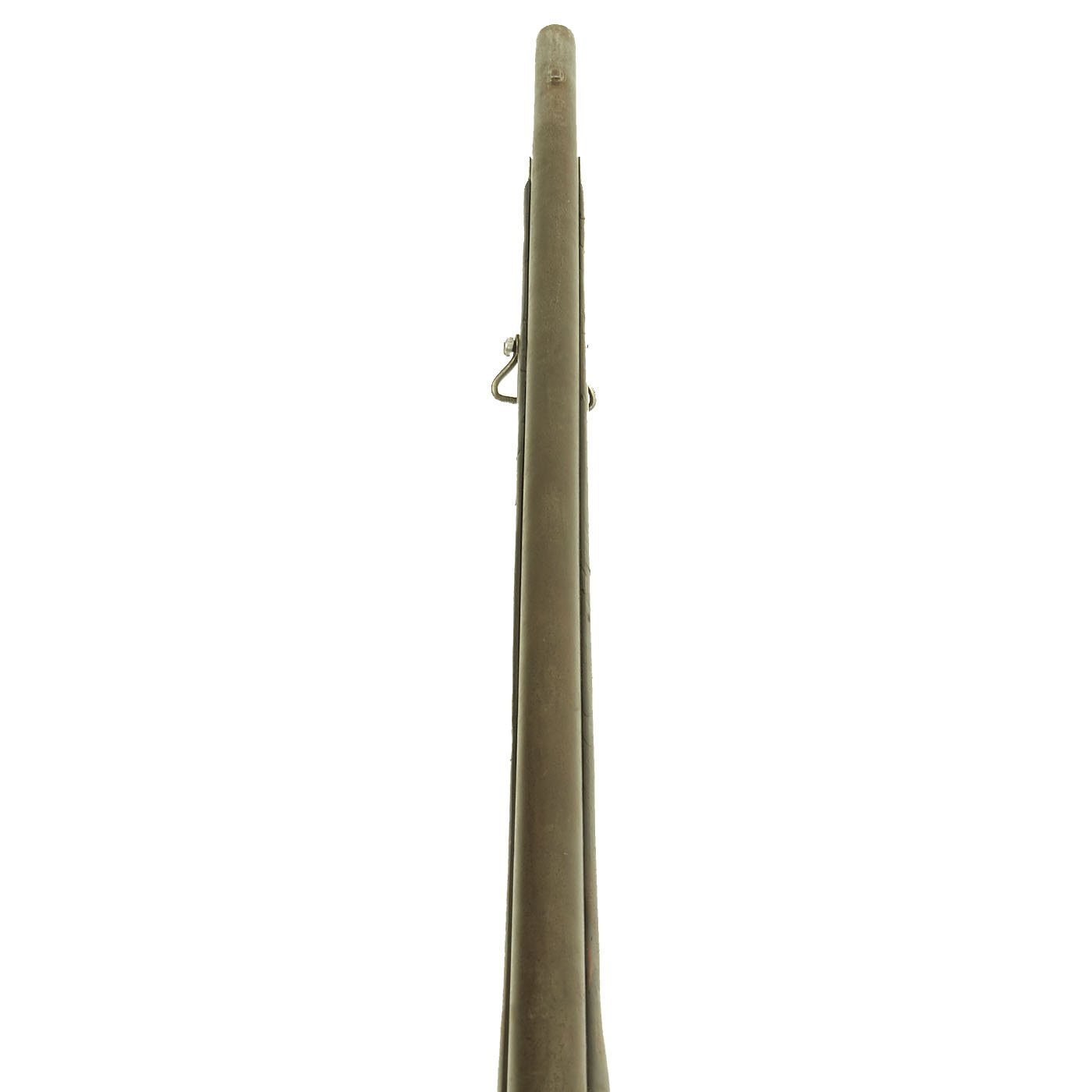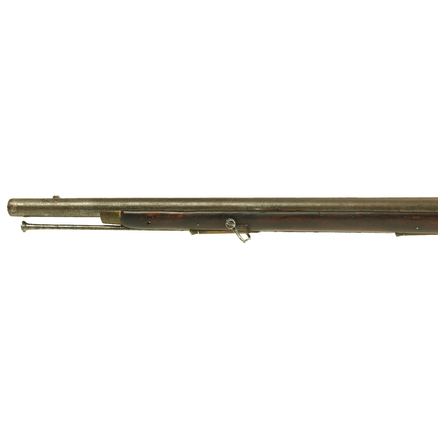 The condition of this rare musket is very nice, with a lovely patina on the metalwork, and a great stock with a lot of curl in some areas. The ramrod channel even still has an RR stamping, most likely for the stock maker. The lock functions correctly, holding at half cock and firing at full. Just a lovely musket.