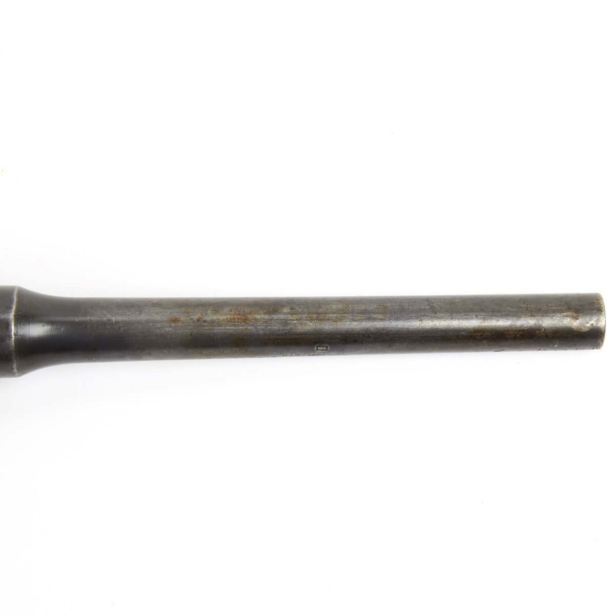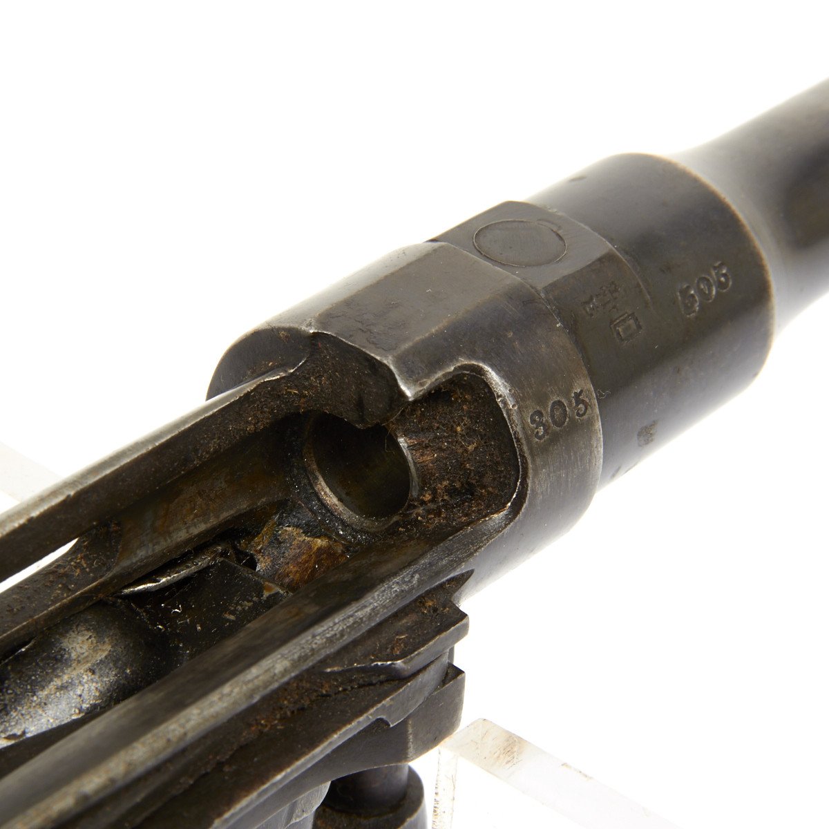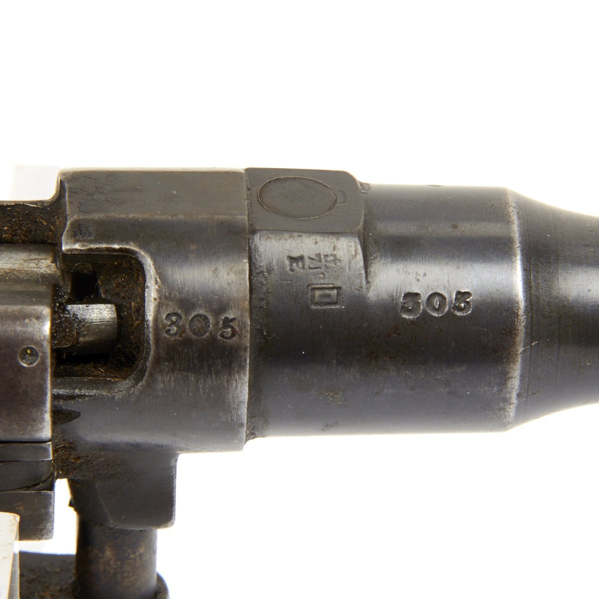 This example is especially interesting in that it is fitted with the earliest .303 caliber magazine that has a built in "hook" to the top right side. The left side of the magazine casing has been milled out to show the inner workings. The barrel has been shortened and the front stock officially discarded. The butt wood has been cut back and part of the butt socket cut away to allow a view of the works of the system. The barrel has been demilled with a hard steel pin welded through the chamber from top to bottom. The weapon still retains the long-range rear sight to the left side and the correct brass butt plate with steel trap door.