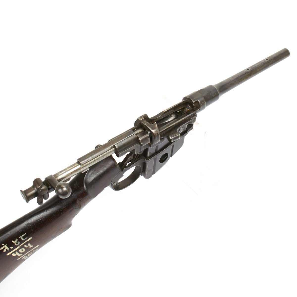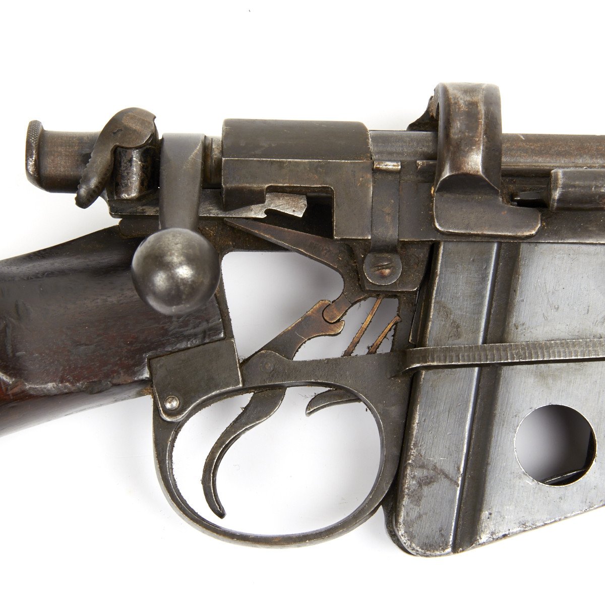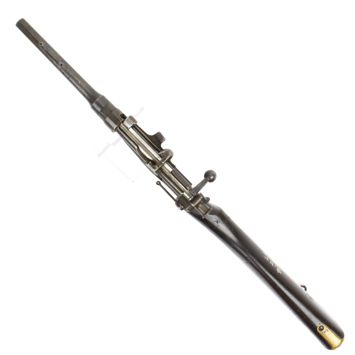 Beautifully executed by Victorian Craftsmen this is a mega rare example that has all the correct features of the earliest long Lee Enfield P-1895 magazine Rifle production. These include a steel butt plate with brass trap door and the cutaway of the earliest ten shot magazine. The barrel shortened, drilled and welded to the receiver making is unable to chamber a cartridge, as these were intended as training devises only, making this an amazingly rare item to appear on the open collector’s market.