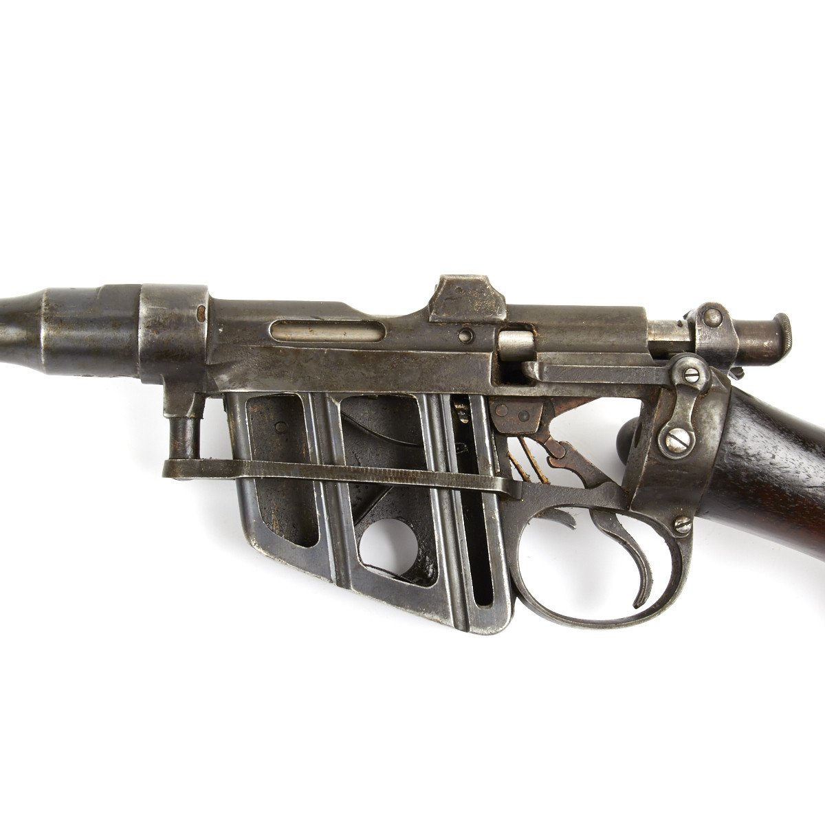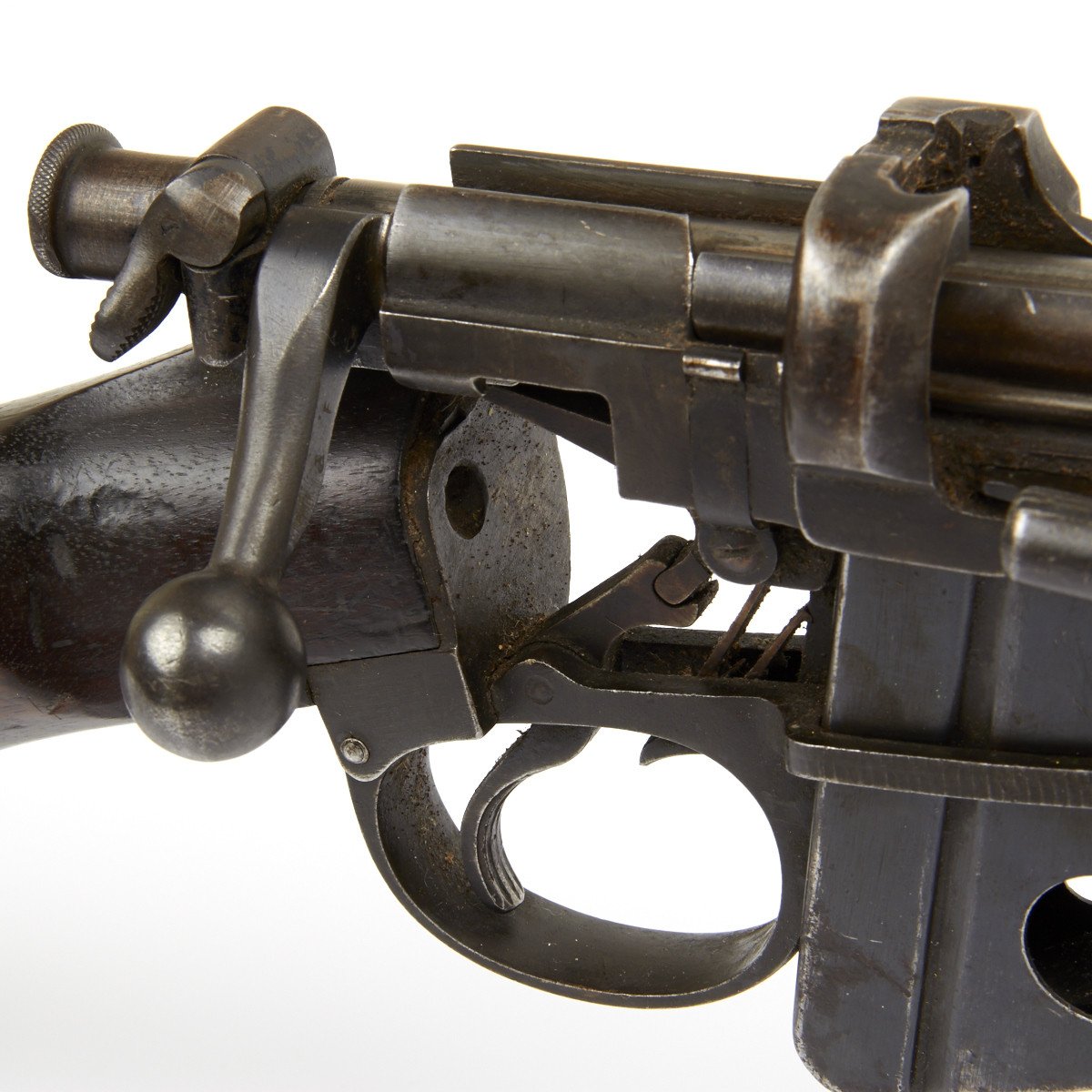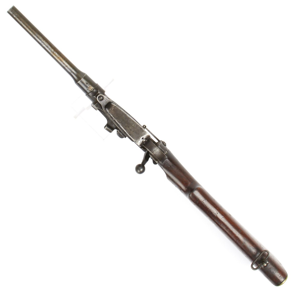 Beautifully executed by Victorian Craftsmen this is a mega rare example that has all the correct features of the earliest long Lee Enfield P-1895 magazine Rifle production. These include a steel butt plate with brass trap door and the cutaway of the earliest ten shot magazine. The barrel shortened, drilled and welded to the receiver making is unable to chamber a cartridge, as these were intended as training devises only, making this an amazingly rare item to appear on the open collector’s market.