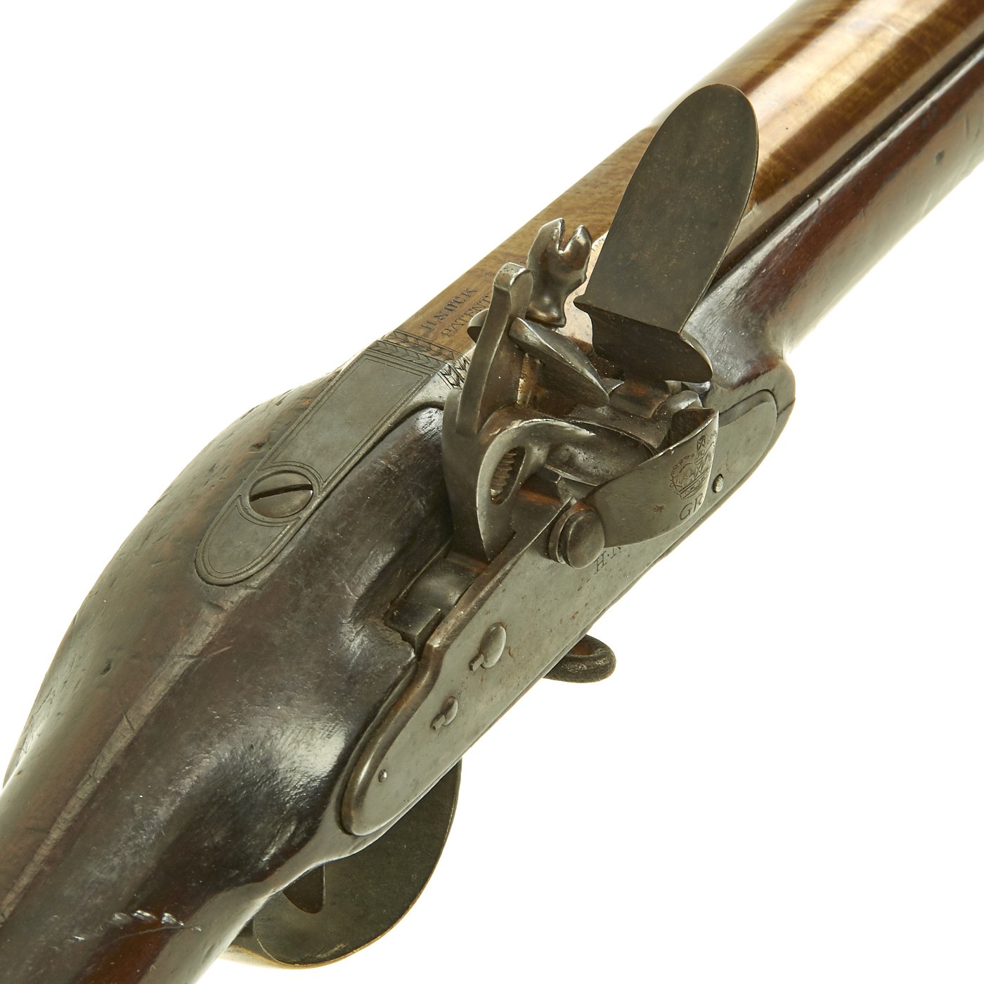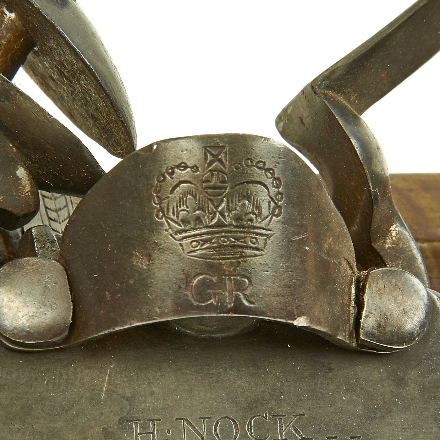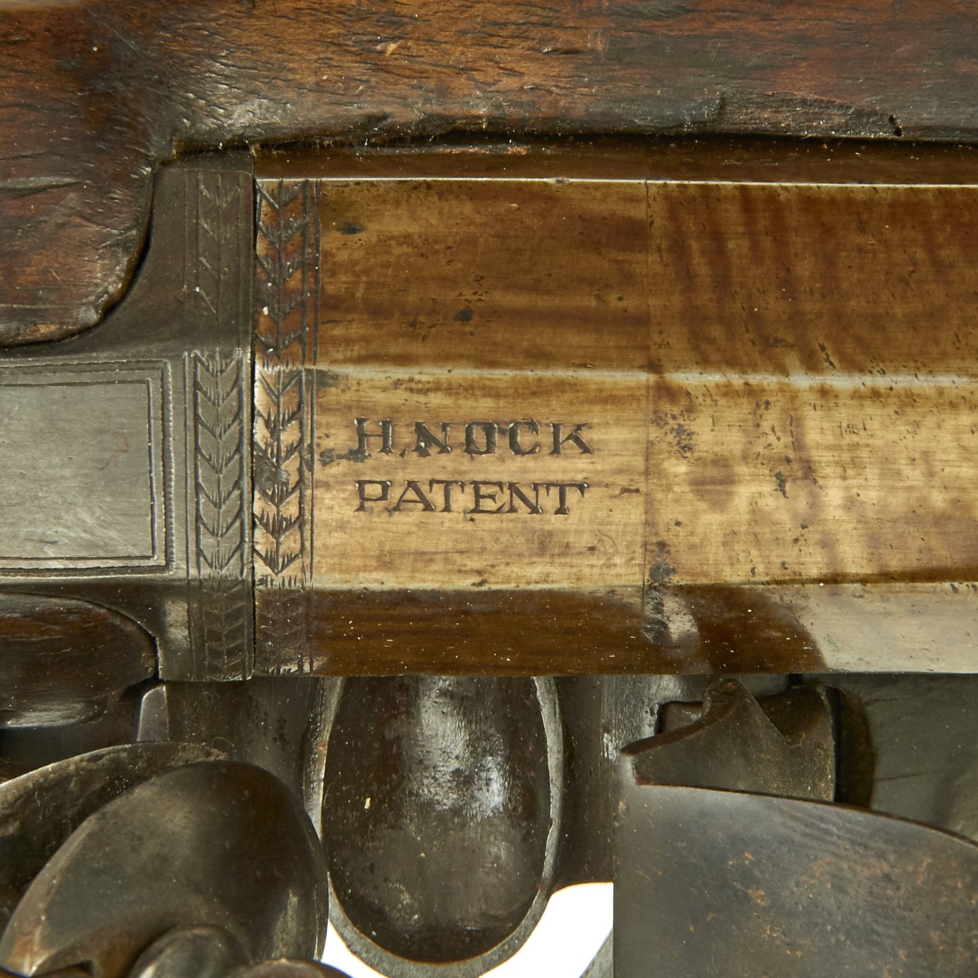 Original item: One of a Kind. These flintlock carbines are extremely rare! Made by the famous London Gun Maker HENRY NOCK, it is fitted with his patented internal flintlock mechanism signed H. NOCK. The pan flash guard side cover is engraved with the CROWN over G.R. royal cypher.