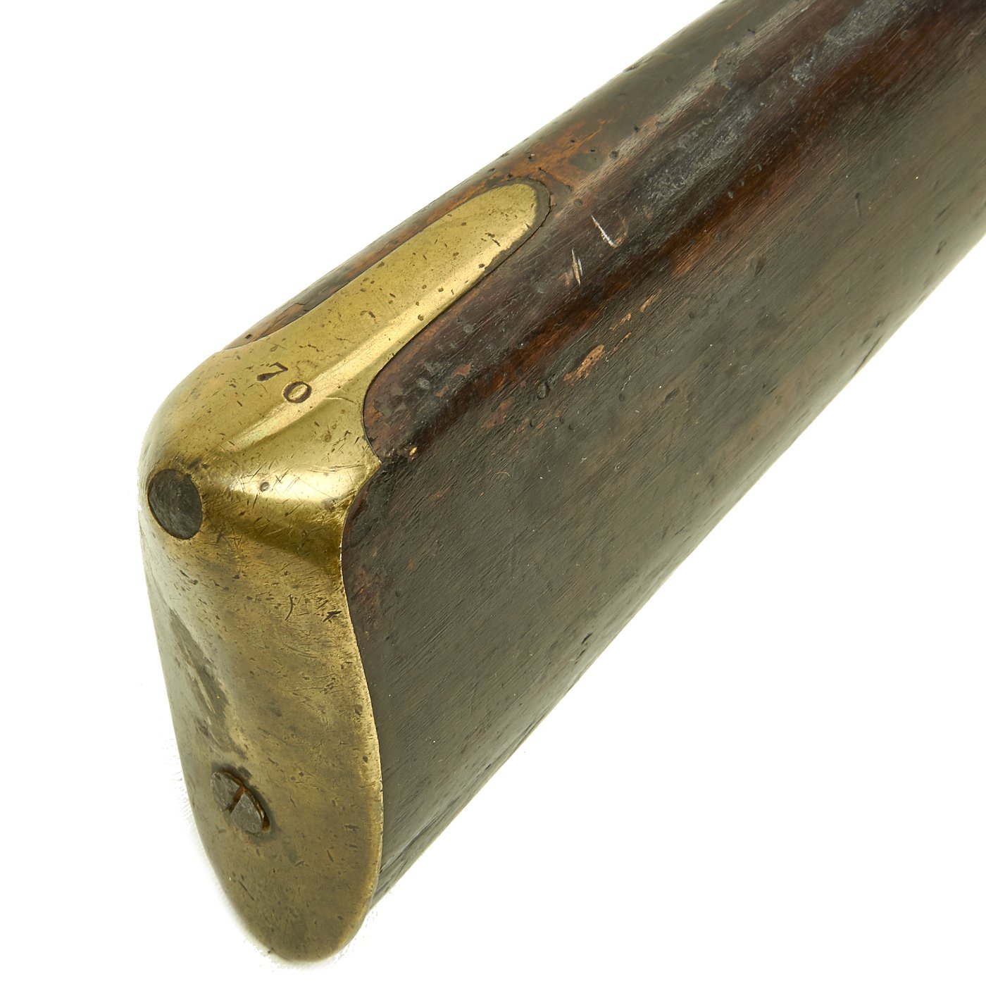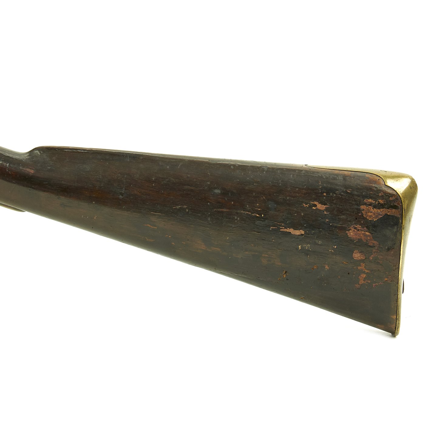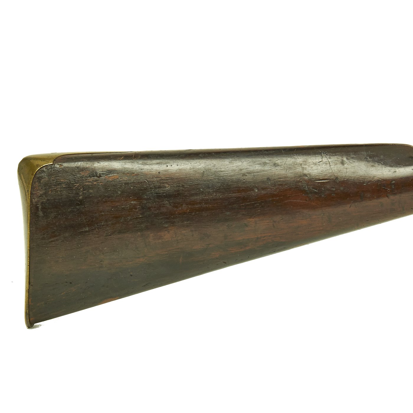 All brass mounts, butt plate numbered 70, trigger guard, two ramrod pipes and a brass nose cap. No brass side plate ever fitted only a brass cup for the head of the single lock screw. Ring neck cock and complete with its original button head ram rod in place with two sling swivels. There is also a WT stamped in the channel.