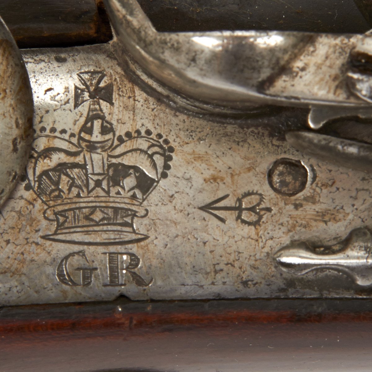The lock mechanism is marked with Crown over "G.R." and TOWER across the tail. The lock is prior to the 1777 model in that there is only one visible bolt behind the cock. There never were any sling swivels, another Naval requirement.