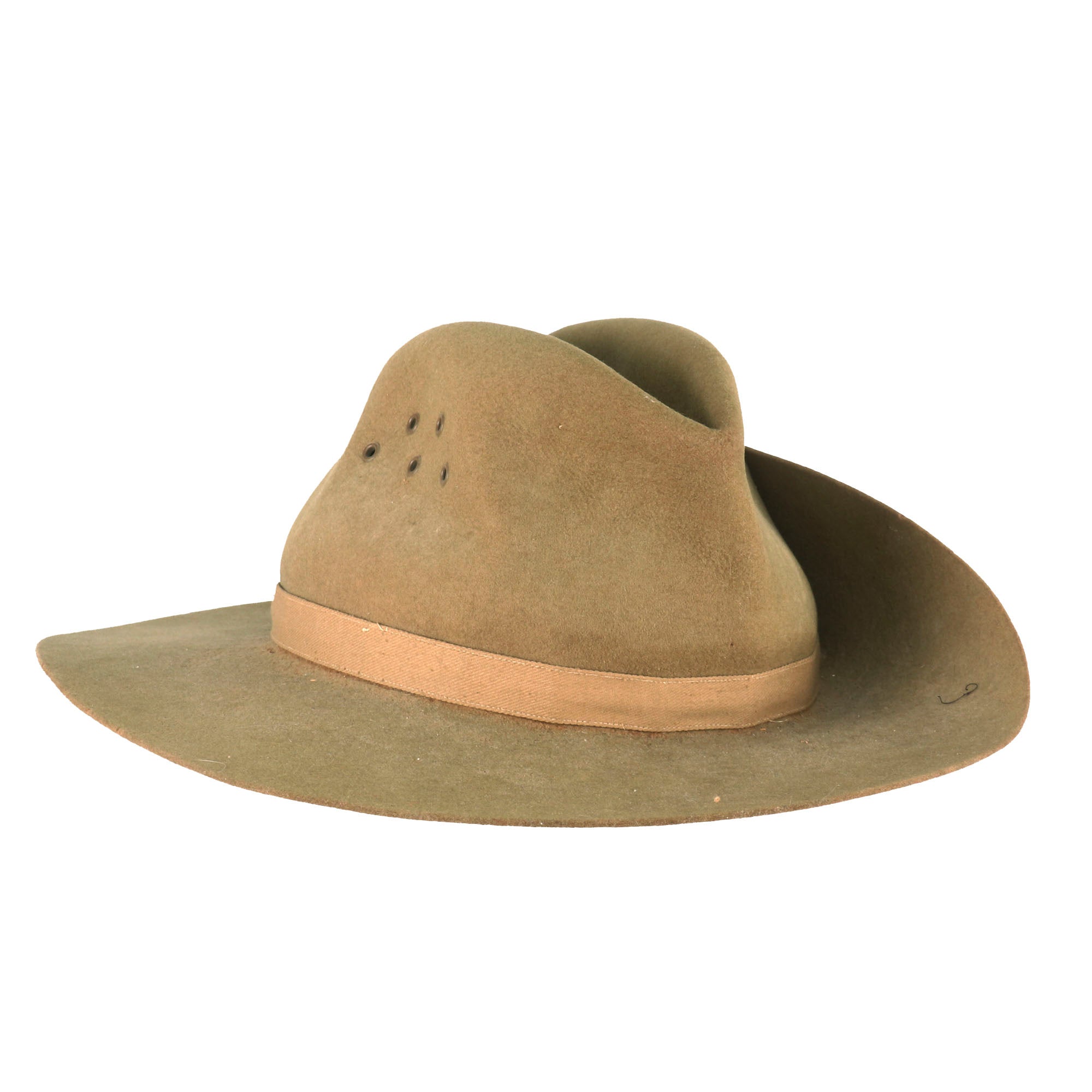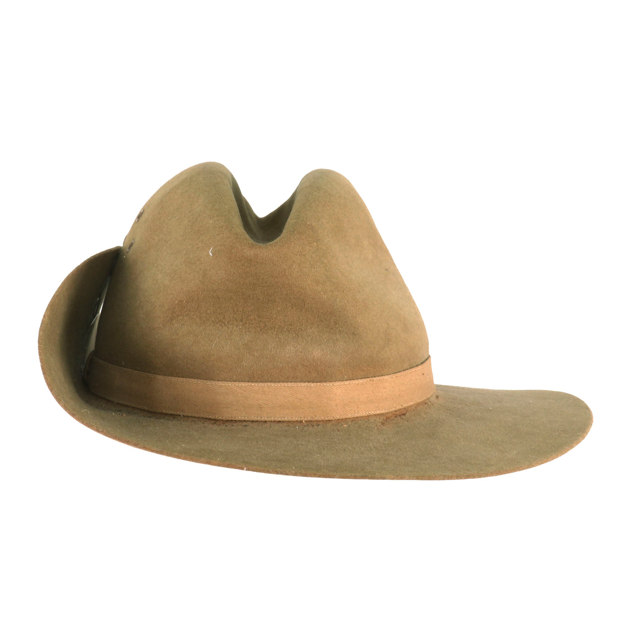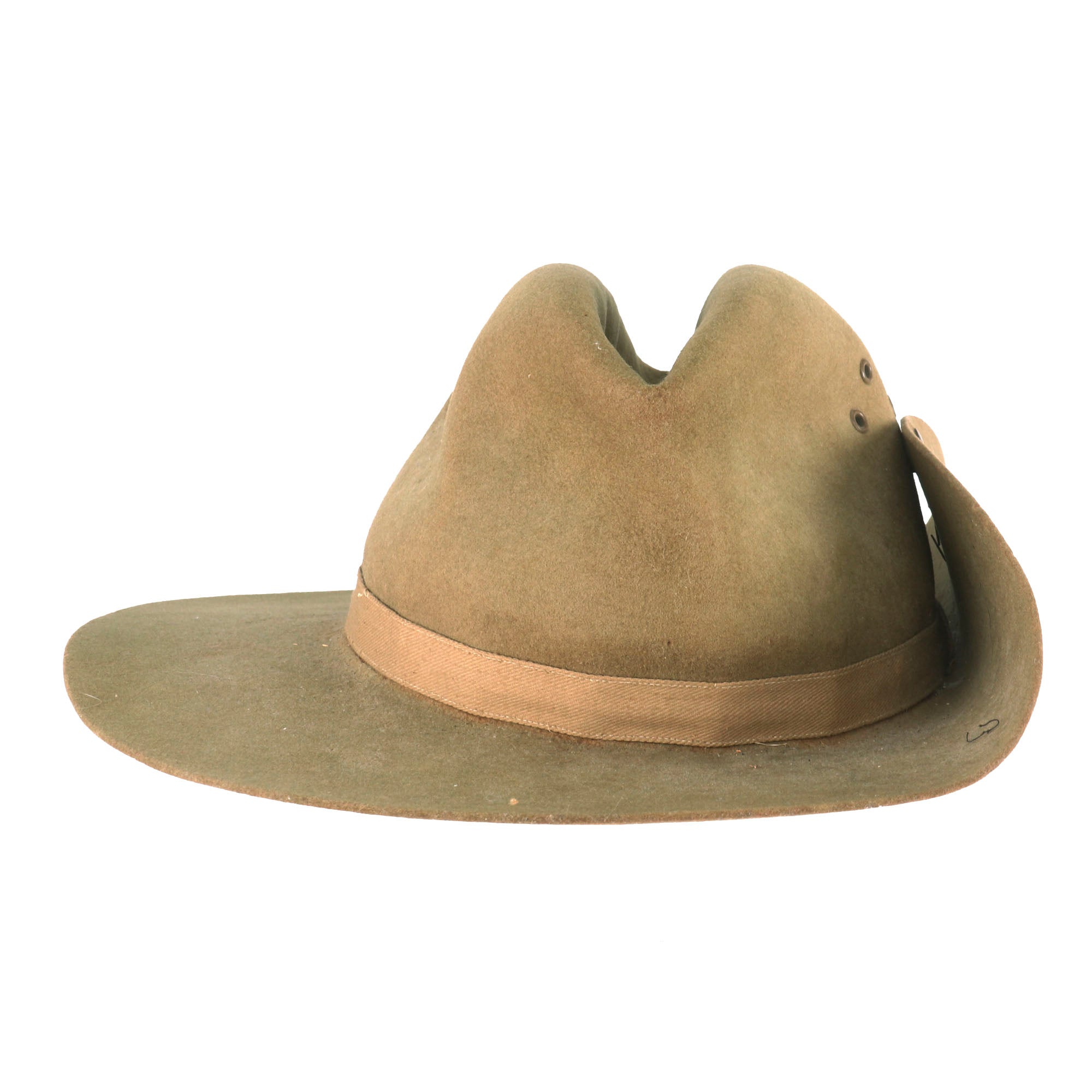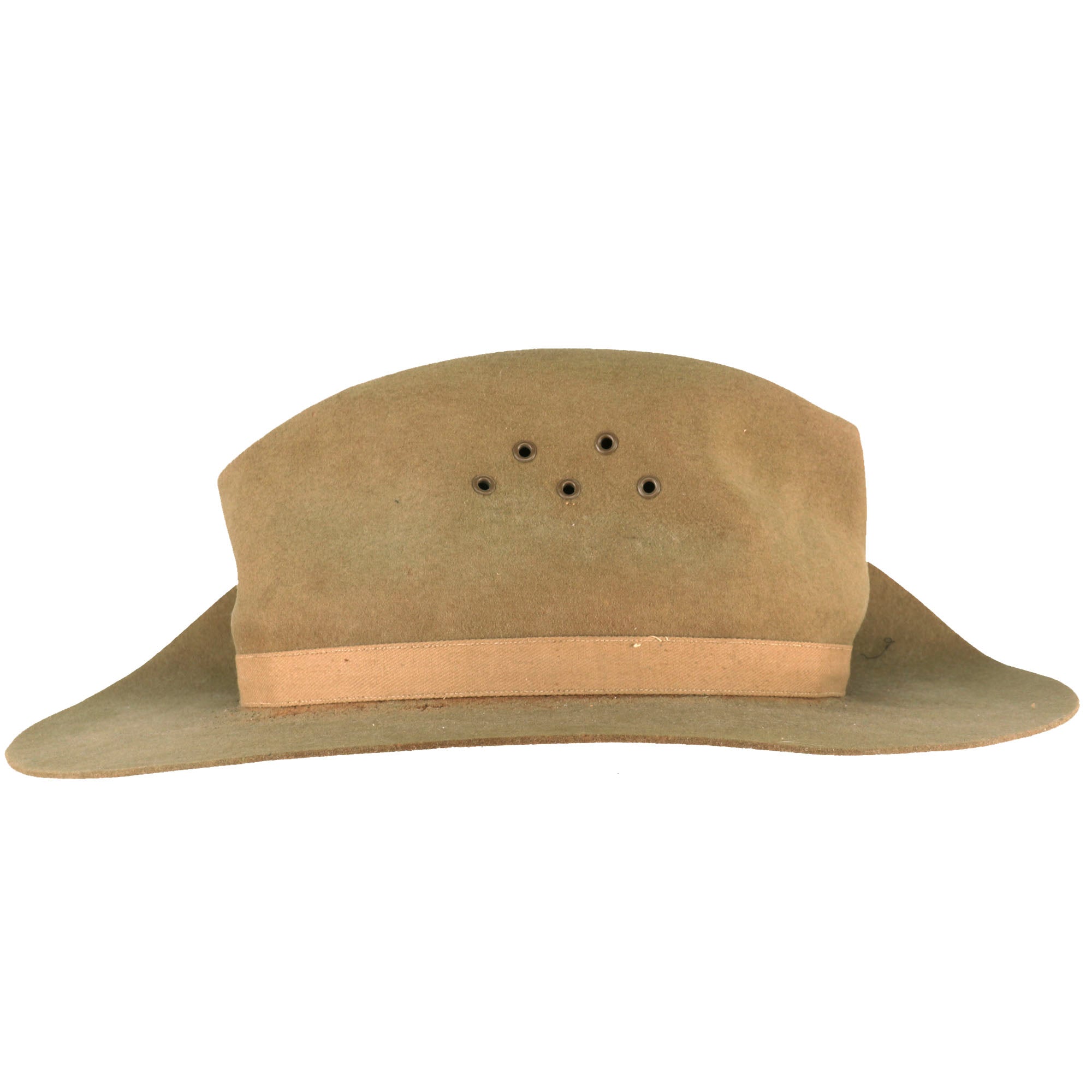 The Slouch Hat itself is in very nice condition, and still has the original khaki cloth headband around the circumference of the hat. It looks to originally have been a nice khaki color, however the upper side shows a bit of fading due to use. It has original ventilation holes on both sides at the edge of the crown and press stud fastener on the left side of the brim and skull. The hat has its original leather sweatband which is clearly stamped: