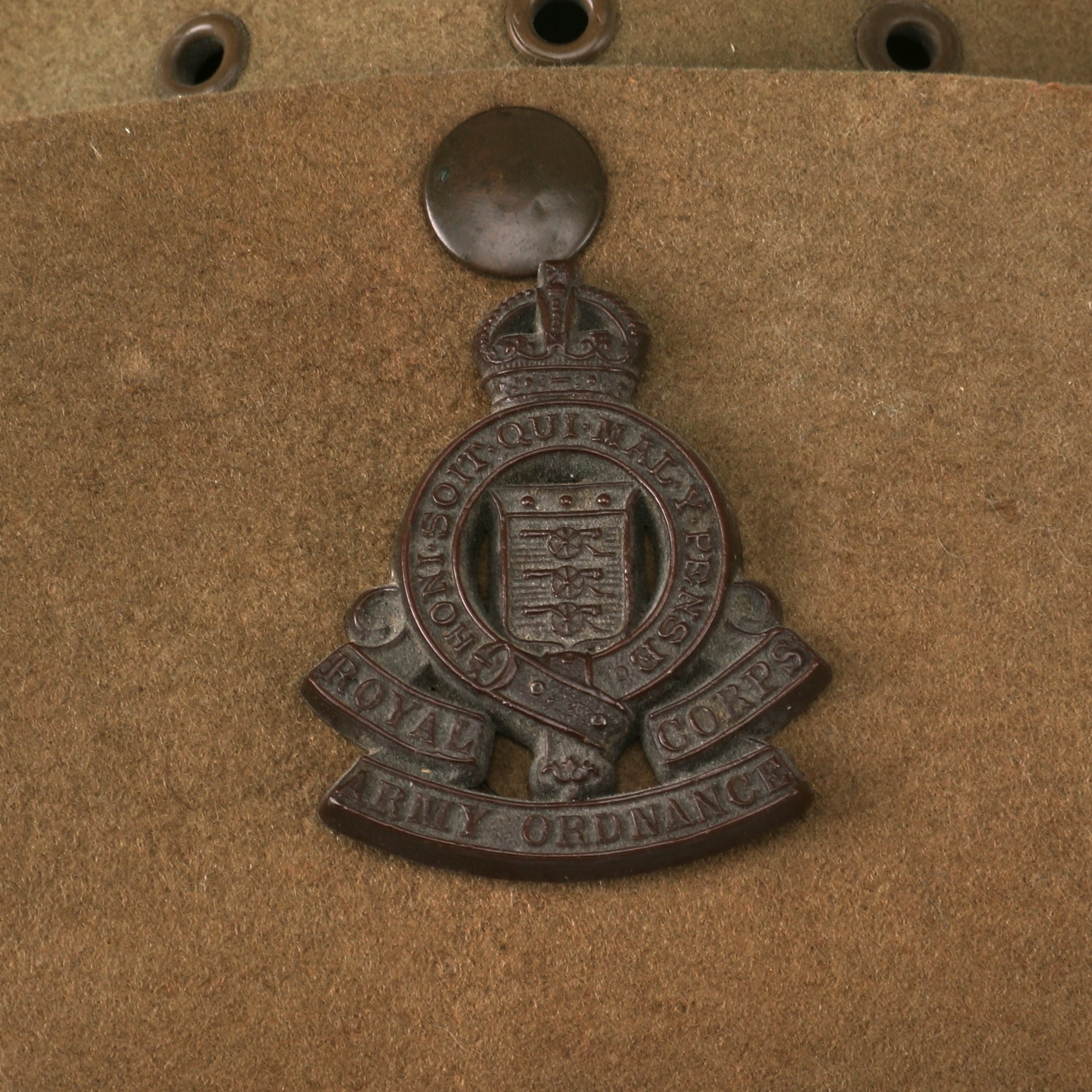 Original Item: Only One Available. This is an exceptionally rare WWII 1943 dated bush hat. The left side of the hat has a lovely plastic or bakelite Royal Army Ordnance Corps badge, which at the center shows a shield with three cannons surmounted by three cannon balls. This is surrounded by a "garter" reading HONI SOIT QUI MAL Y PENSE ("shame on anyone who thinks evil of it"), with a King's Crown on top. Underneath is a banner reading ROYAL ARMY ORDNANCE CORPS. It is attached by brass clips on the back, and shows no signs of having been added post WWII.