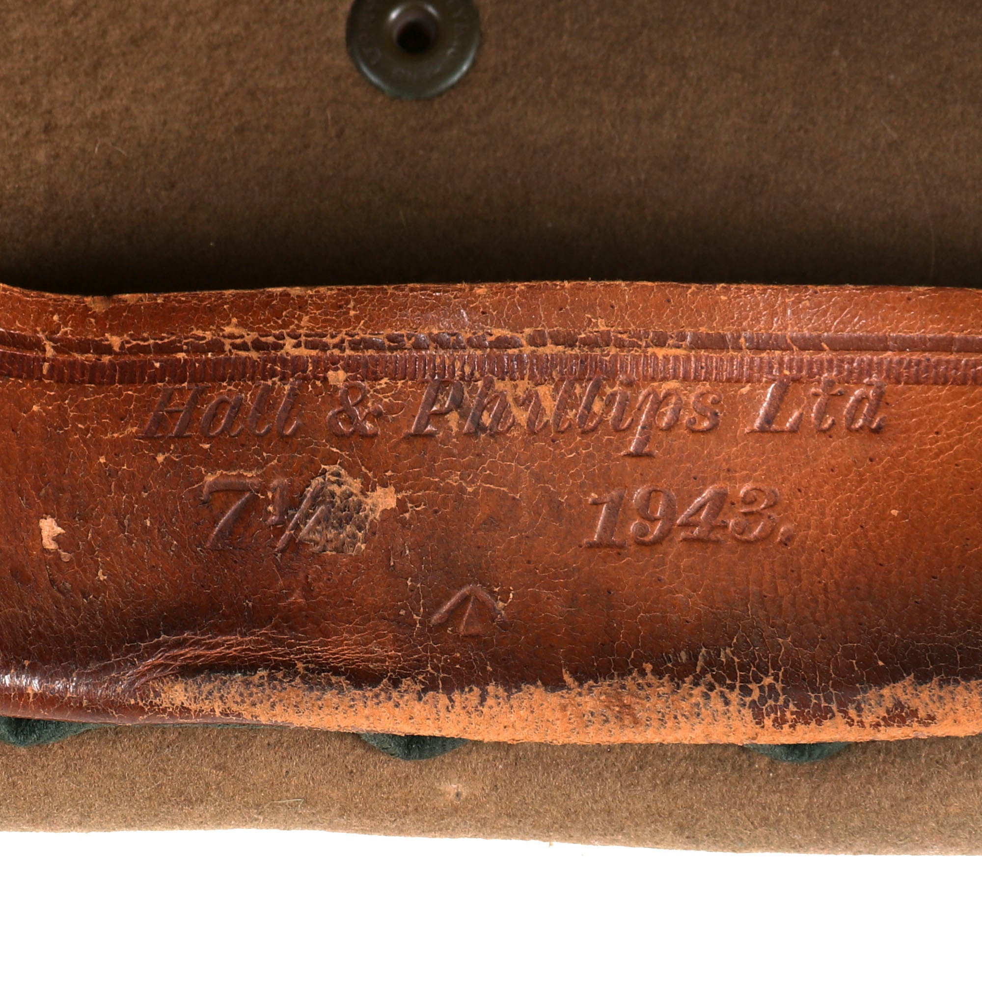 The cap definitely does show use, but is still in solid condition. There is just a bit of mothing on the top just under the trim band, and the leather liner definitely shows staining and use. The RAOC was involved in every theater of WWII, and these hats were quite popular in the East Asia region.
