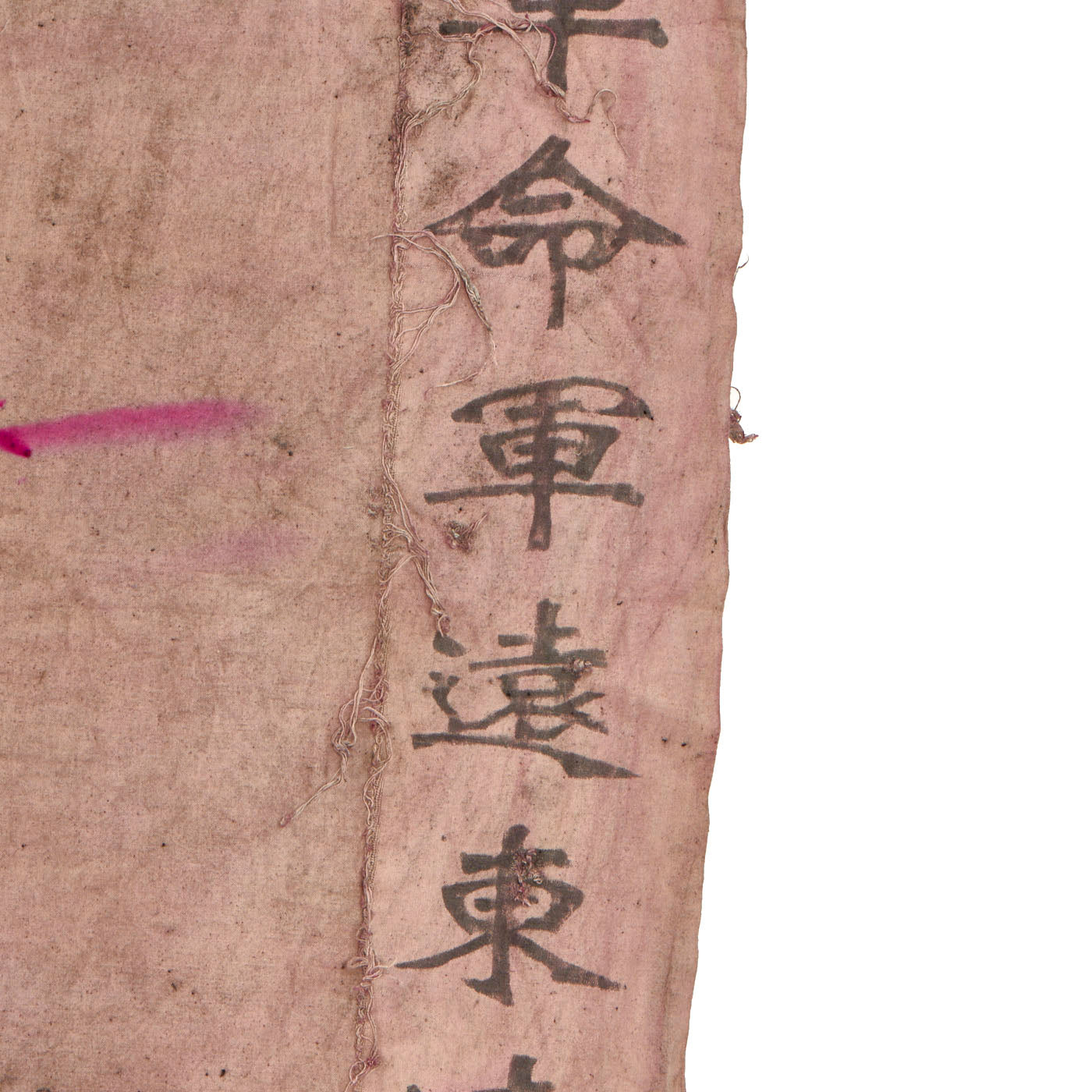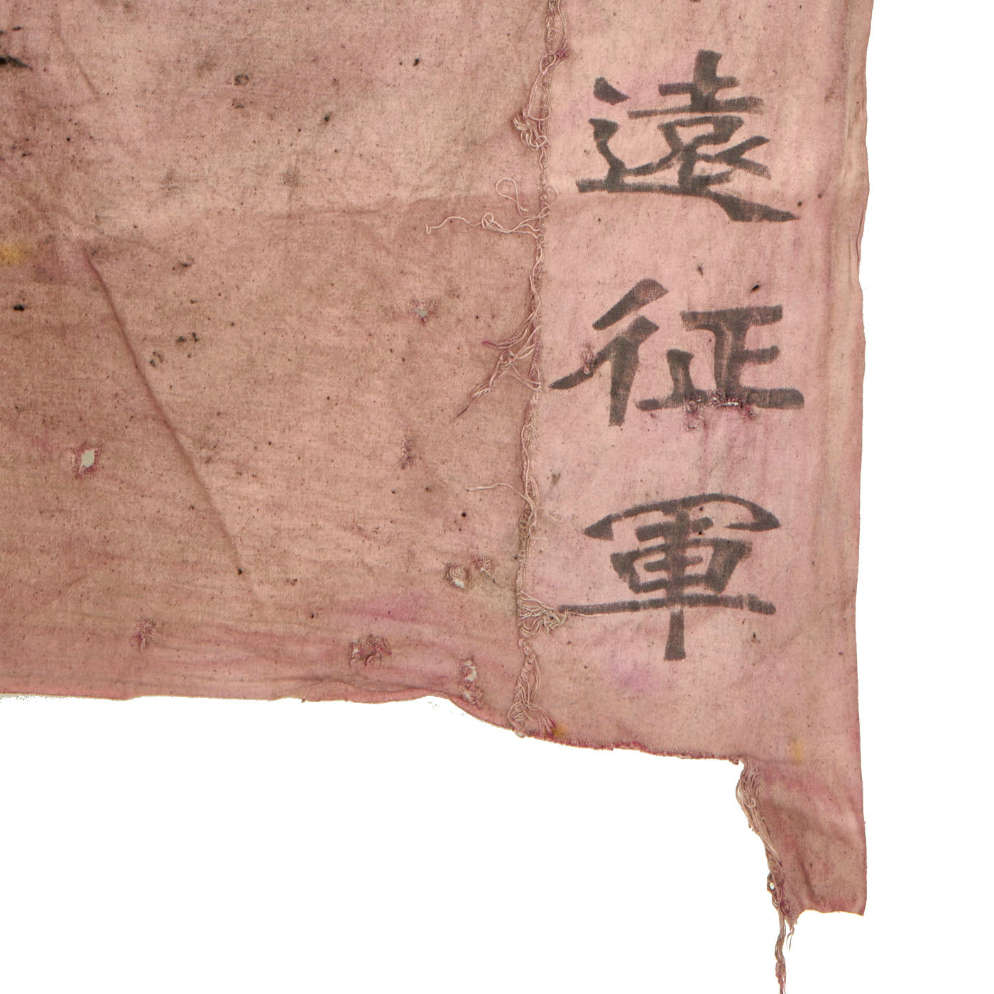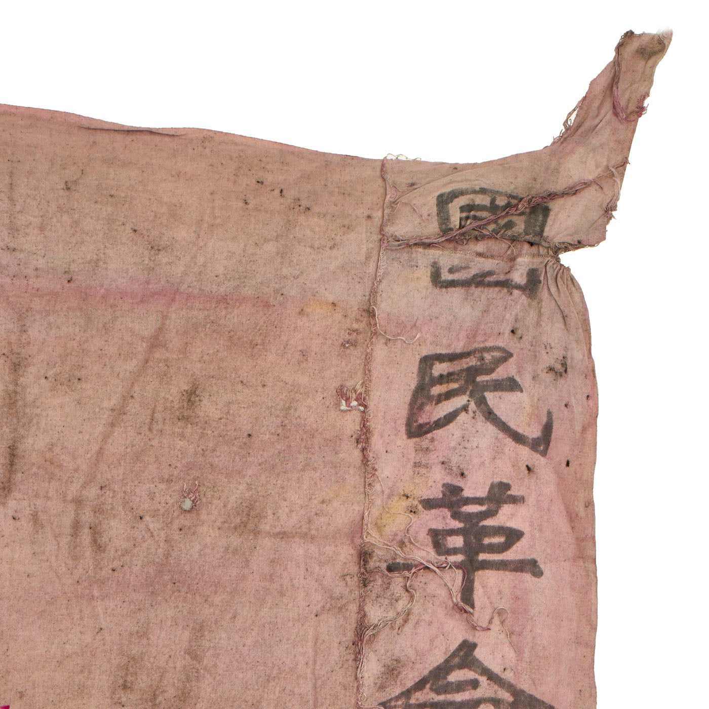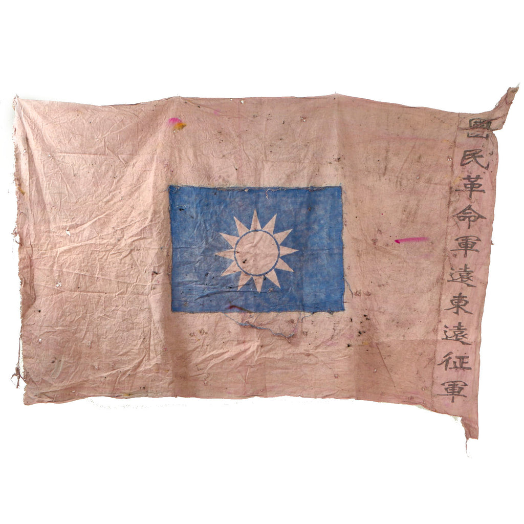 Original Item: Only One Available. This is a very rare original service worn Chinese National Revolutionary Army Flag, measuring a nice displayable 53" x 75". The flag is made from lightweight cotton canvas, and is a large formerly field with a blue insignia sewn onto one side in the middle. The header of the flag is printed / stamped with the following Chinese characters from top to bottom: 國 民 革 命 軍 遠 東 遠 征 軍 , which reads "National Revolutionary Army Far East Expeditionary Force".