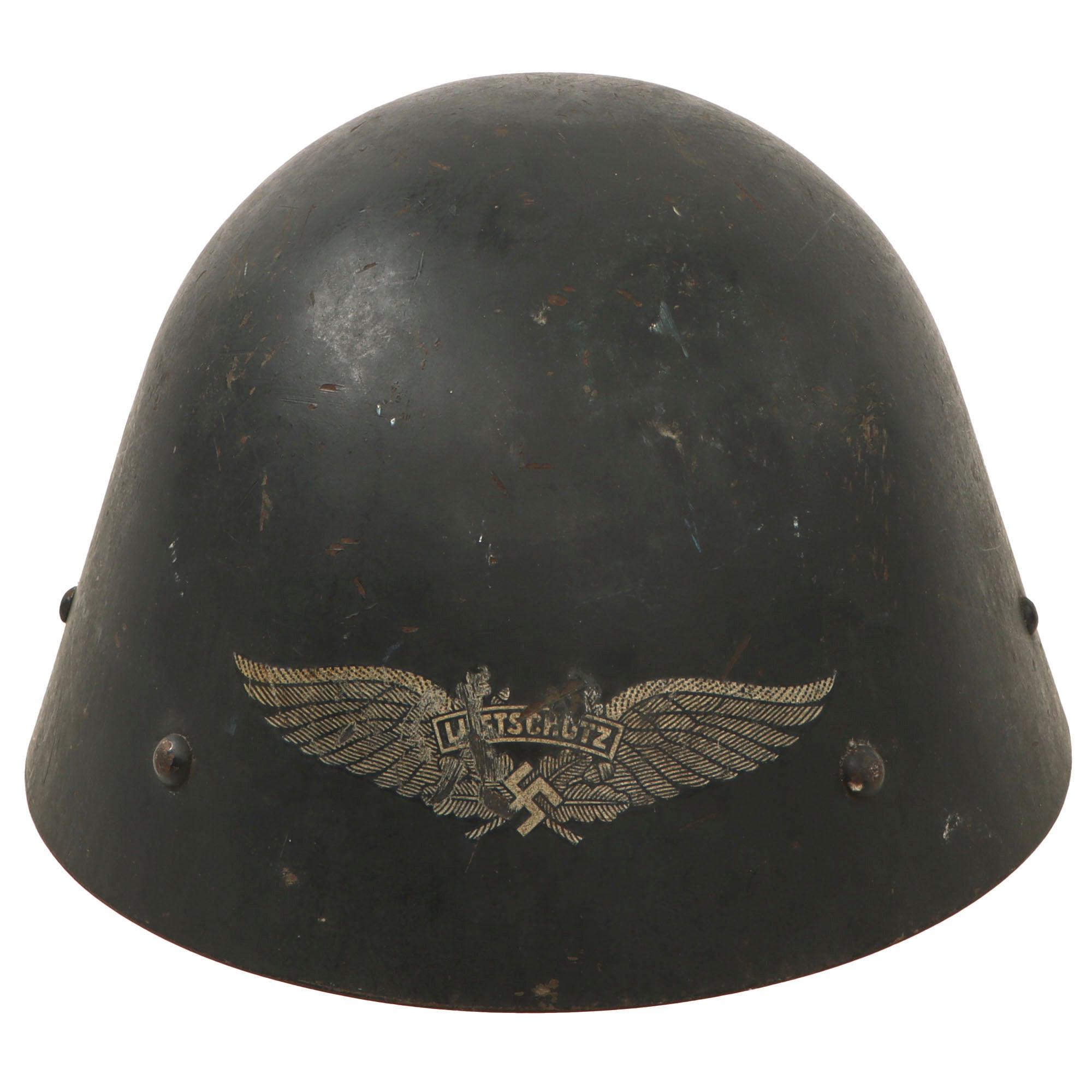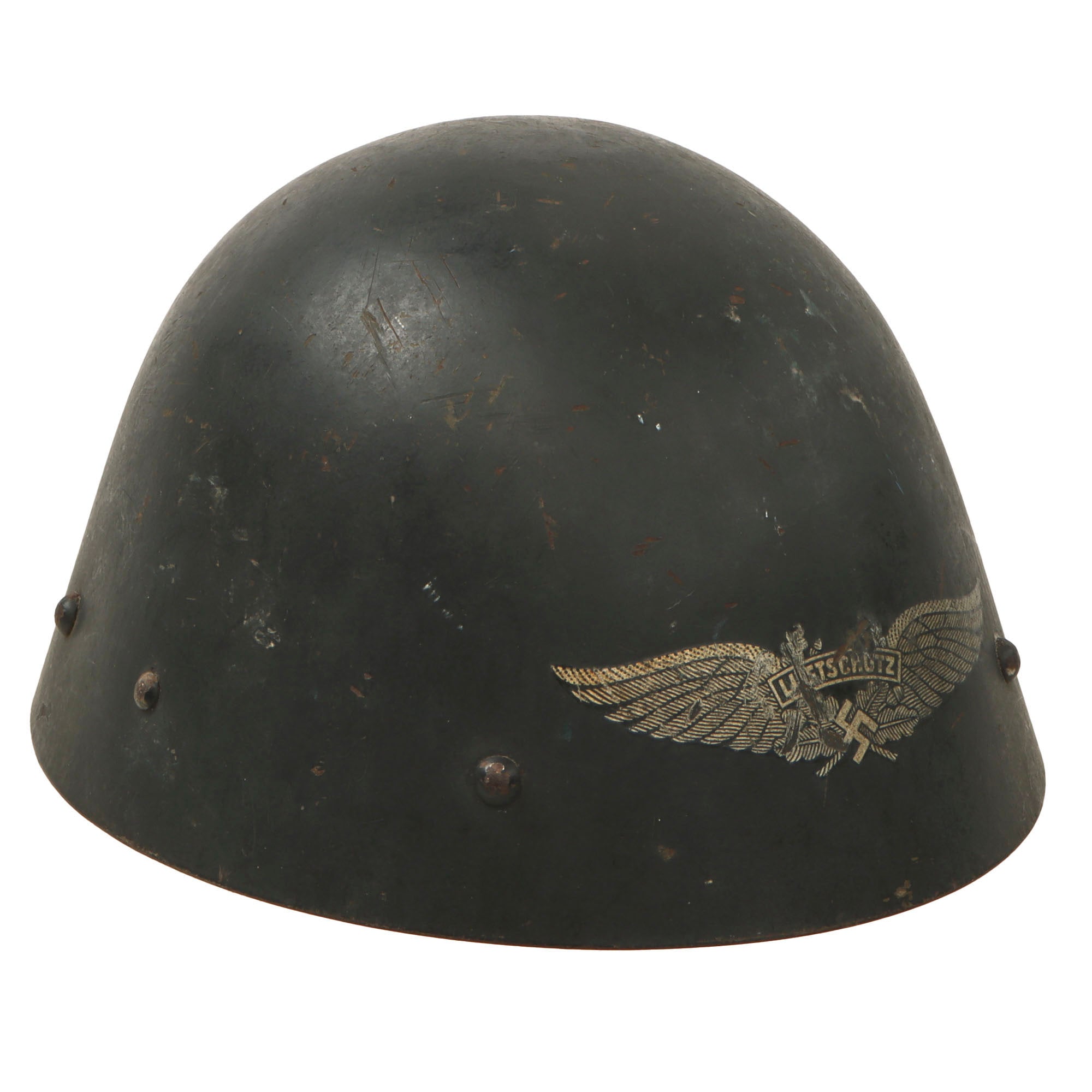 Original Item: Only One Available. This is something that is rarely seen! This is a very rare Pre-WWII Czechoslovakian Vz32 Steel helmet, sometimes known as the M32, M34, Vz32/34, and other designations. After the Munich Agreement, Czechoslovakia was virtually handed over to Germany, and occupied. Their helmets and technology were then put in the service of NSDAP Germany, including many of their helmets. This particular Vz32 helmet was pressed into service with the German Reichsluftschutzbund (RLB) (National Air Raid Protection League). It was painted the standard blue color of Luftschutz helmets, and had the large Luftschutz decal applied to the front. These are very rare, we have only had a few examples previously.
