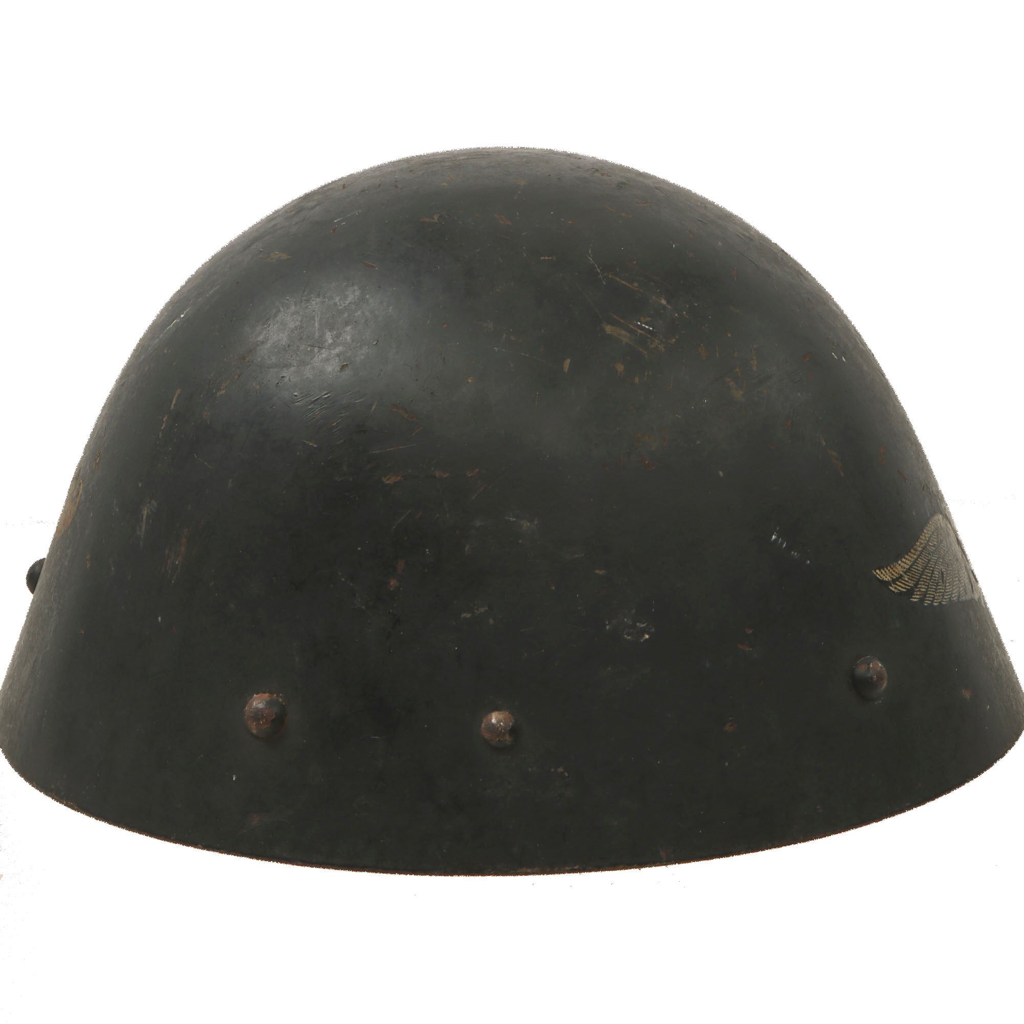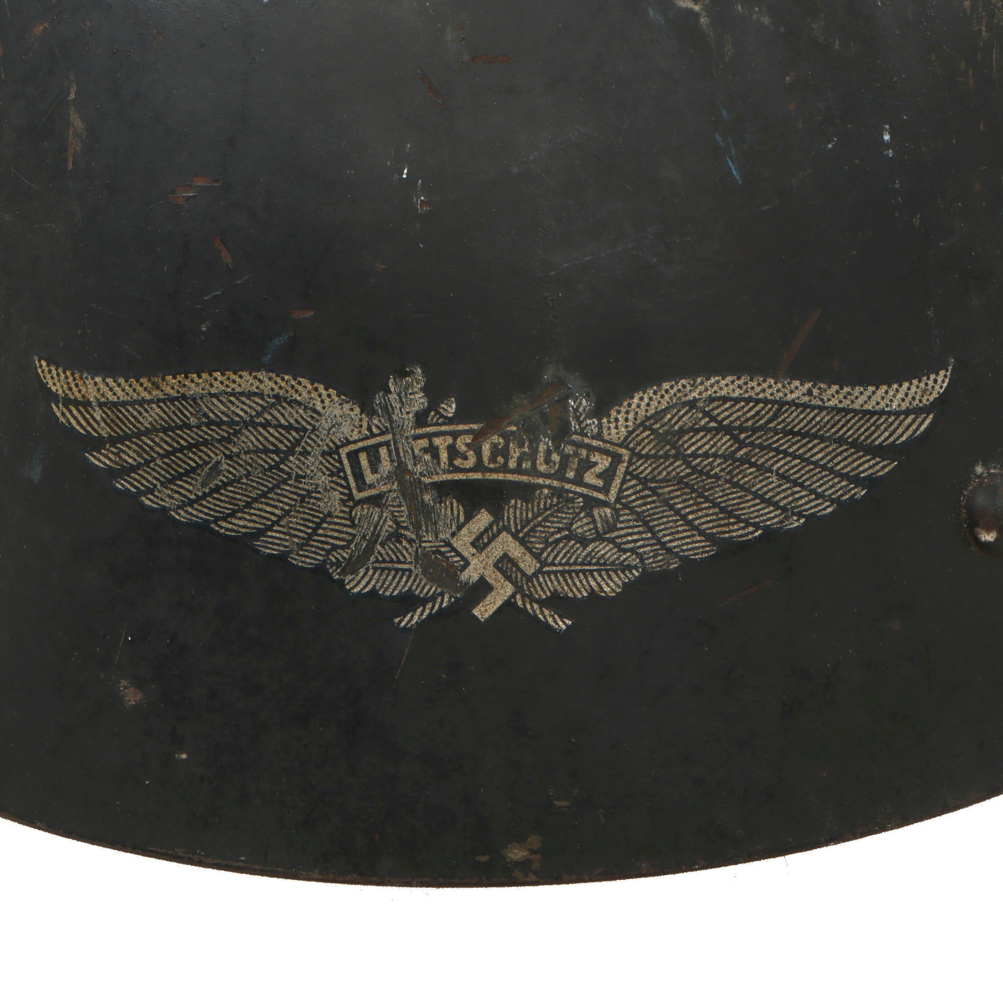 Most Vz32 helmets were refurbished post war, making this a rare find. The exterior shell retains about 85% of the Luftschutz blue gray paint, with scuffs, scratches, and chips. The decal is retained at almost 75%, with some heavy scuffs in the center. The painted insignia to the side is in great shape. Really a very nice example of a rare helmet, ready to display!