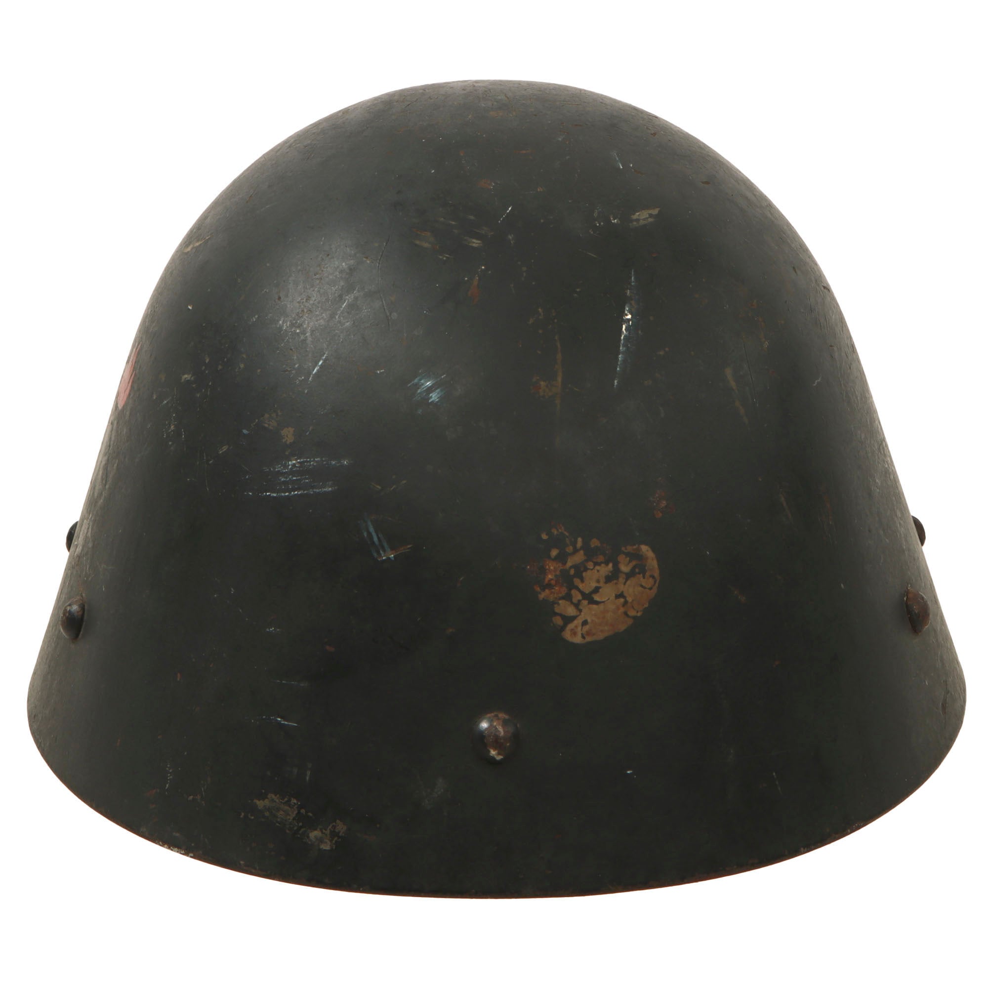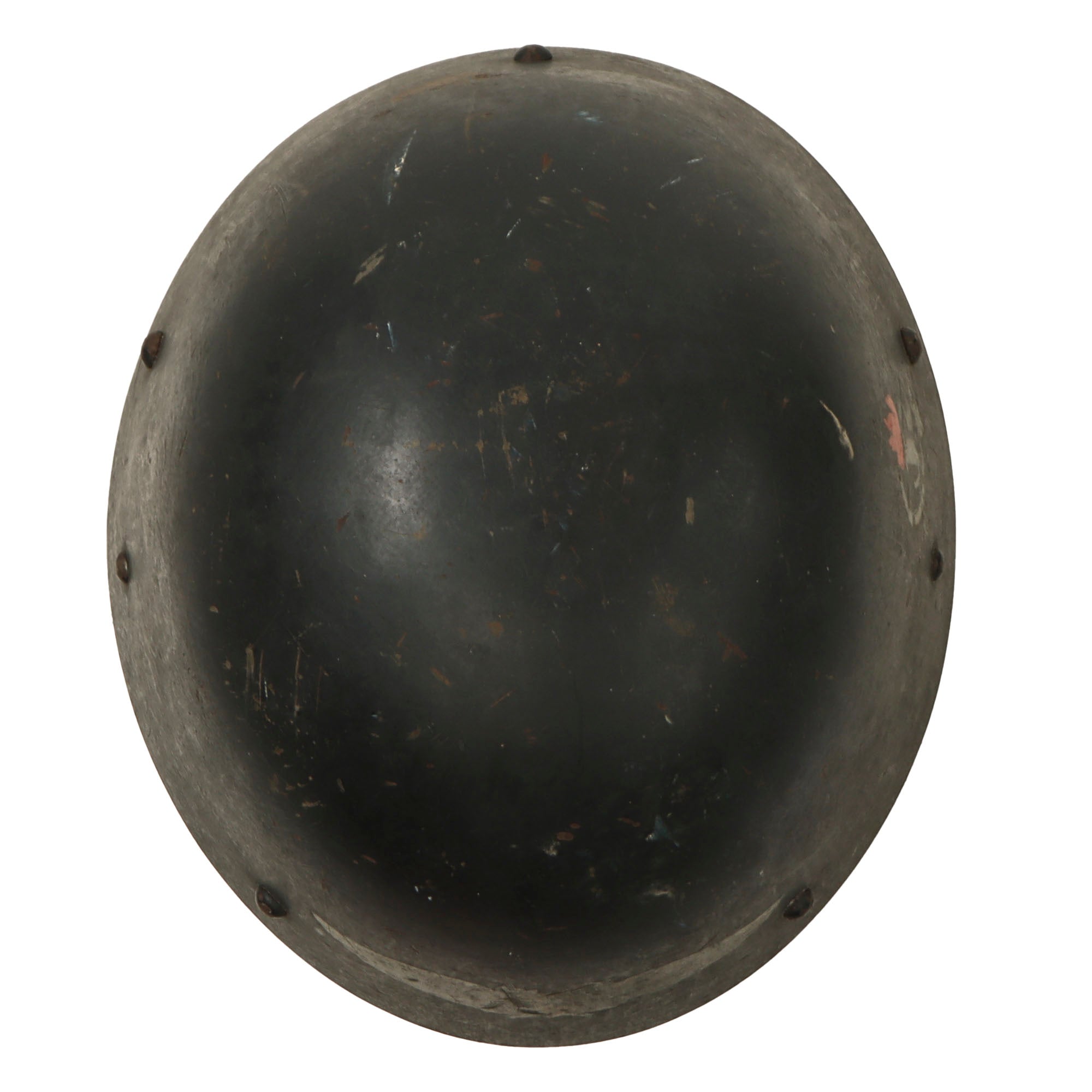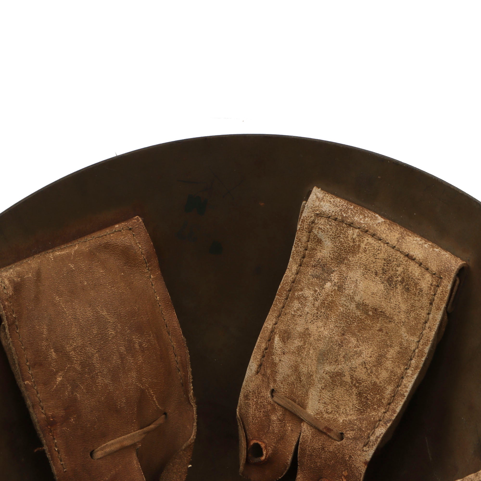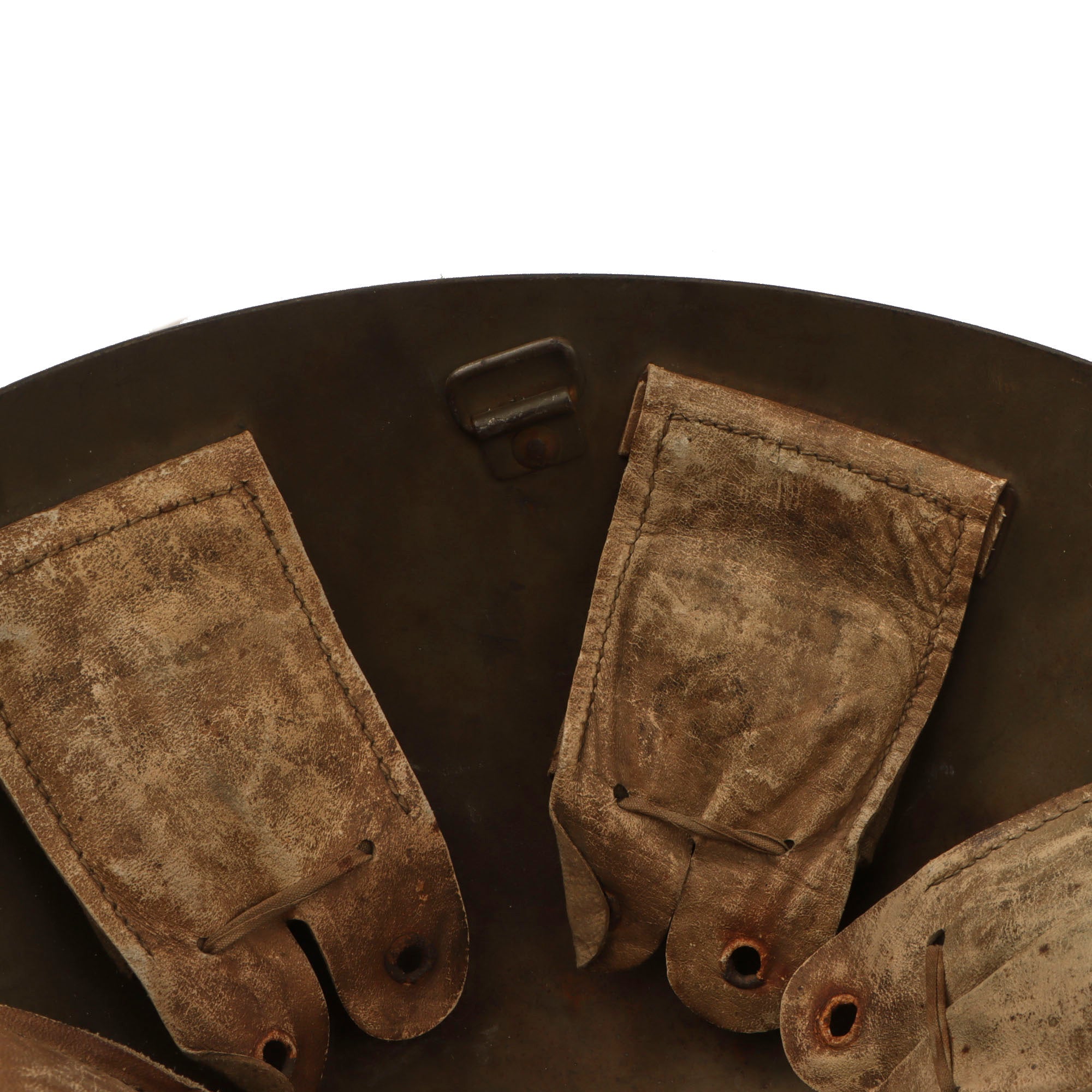 The Vz32 shell is "egg-shell" shaped, unlike many helmets of the day, which had pronounced contouring, front brims, etc. It has a unique 5 pad liner system, which utilizes 5 discrete pads that are riveted to the shell, along with a standard heavy leather split chinstrap attached on bales that are riveted directly to the shell.