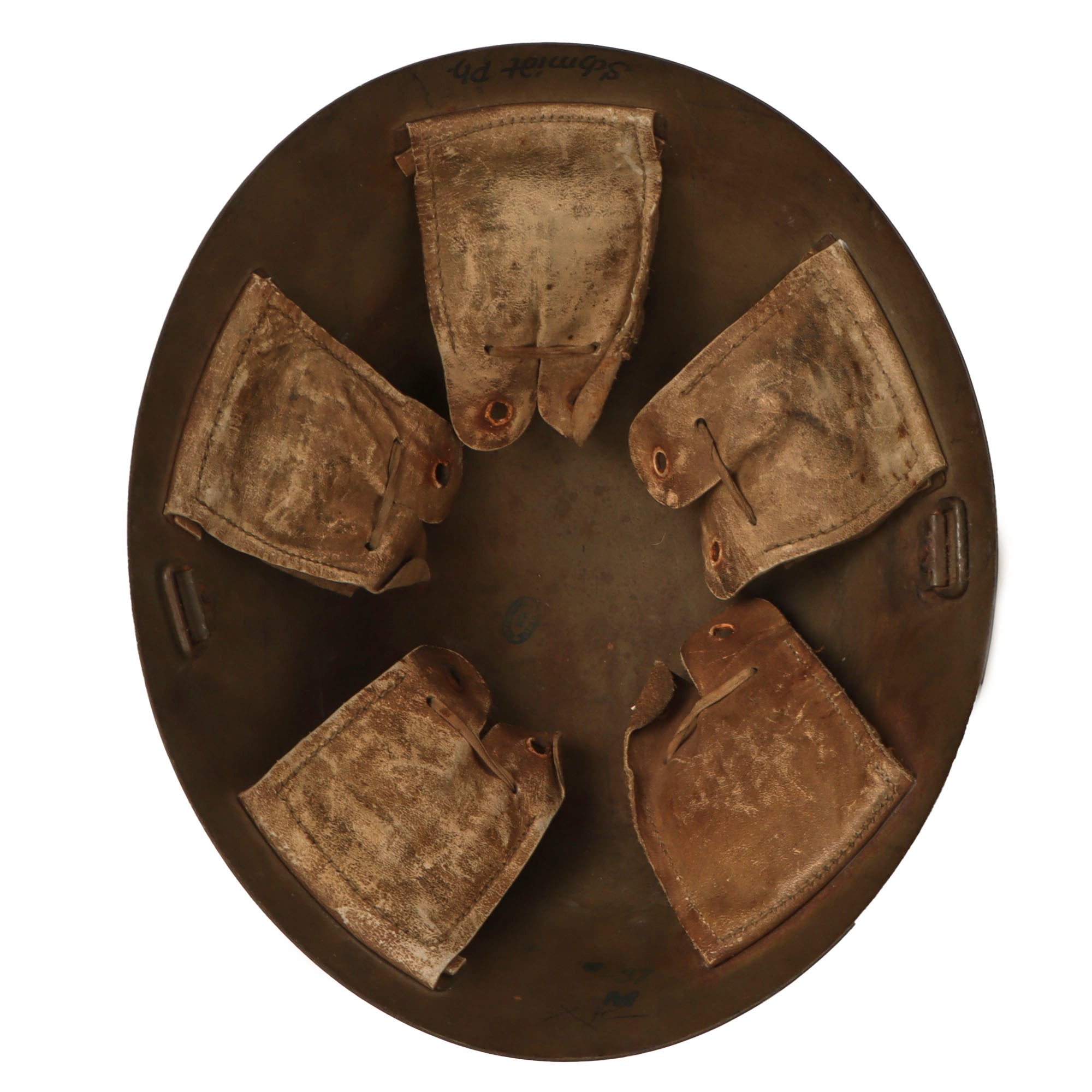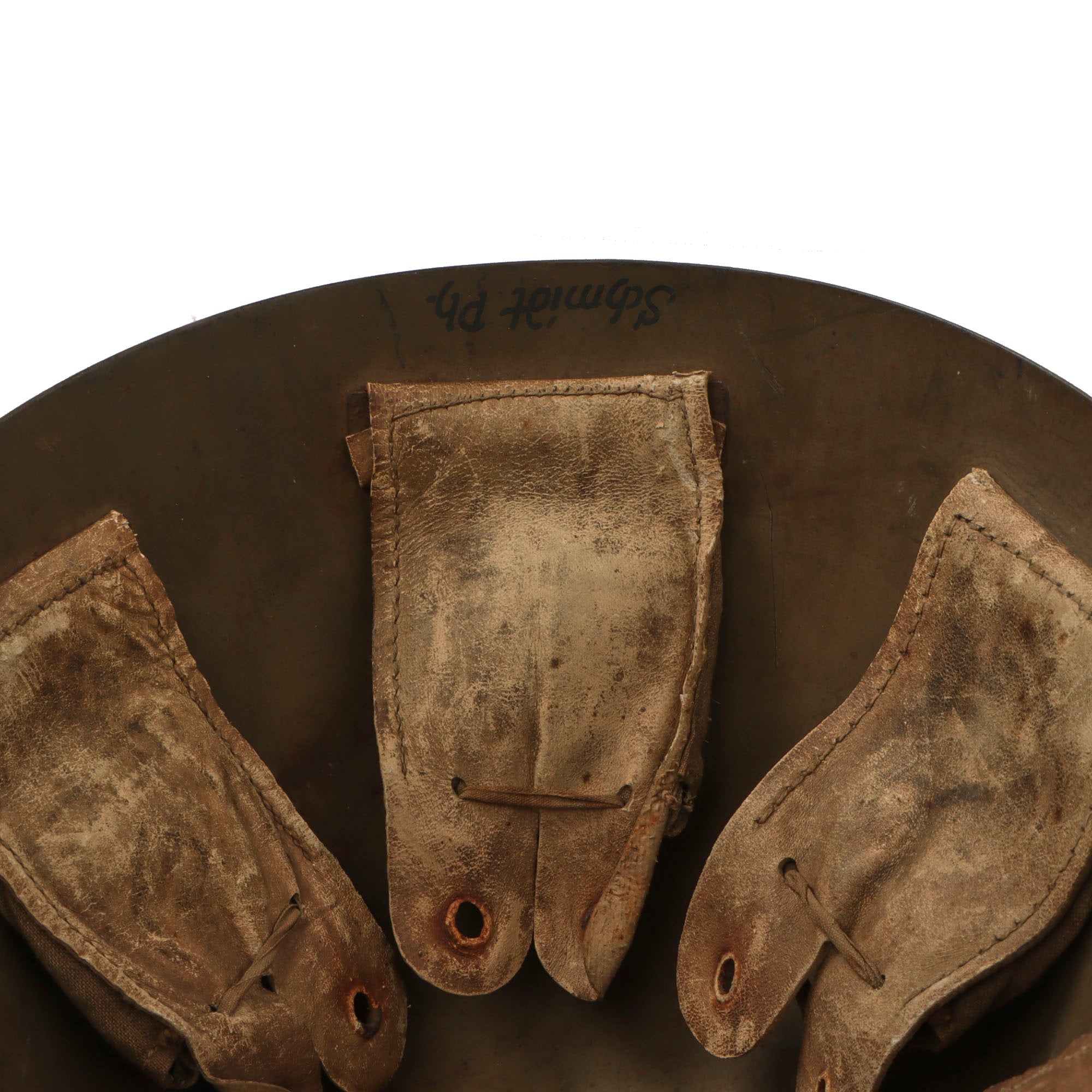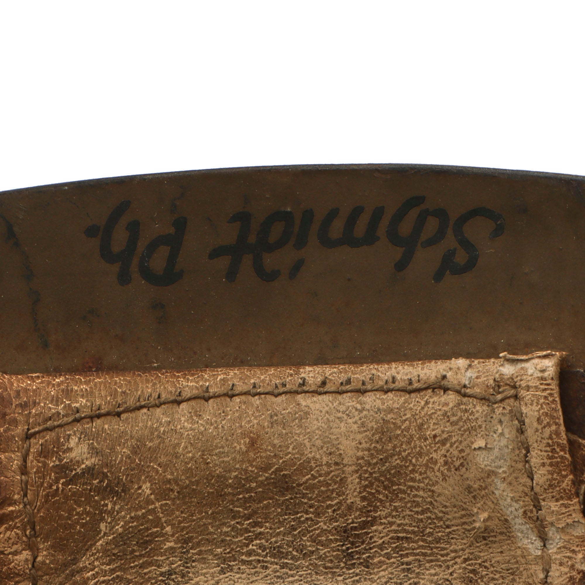 This helmet is set up in Luftschutz configuration, with blue paint and a decal on the outside. The left side of the helmet has a very interesting marking looking to be a combined JR in a stenciled circle with a red flame over the letters. We could not identify this unit, making for a good research project. The inside still features the original olive paint and the original liner, but the chinstrap is entirely gone. However we can still make out a faint maker’s cartouche reading SCHOLTZ / 1935 / MATEJOVCE, which denotes manufacture by C.A. Scholtz in Matejovce, which is today located in Slovakia. The other markings include -37 / -M, and the rear brim of the helmet is inscribed with the name Schmidt Ph..