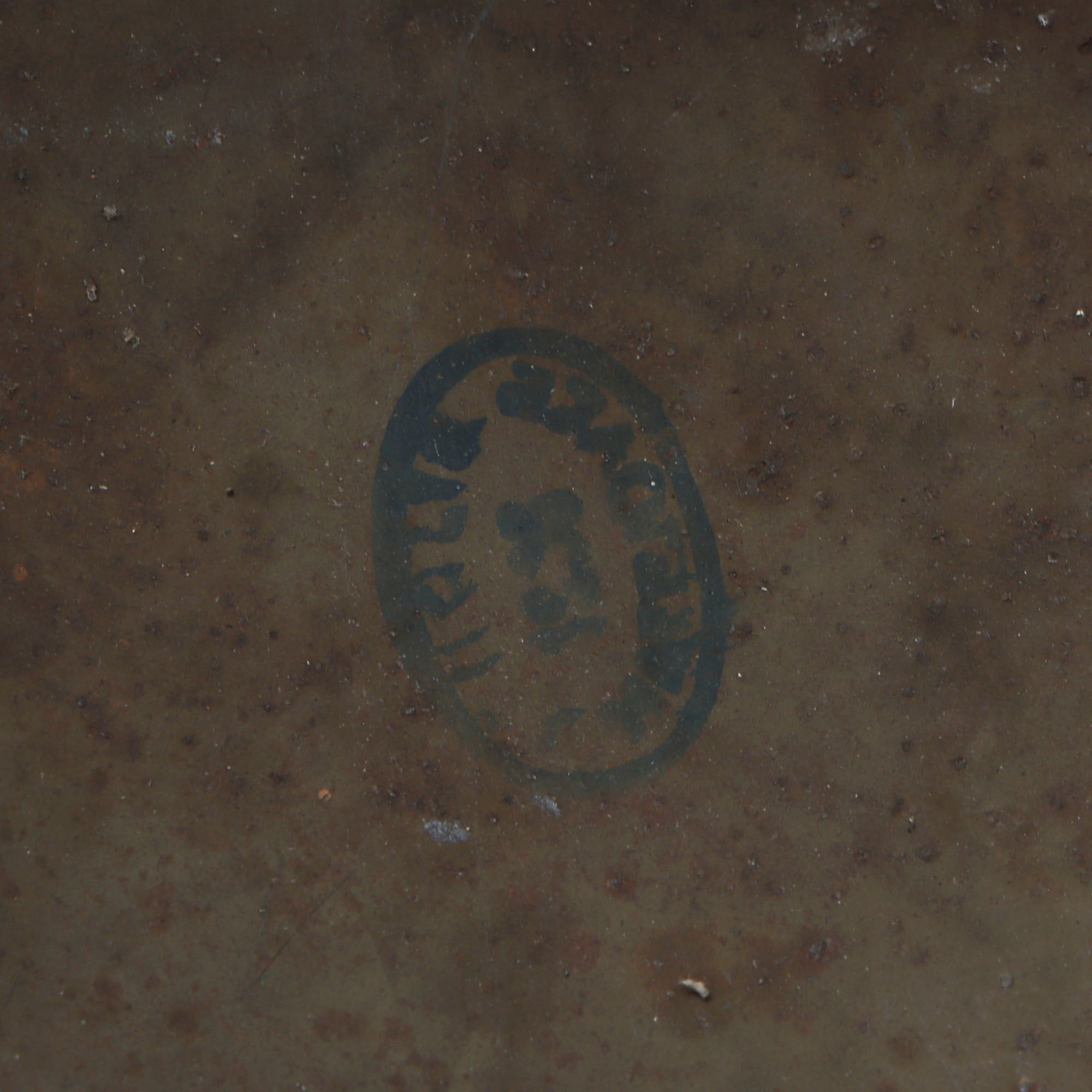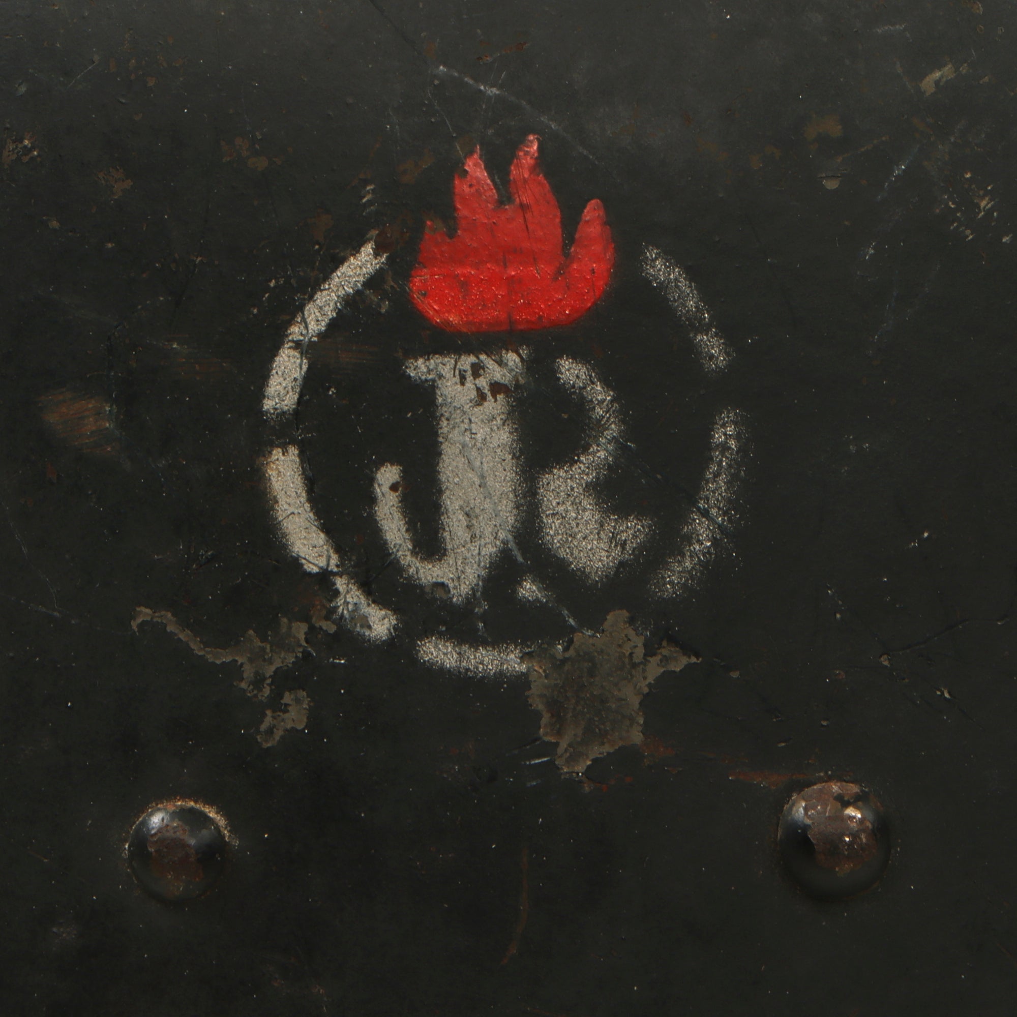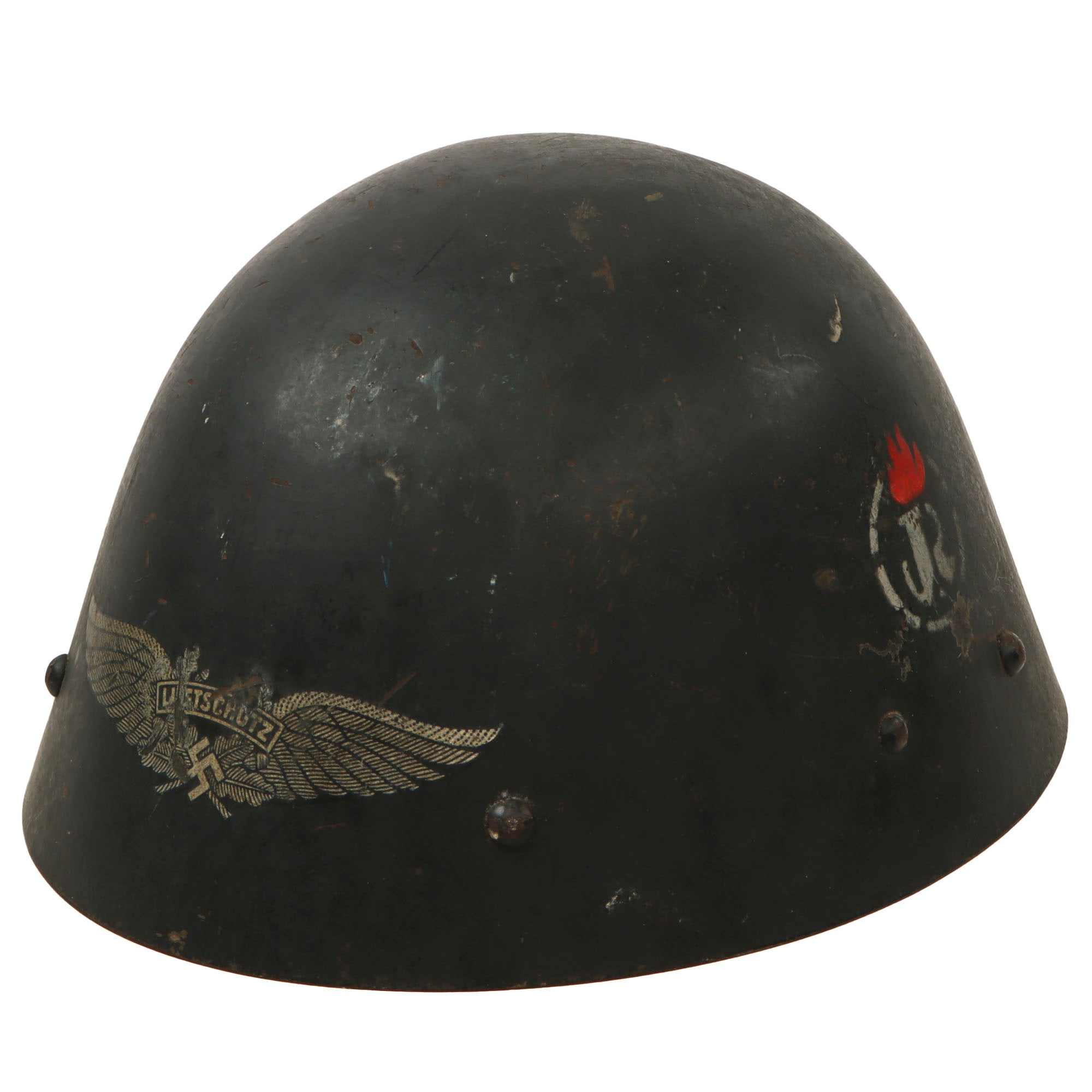 This helmet is set up in Luftschutz configuration, with blue paint and a decal on the outside. The left side of the helmet has a very interesting marking looking to be a combined JR in a stenciled circle with a red flame over the letters. We could not identify this unit, making for a good research project. The inside still features the original olive paint and the original liner, but the chinstrap is entirely gone. However we can still make out a faint maker’s cartouche reading SCHOLTZ / 1935 / MATEJOVCE, which denotes manufacture by C.A. Scholtz in Matejovce, which is today located in Slovakia. The other markings include -37 / -M, and the rear brim of the helmet is inscribed with the name Schmidt Ph..
