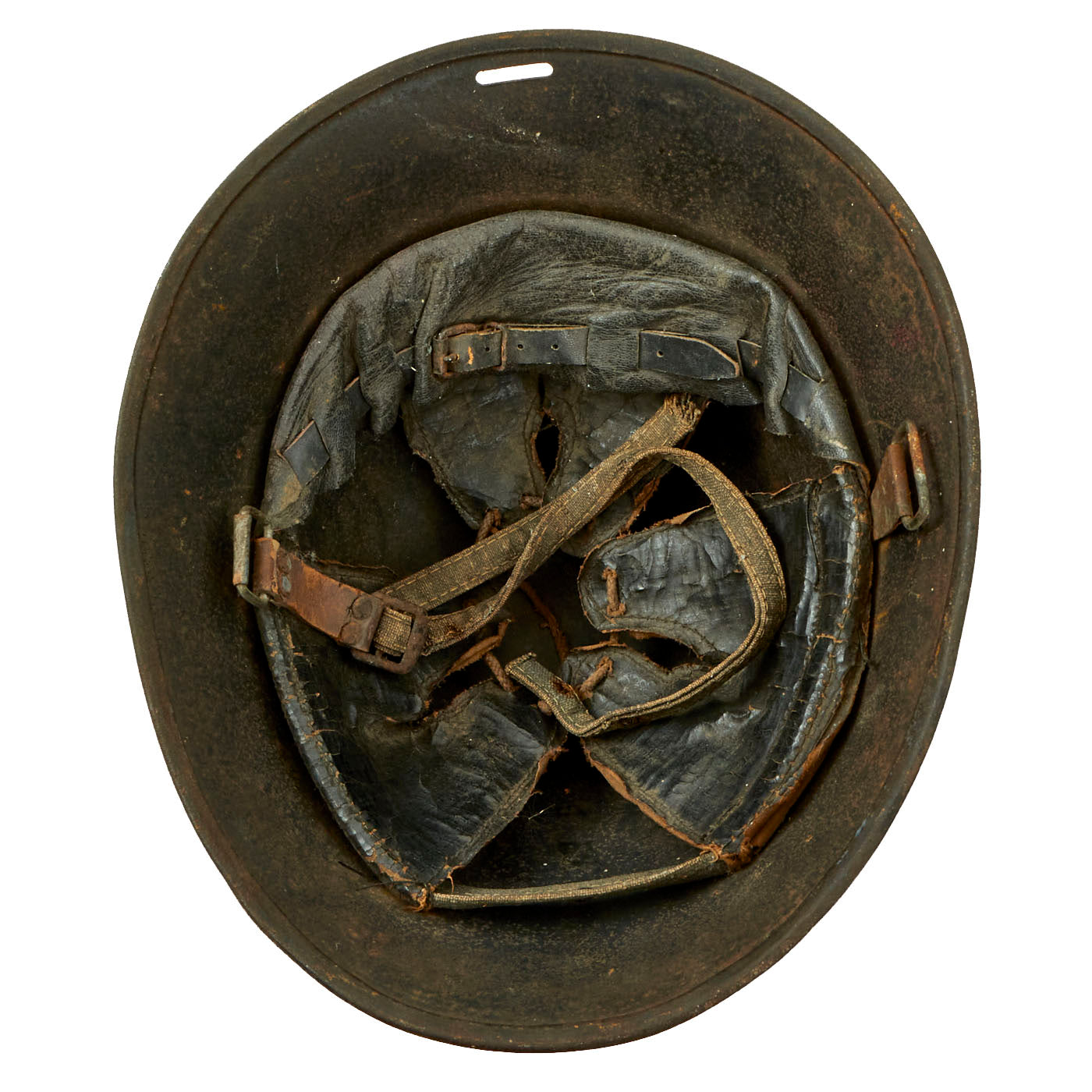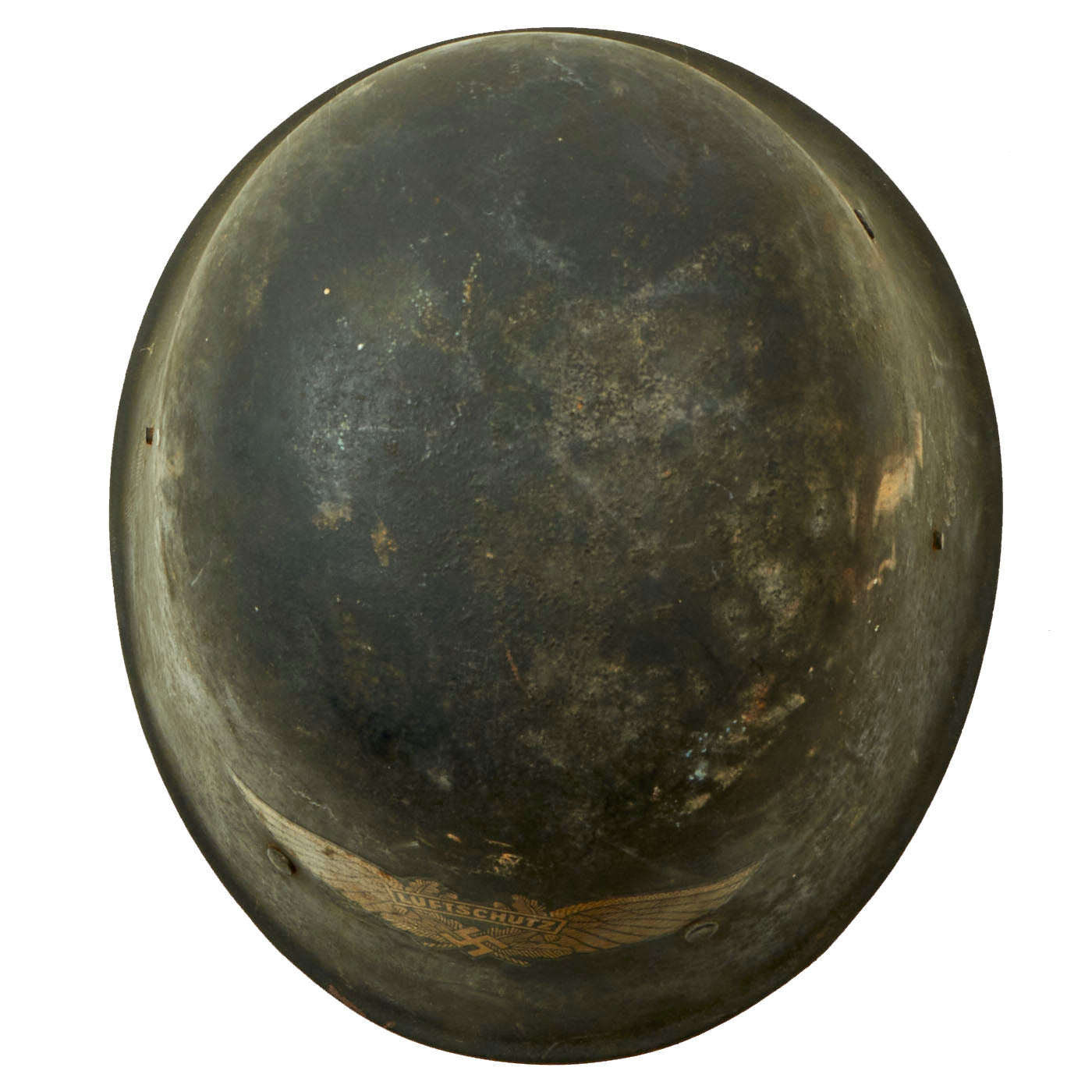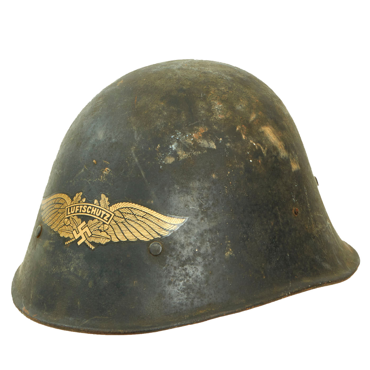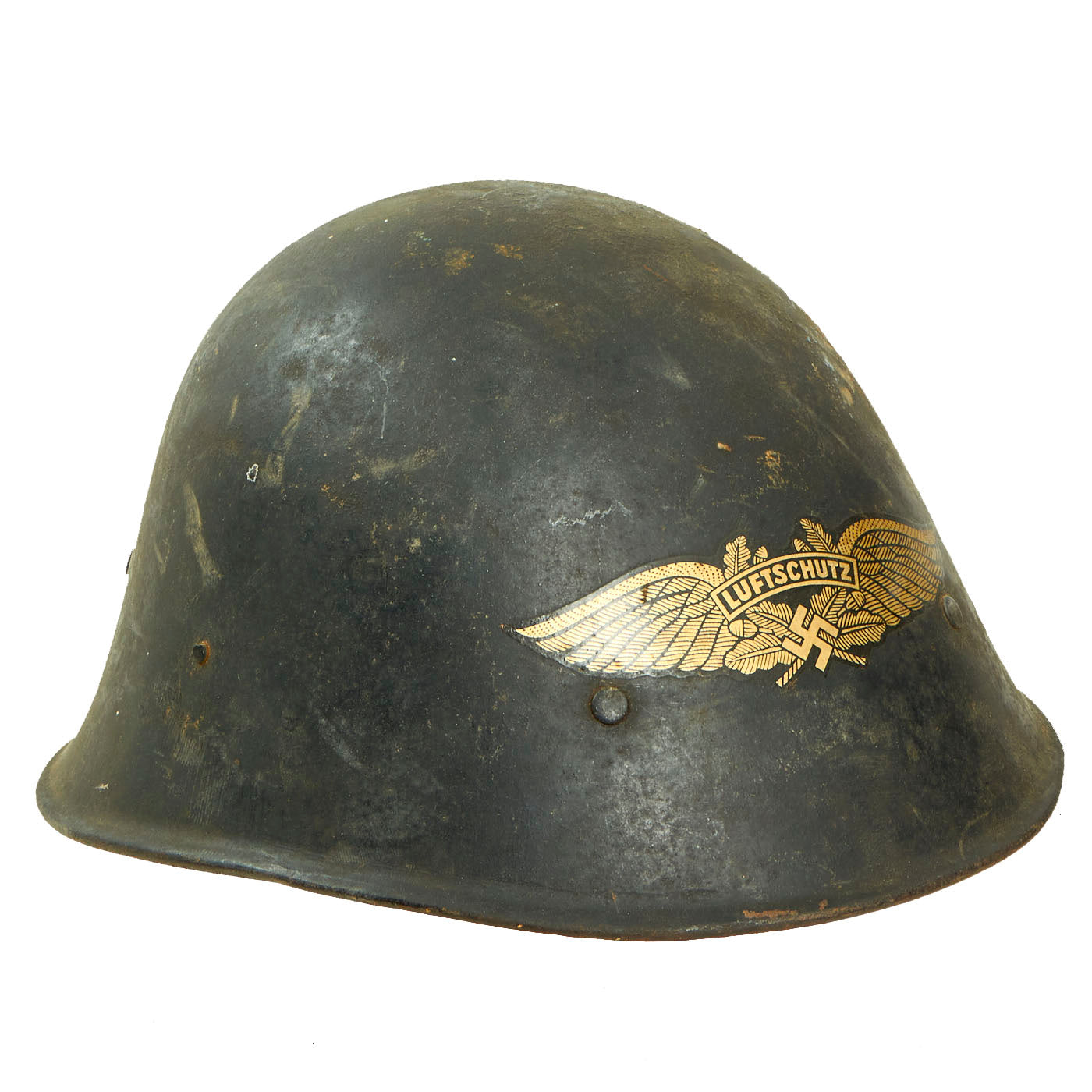 Original Item: Only One Available. This is the second example of this we have ever had the pleasure of offering! This is a very rare Pre-WWII Dutch M-1934 Steel helmet. Like other conquered territories, their countries military material and technology were then put in the service of NSDAP Germany, including many of their helmets. This particular M-34 helmet was pressed into service with the German Reichsluftschutzbund (RLB) (National Air Raid Protection League). In addition, a large LUFTSCHUTZ decal was applied to the front. The oil cloth type liner is present but in relatively rough condition, and the Luftschutz decal is nearly retained at 100 percent. Despite the drawbacks, these are very rare, and this is the second example we have had.