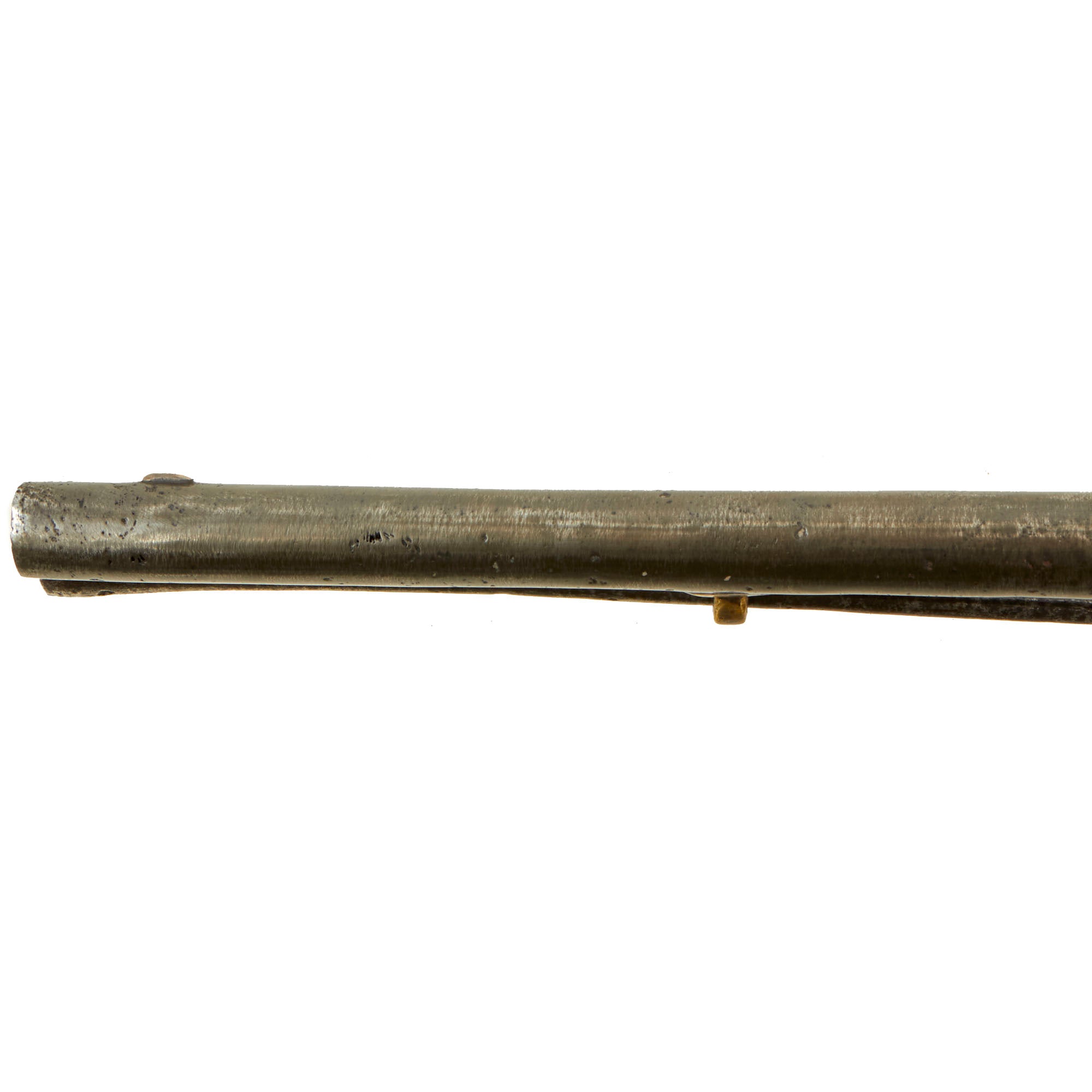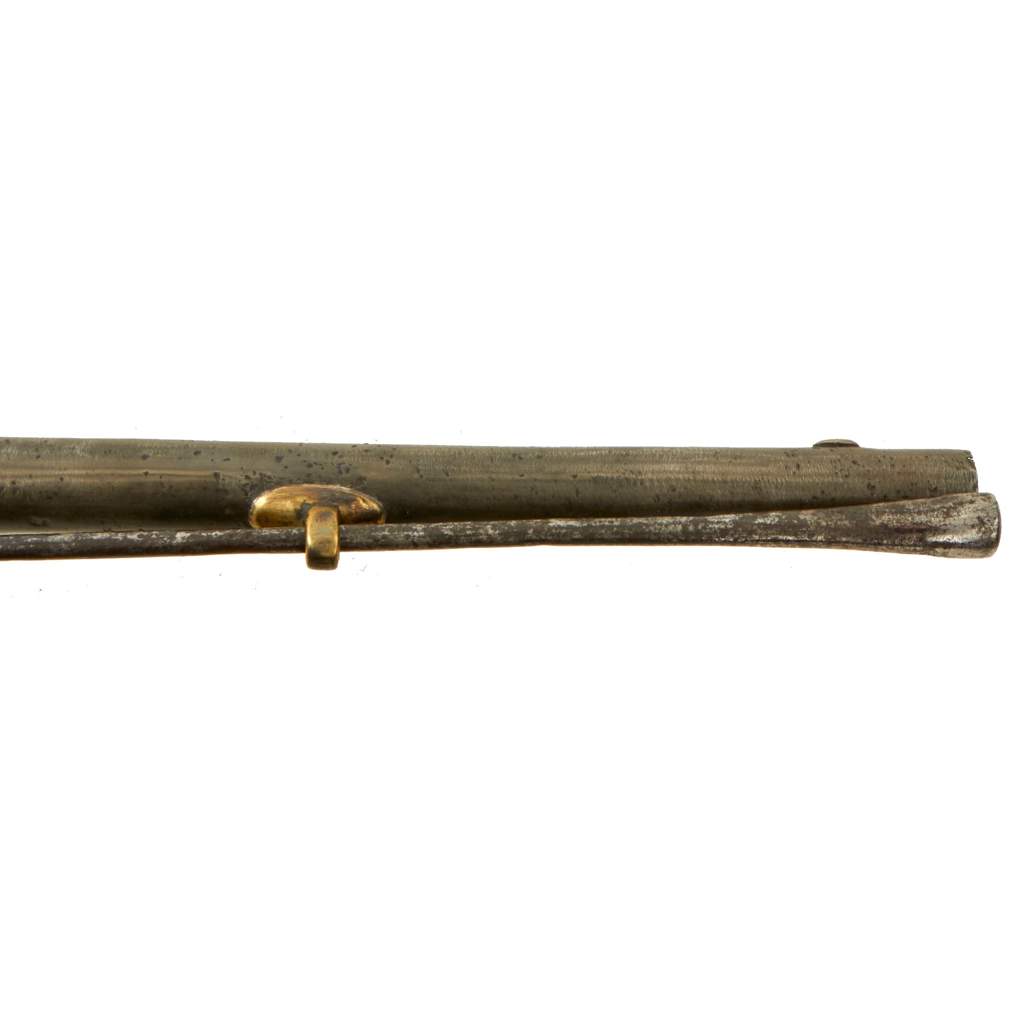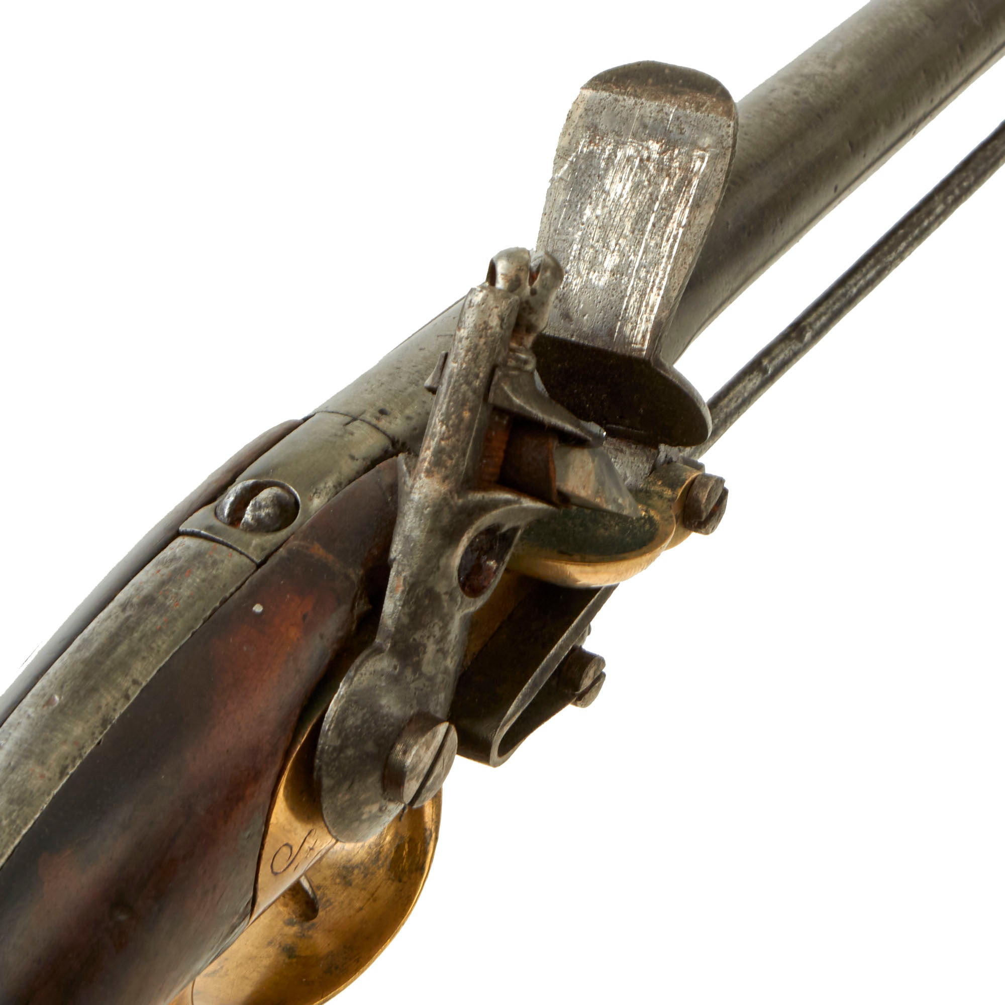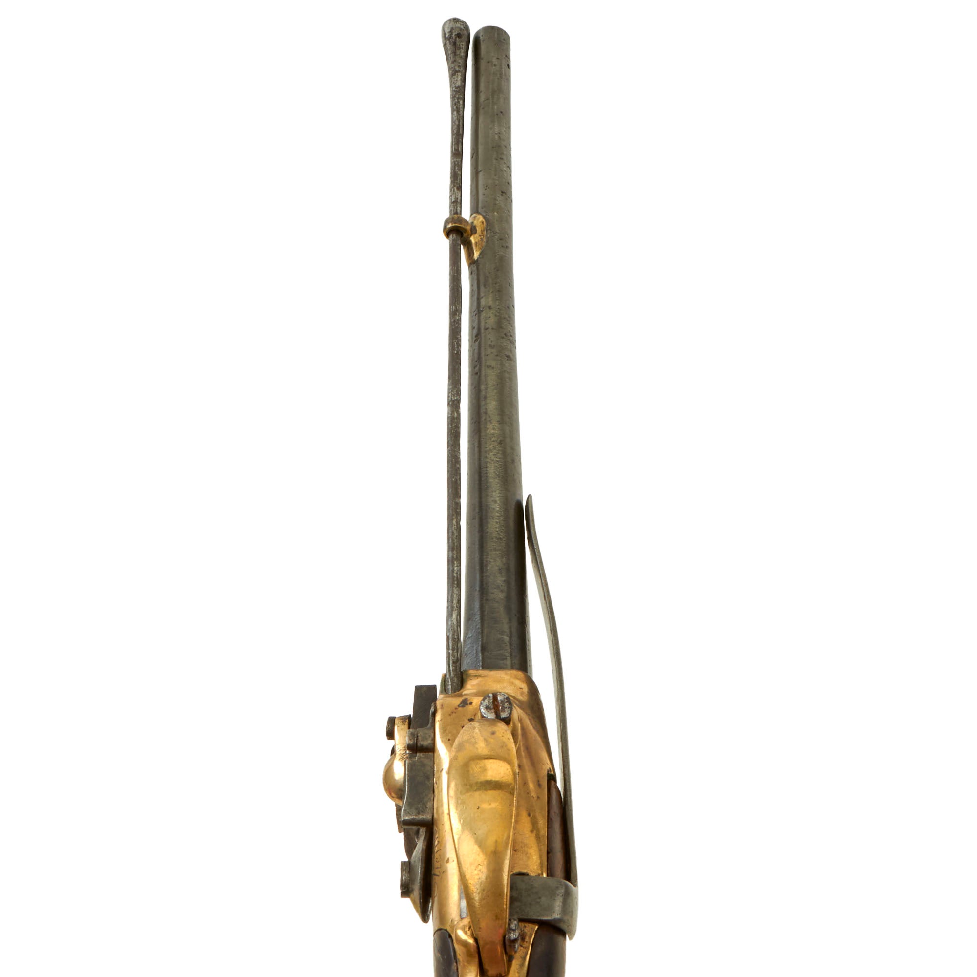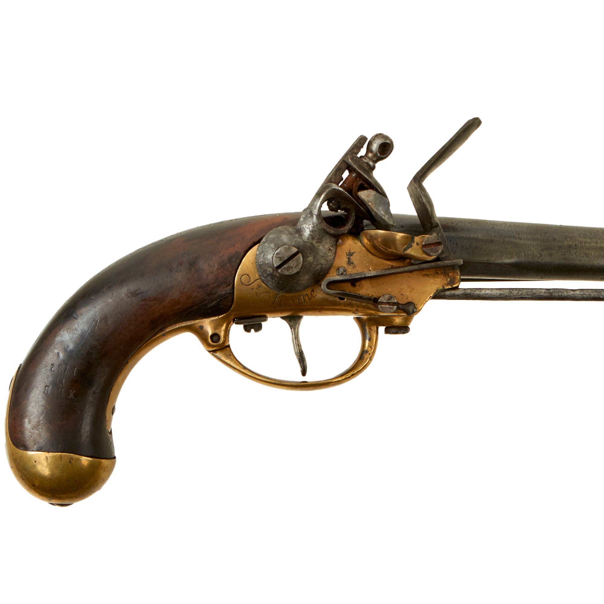 This wonderful example was made at St. Étienne Arsenal, as marked on the brass frame, and is definitely an early example, marked and dated X B I B / D / 1782 on the right side of the wooden grip. The frame is also marked with a CROWN / L proof mark over the frizzen spring, which is not one that we are familiar with. There is the number 196 and a proof mark on the screw that retains the 6 inch long belt hook. The pistol is in very good condition, but does show wear from long service and cleaning. The barrel especially has seen a lot of past cleaning, being much more susceptible to oxidation than the brass, which unfortunately has removed all of the markings from it. The large amount of cleaning, combined with powder fouling and oxidation on the barrel interior, has resulted in a barrel wall that is very thin in areas. There are even some small holes through the barrel closer to the muzzle.