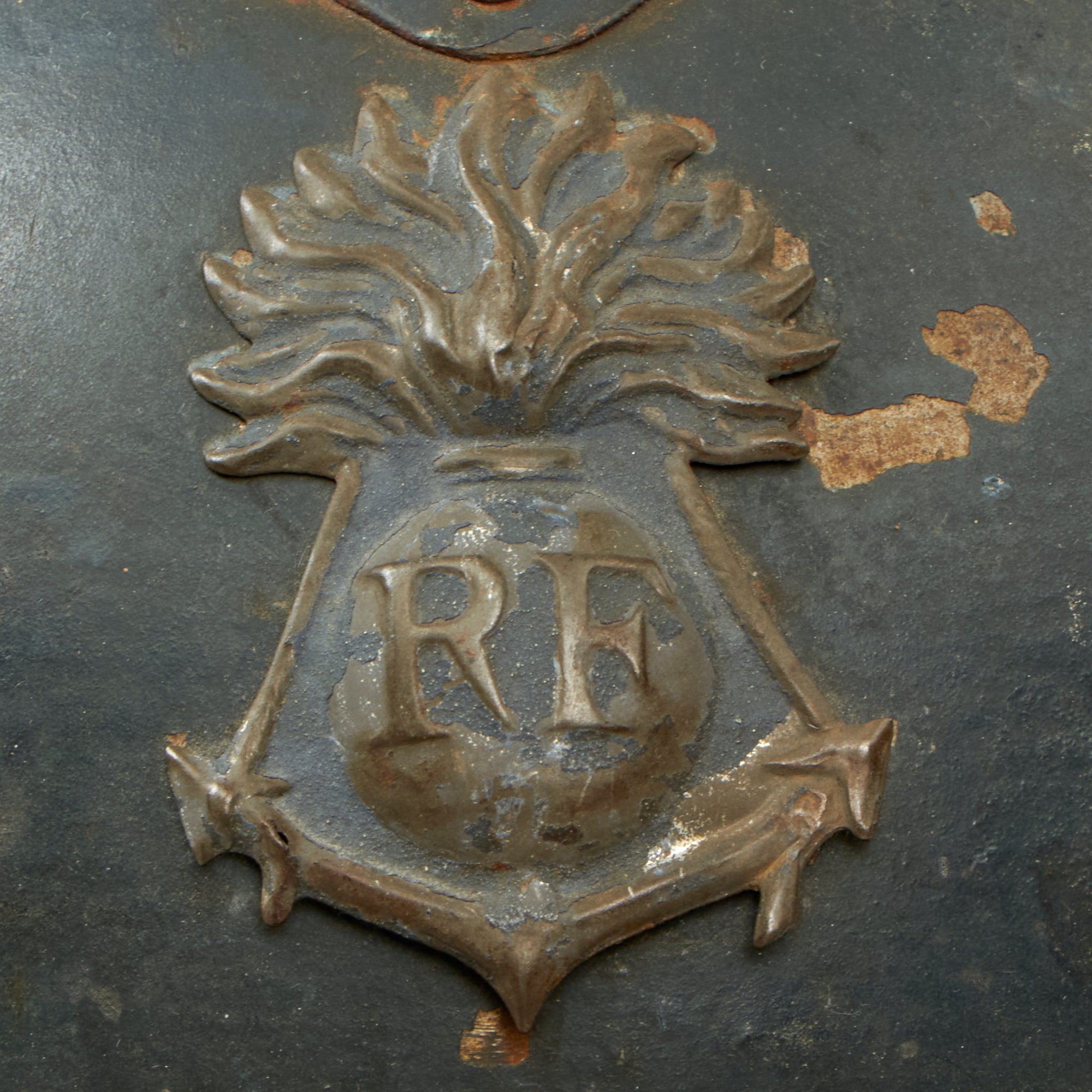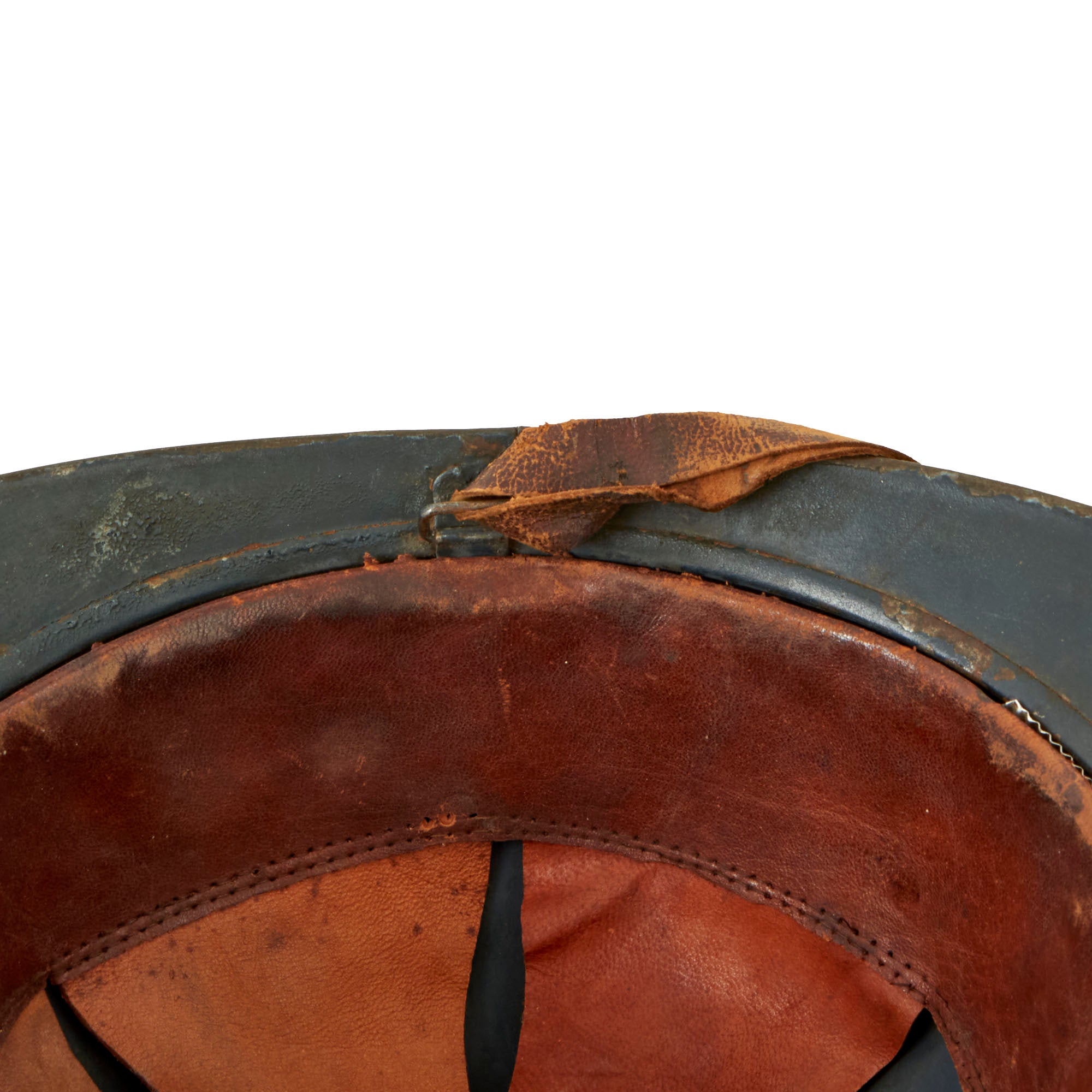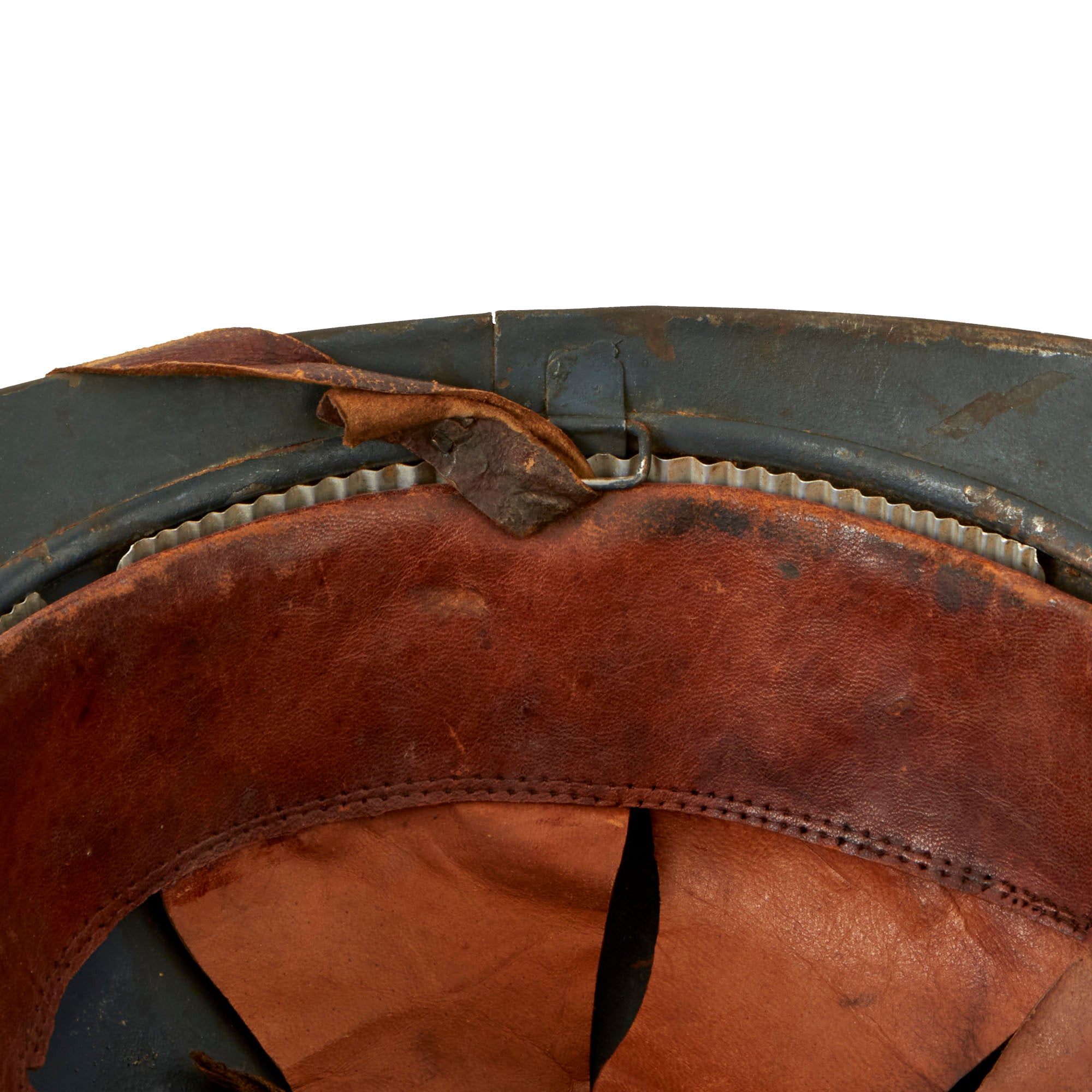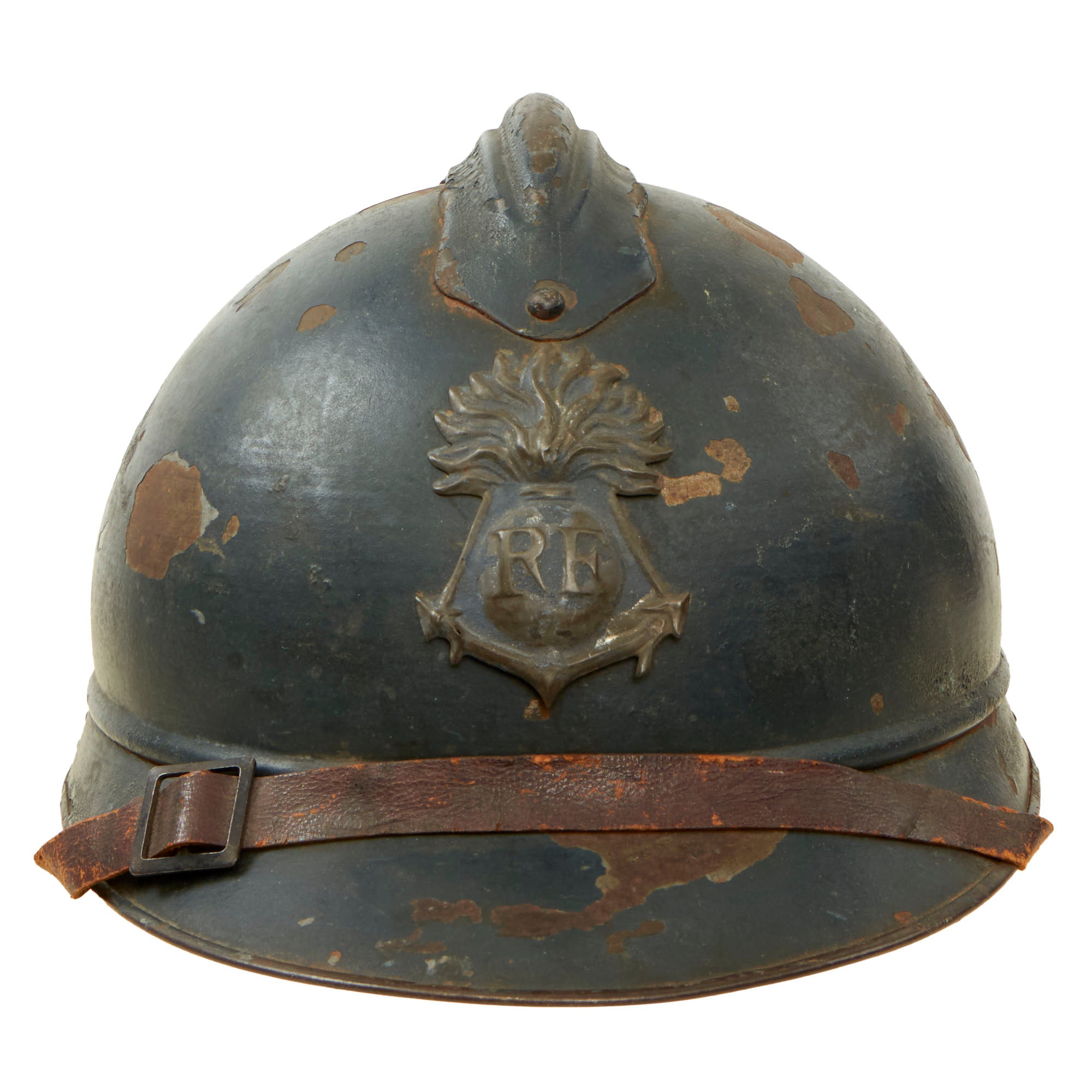 The helmet retains the original "dark horizon blue" paint on the shell, with some great period wear that really shows that it has "been there". There is some denting on the top right side of the helmet, and there is also paint loss overall, showing a lot of small chips and also wear around the rim. Like it just came off the battlefield! The front of the helmet still has its original French Colonial Infantry & Navy Badge, which features an anchor under the standard R F on a "flaming bomb", for Republique Francaise. The liner is still present, one of the later patterns and in great shape. The back of the liner unfortunately does have some material loss and one of the pads is missing. The chinstrap is present though delicate and cracked in places.