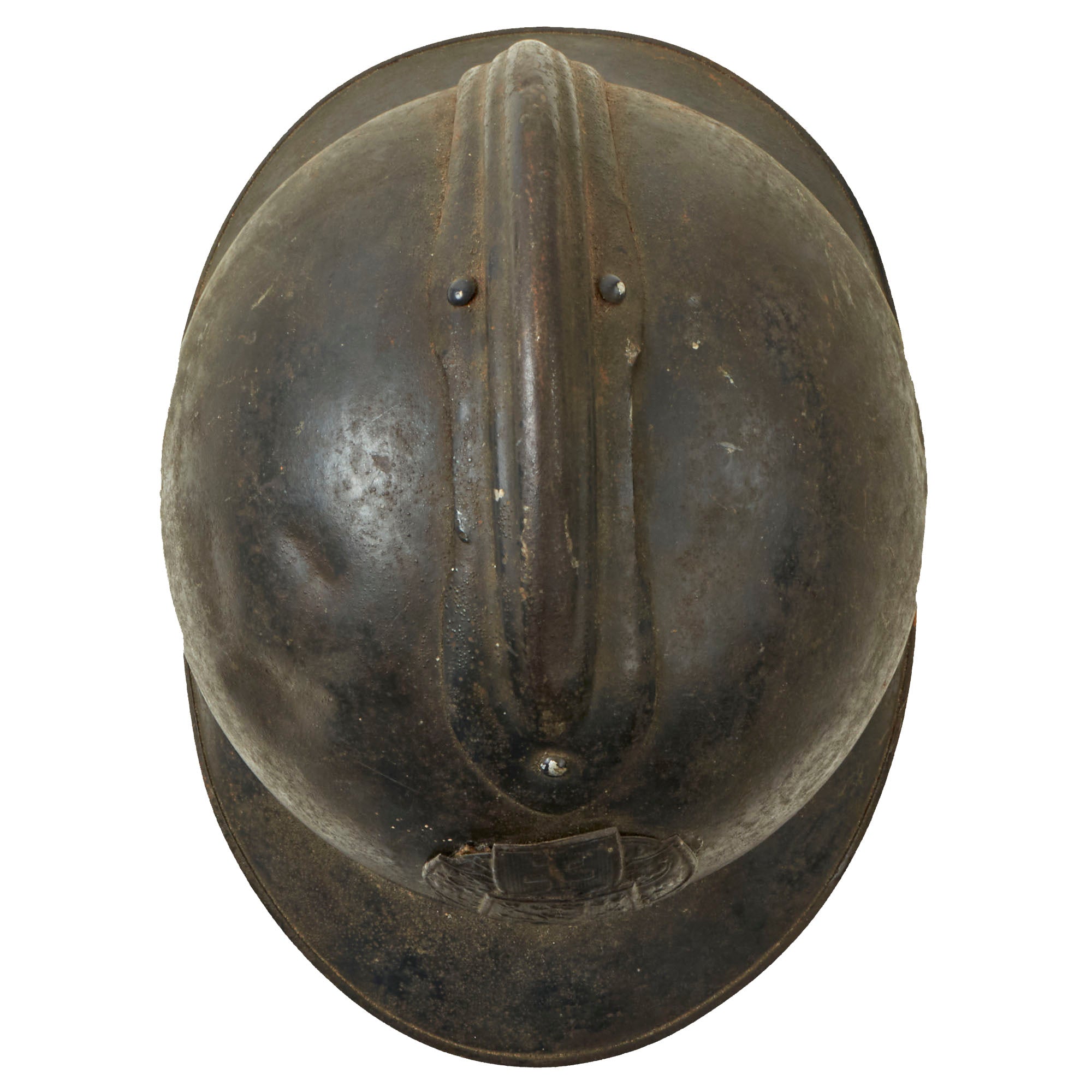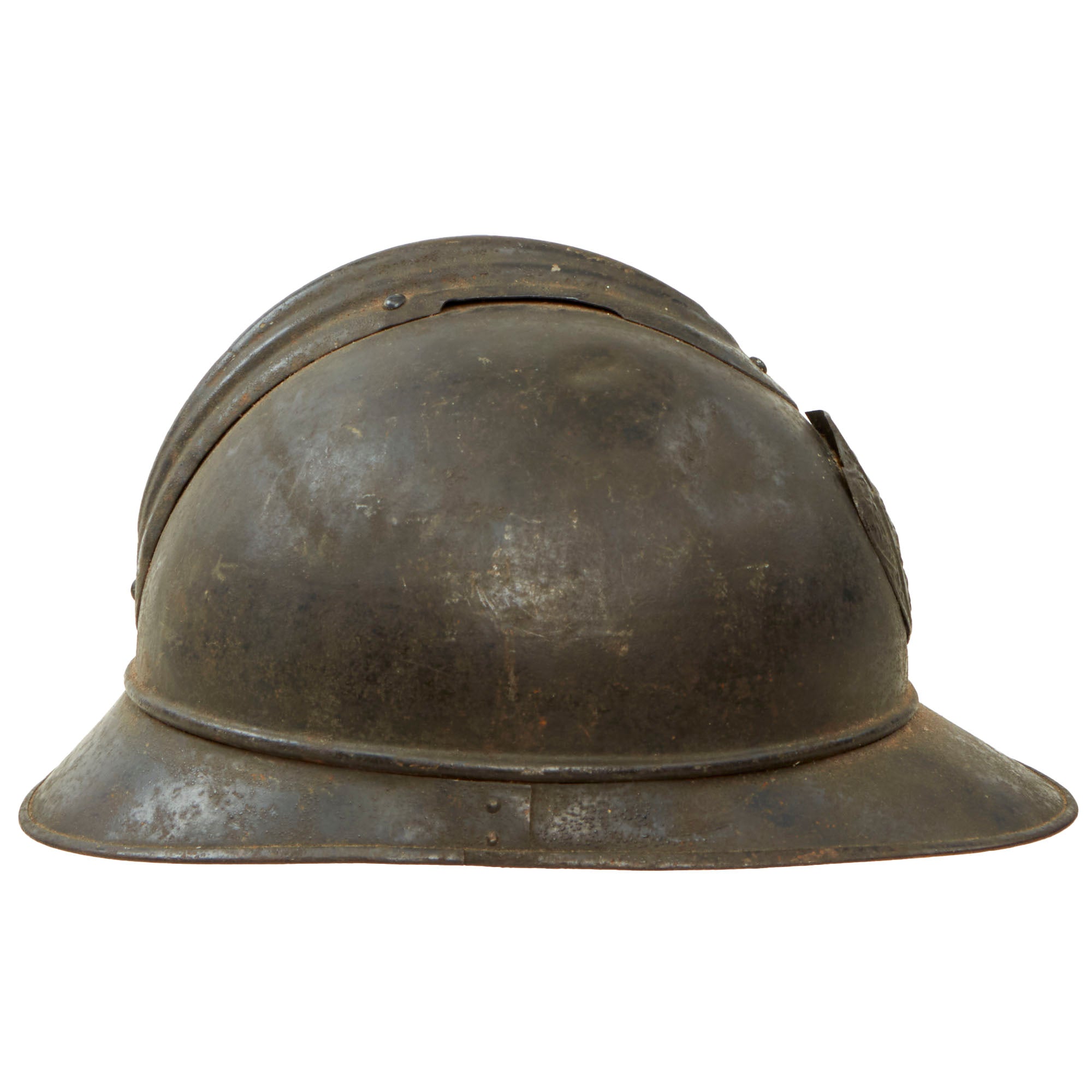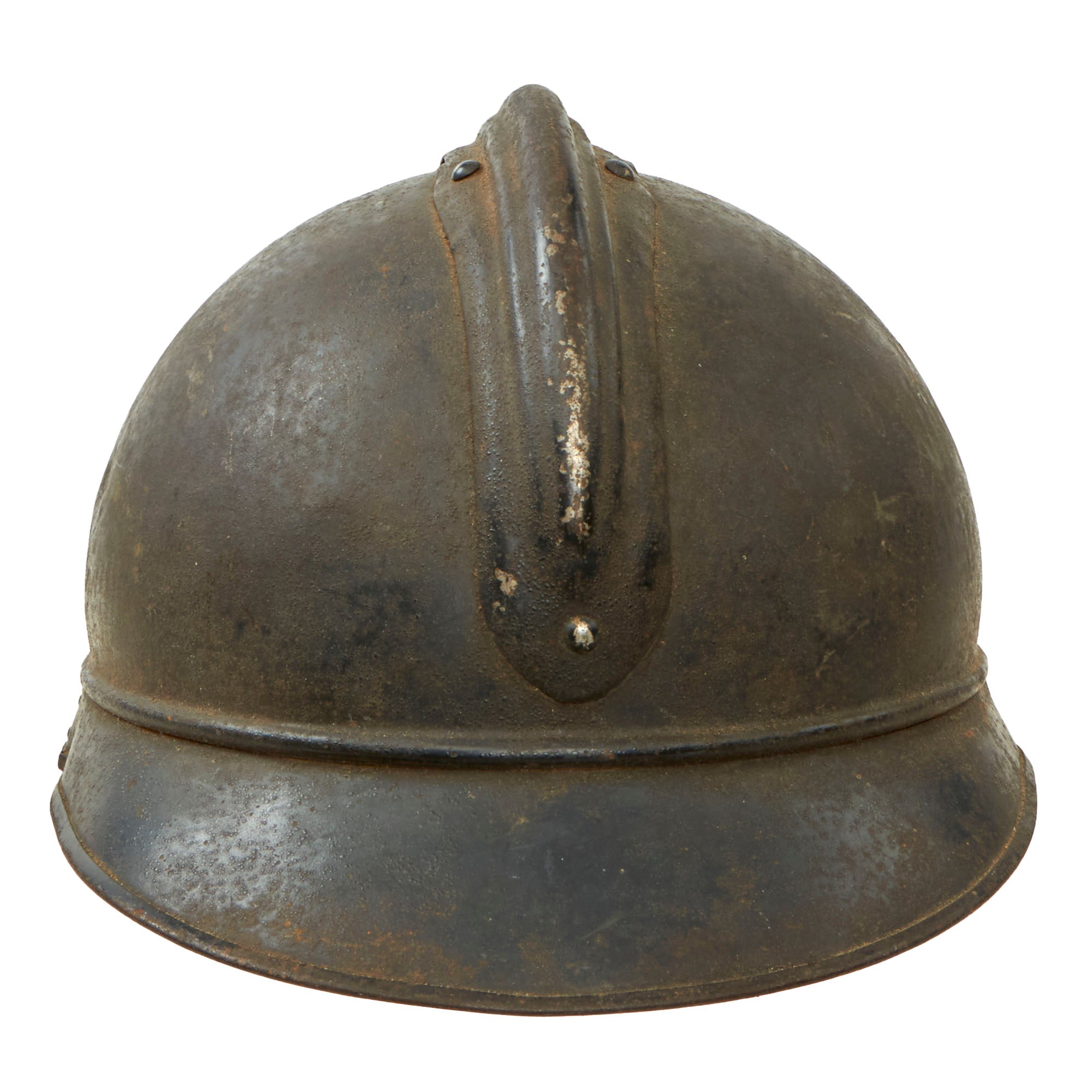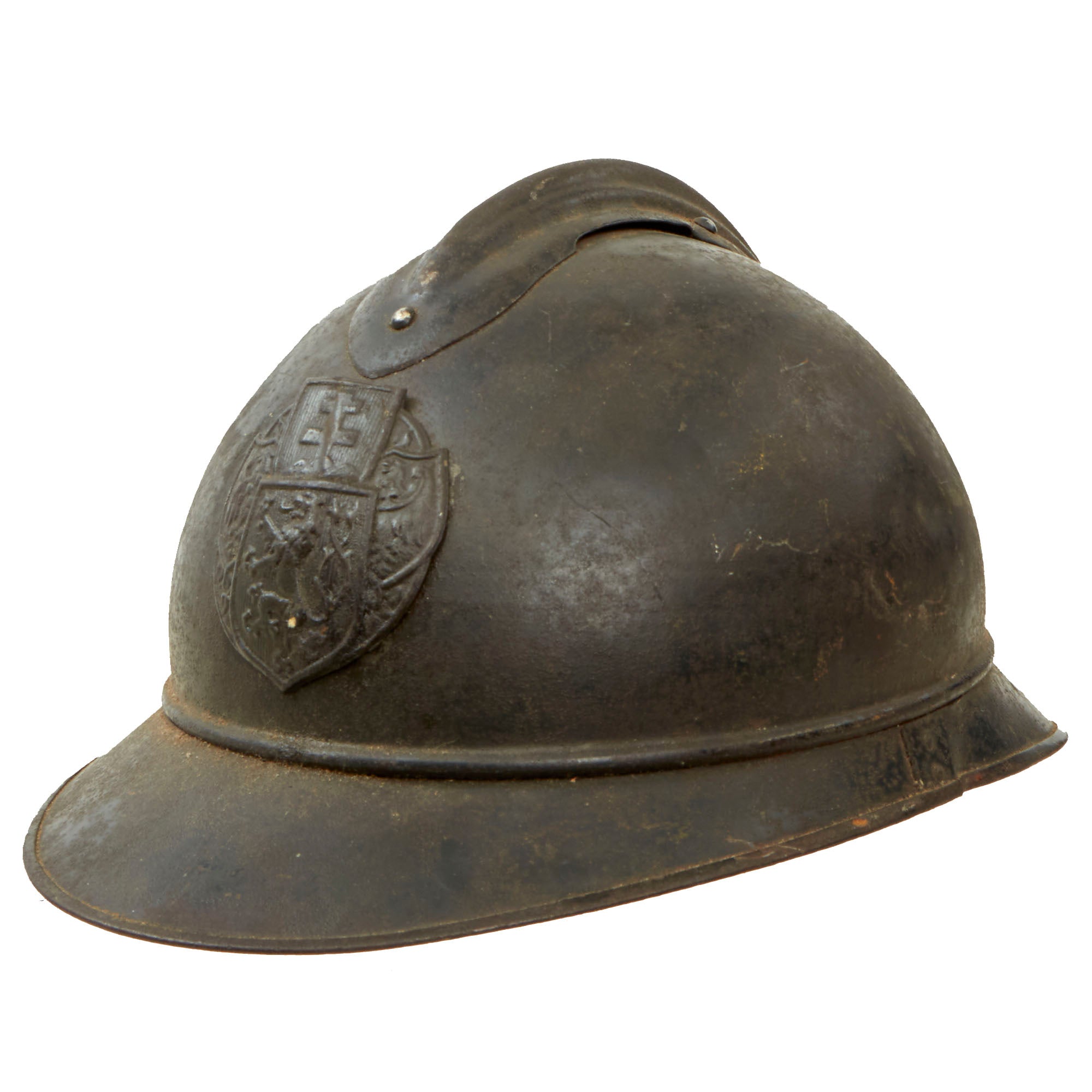 Original Item: Only One Available. This is something that we have definitely not had before! This is a nice service used example of a genuine World War I M-1915 French "Adrian" steel helmet, outfitted for the "Czechoslovak Legion" during WWI. The helmet definitely looks to have seen long service, and it looks to be painted dark blue / black, though this could be a faded horizon blue.