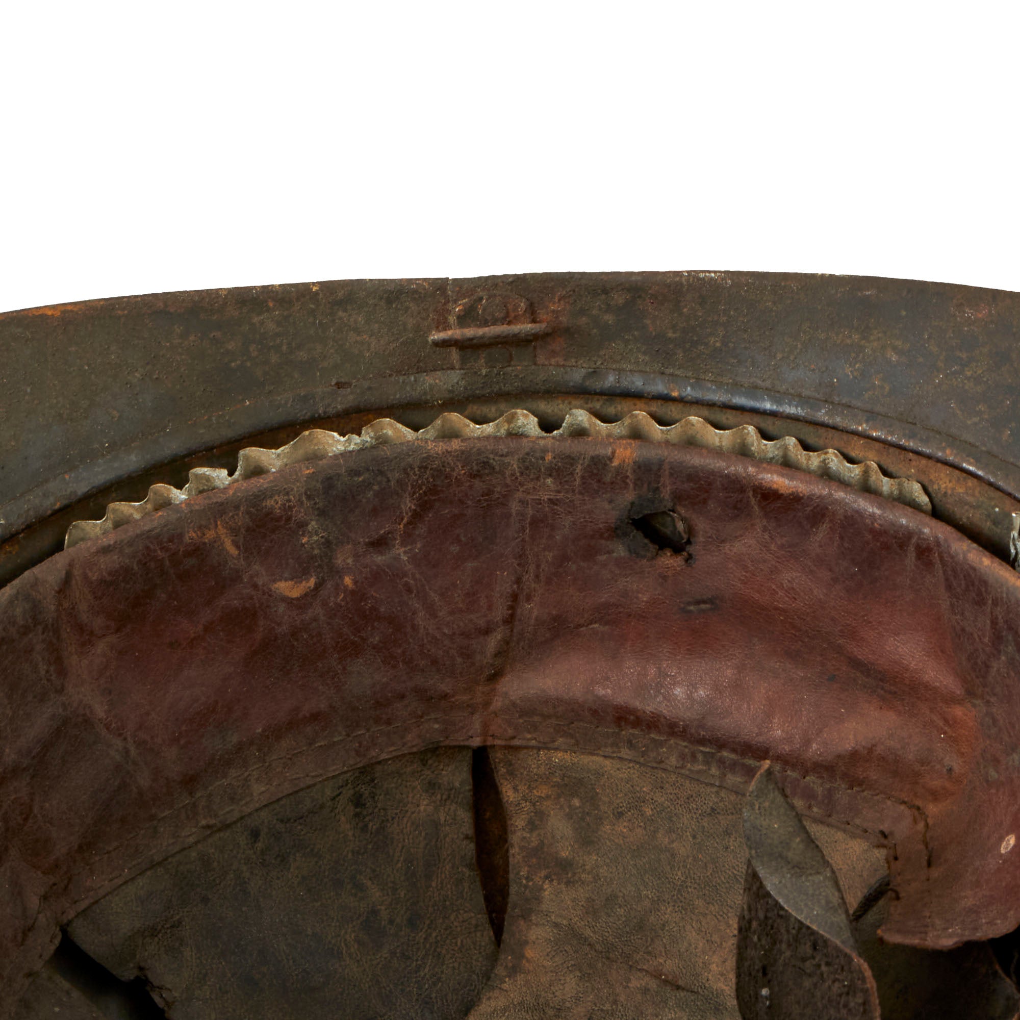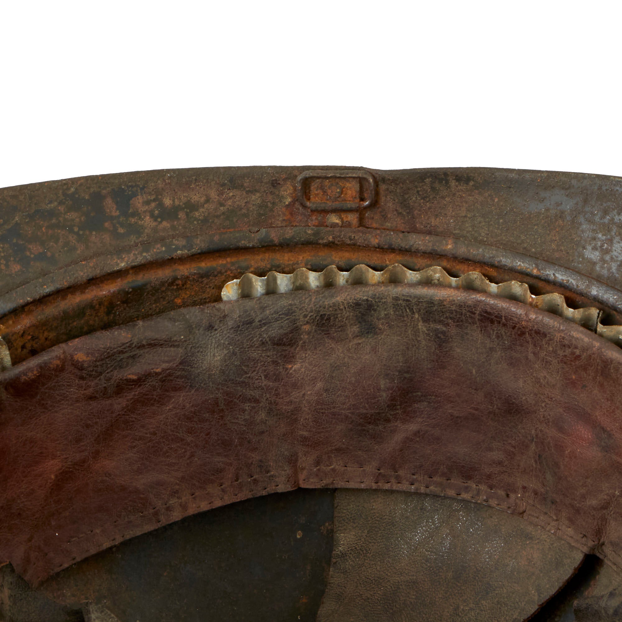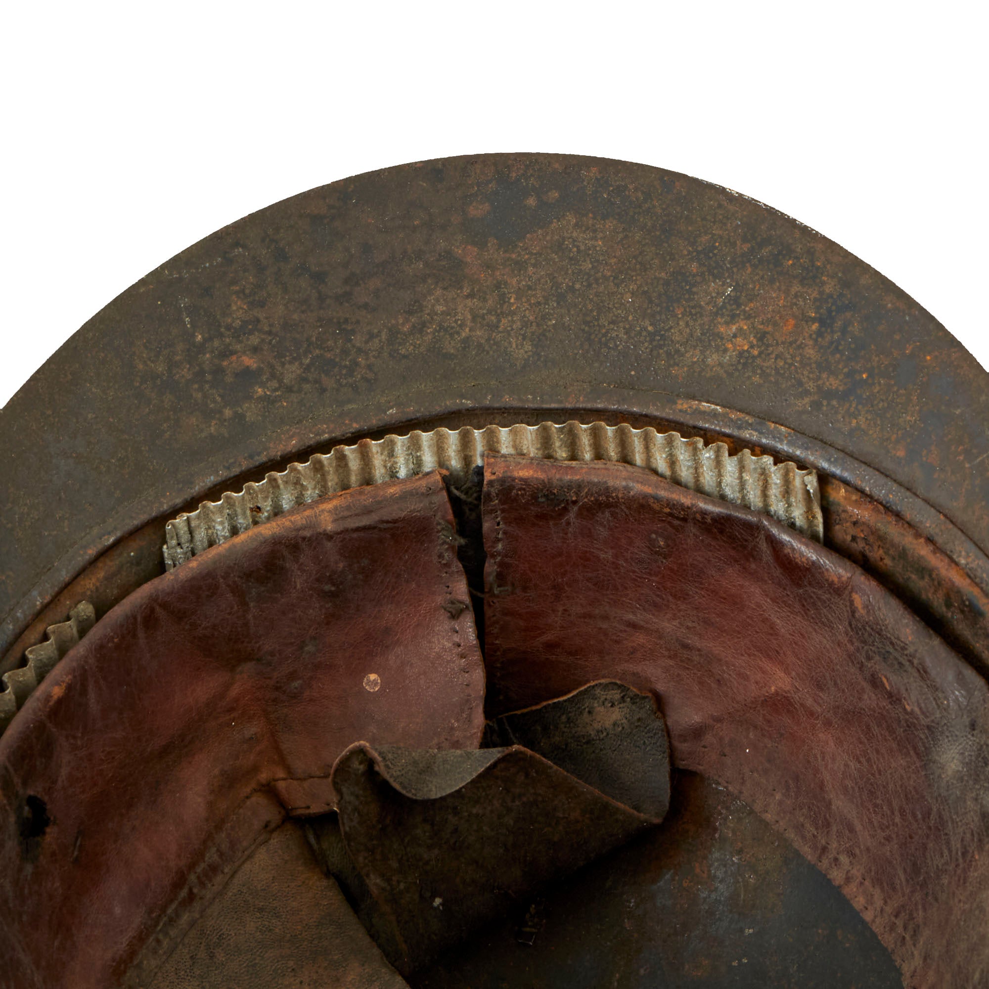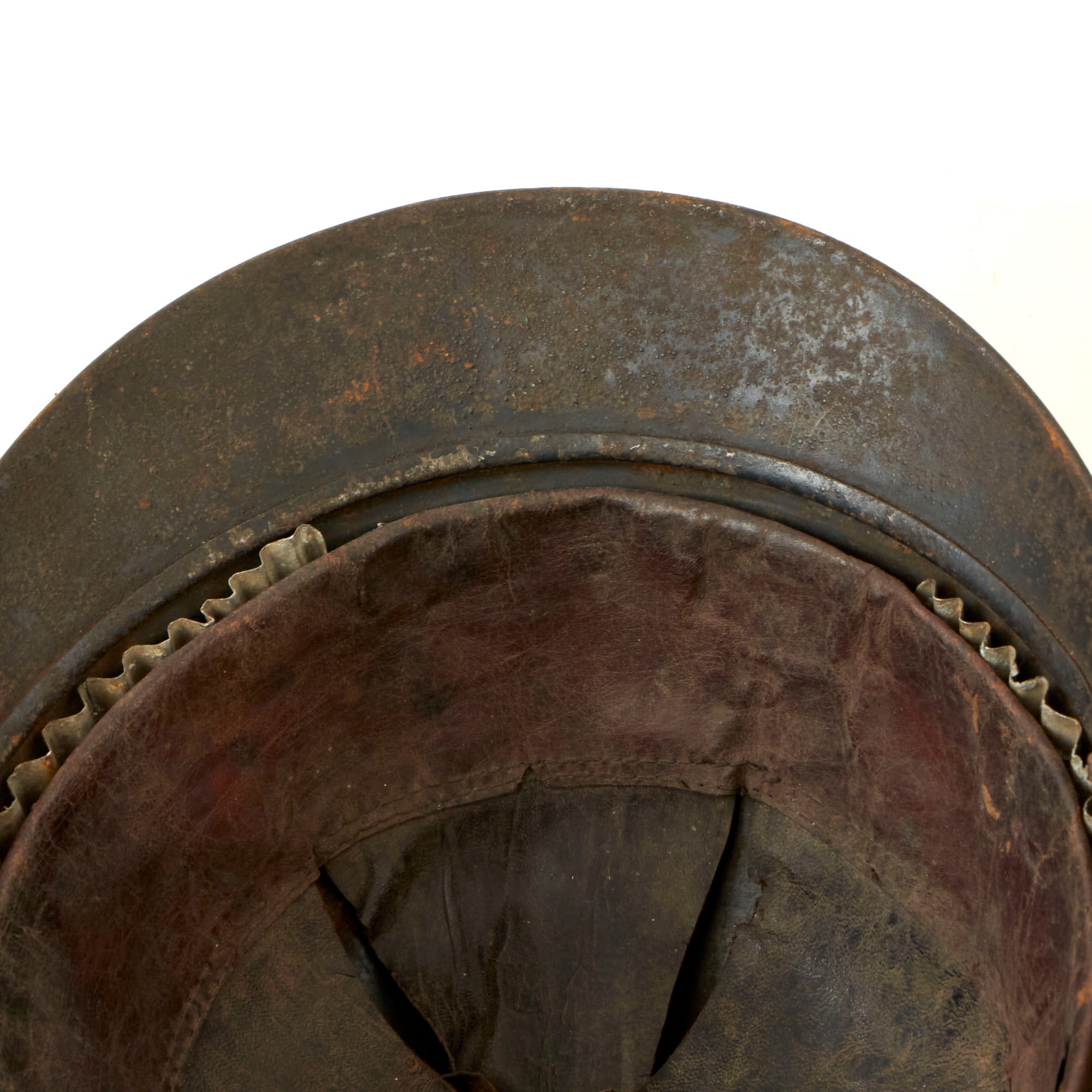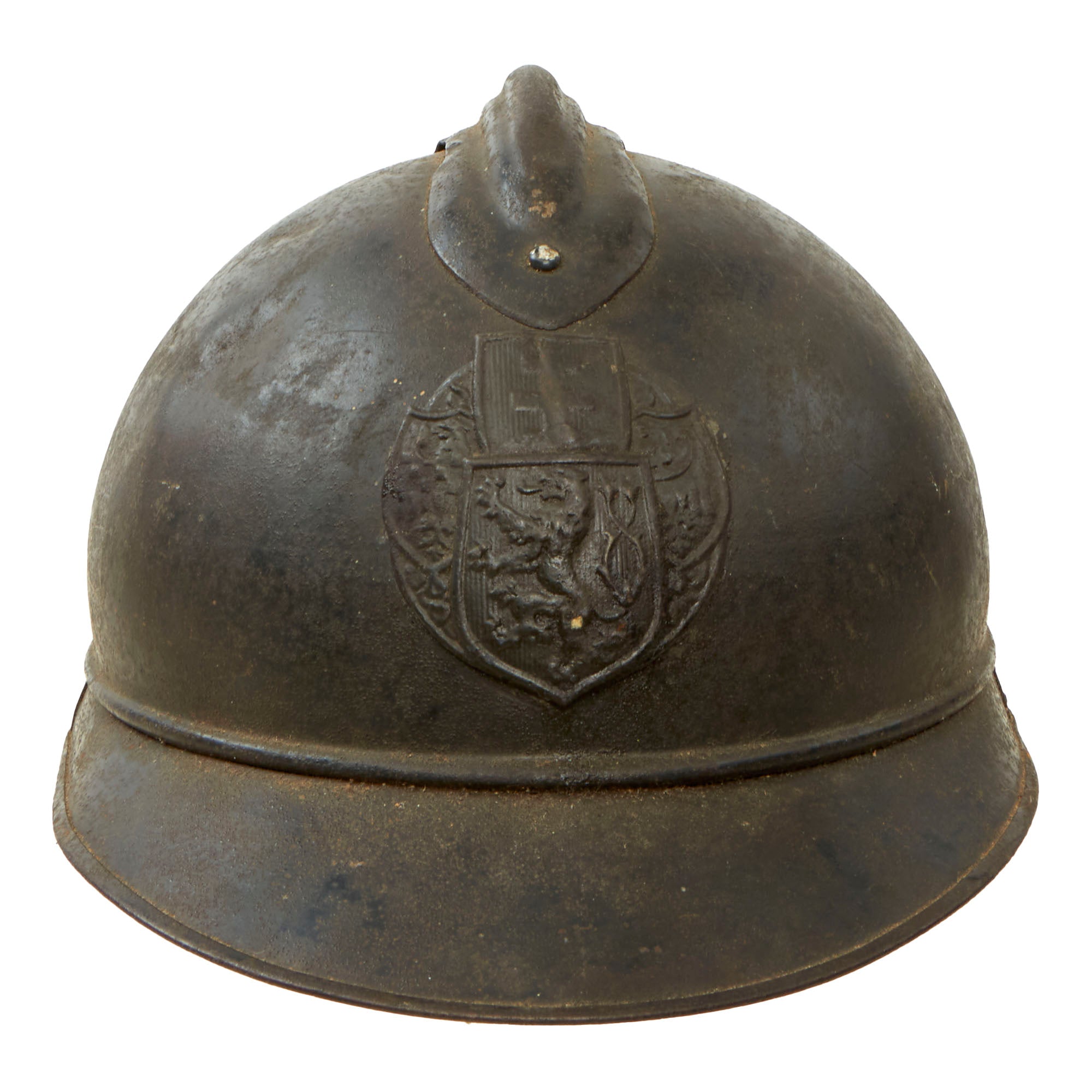 Original Item: Only One Available. This is something that we have definitely not had before! This is a nice service used example of a genuine World War I M-1915 French "Adrian" steel helmet, outfitted for the "Czechoslovak Legion" during WWI. The helmet definitely looks to have seen long service, and it looks to be painted dark blue / black, though this could be a faded horizon blue.