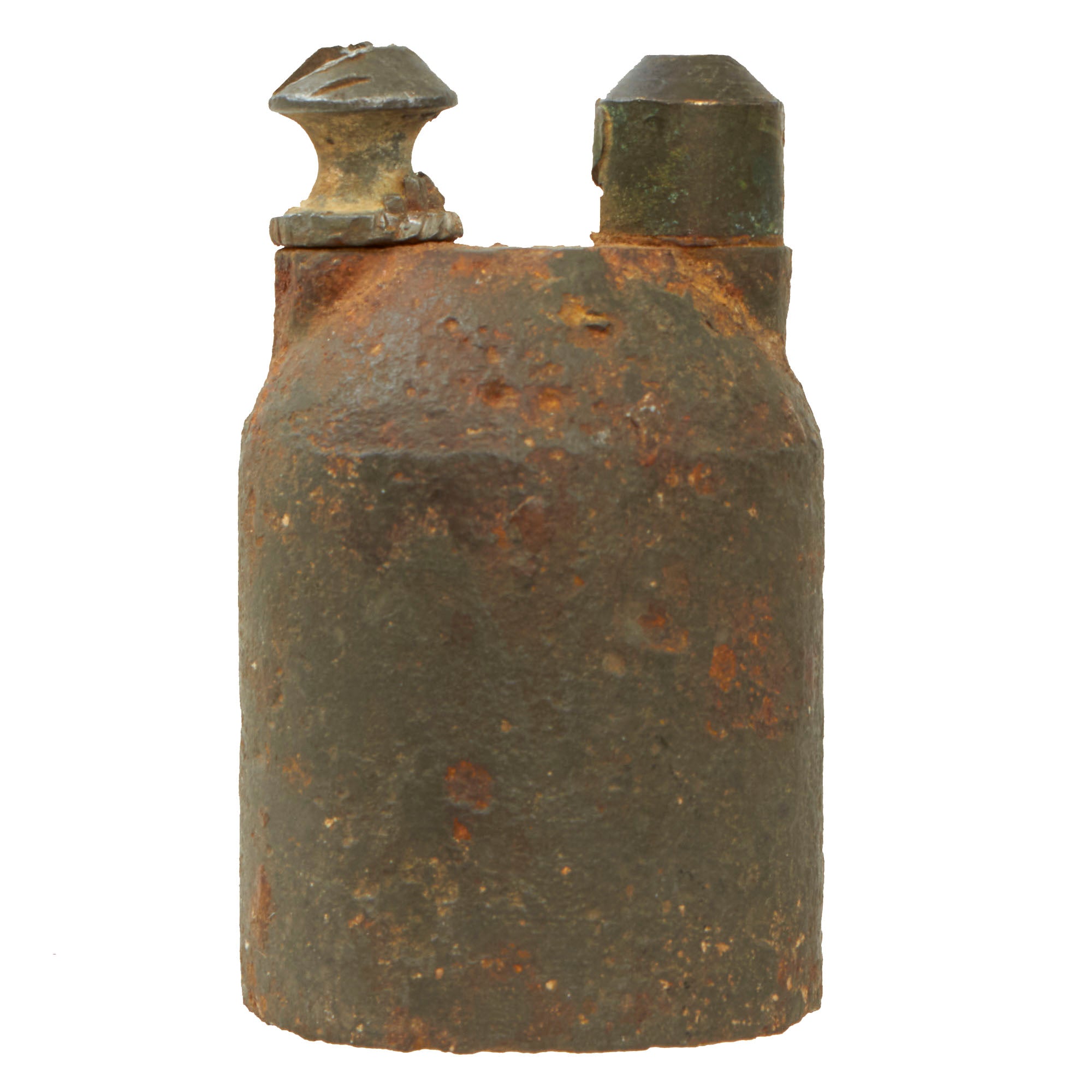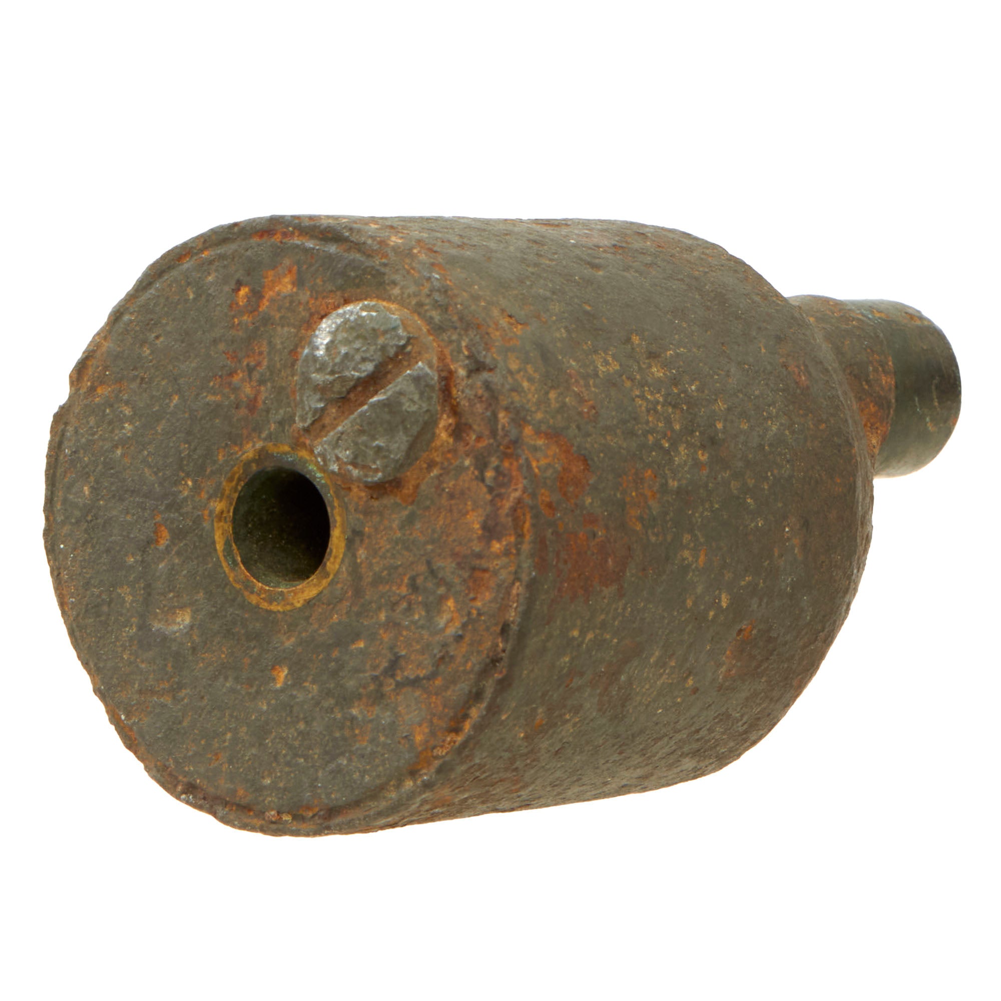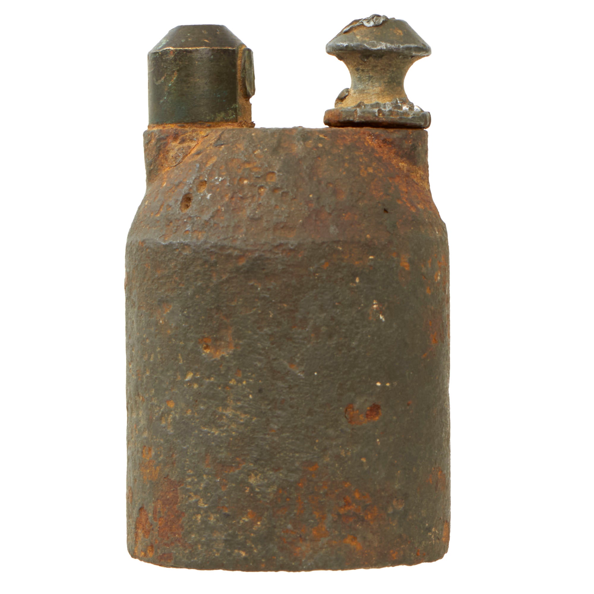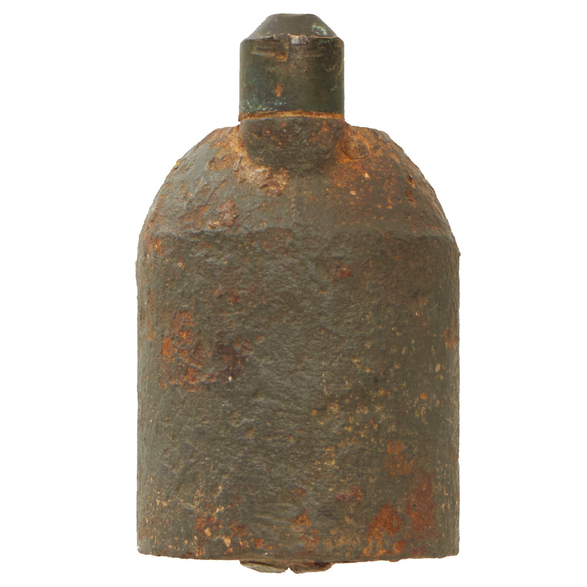 This example is in very good condition, and still has the detonator/fuze and explosives filling plug. Only the brass lever over the central hole that triggers the fuze is missing. We could not find any markings.