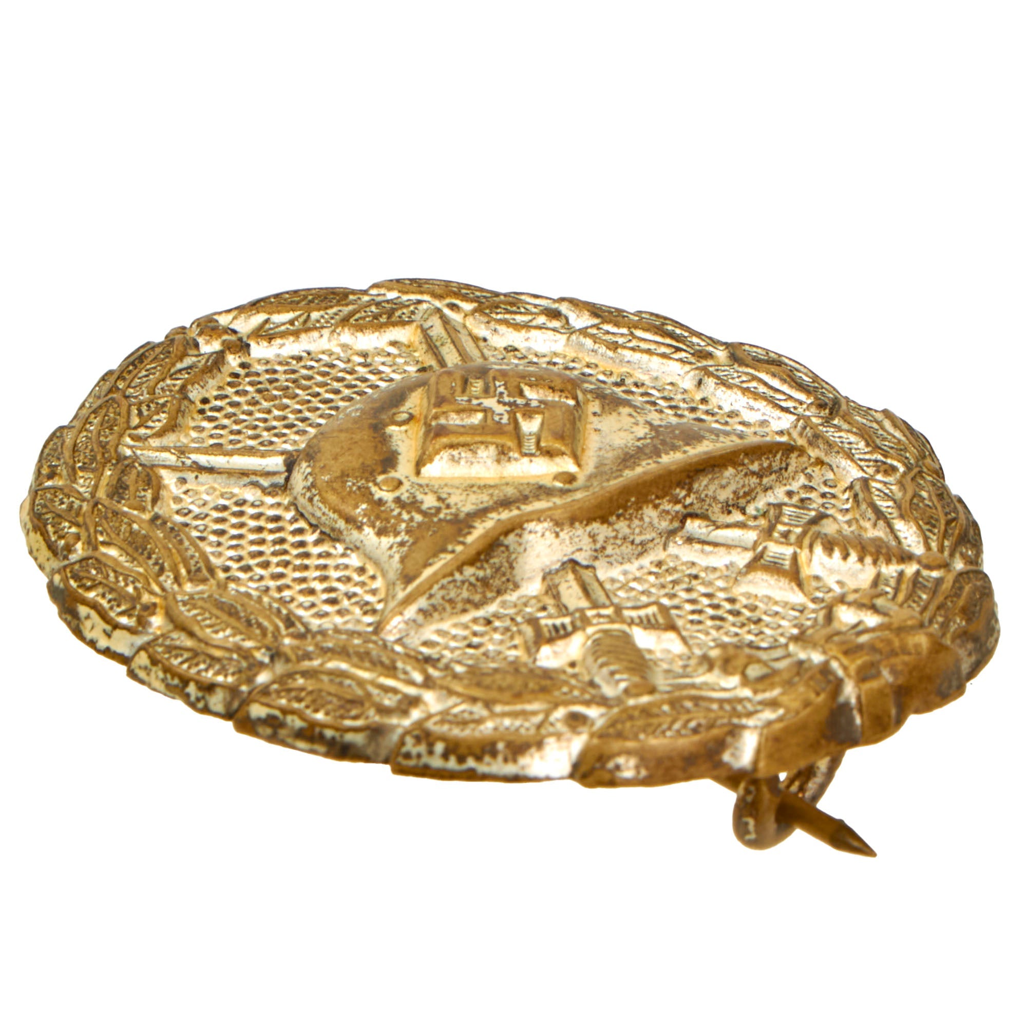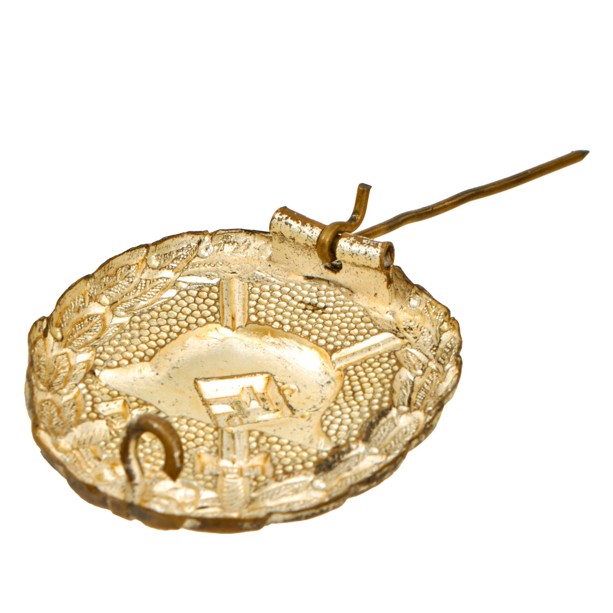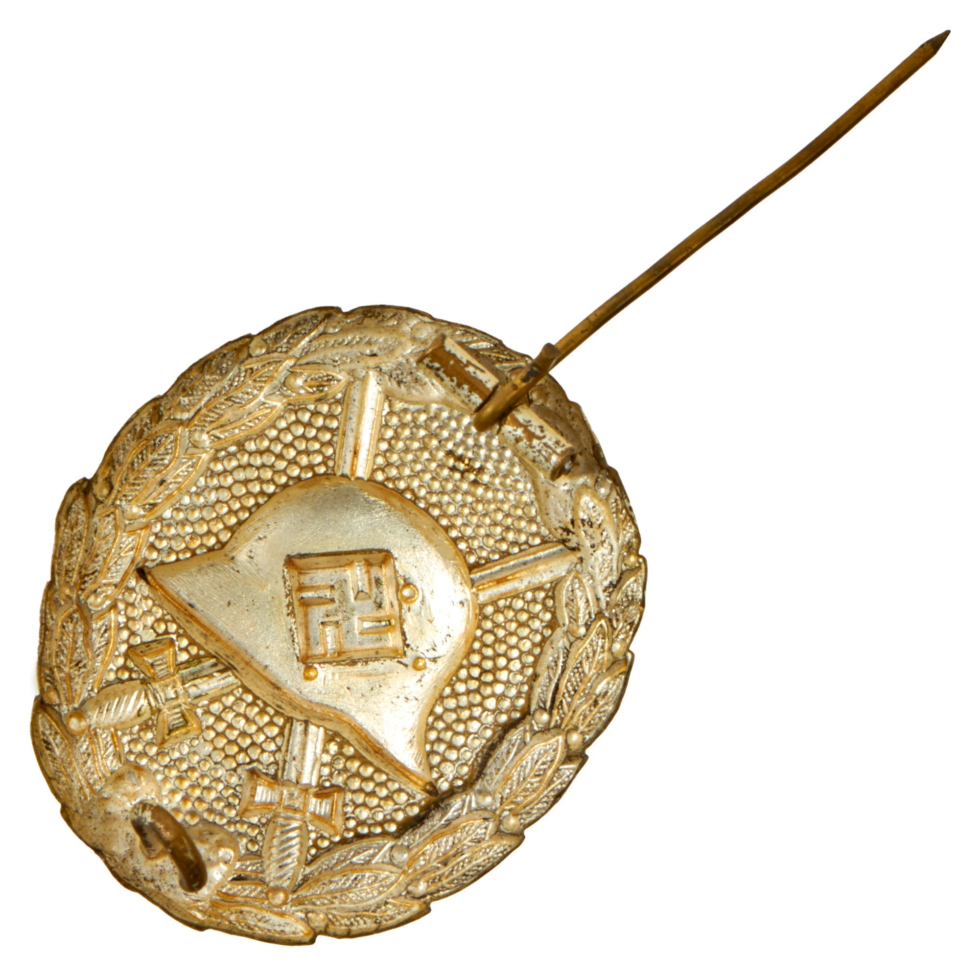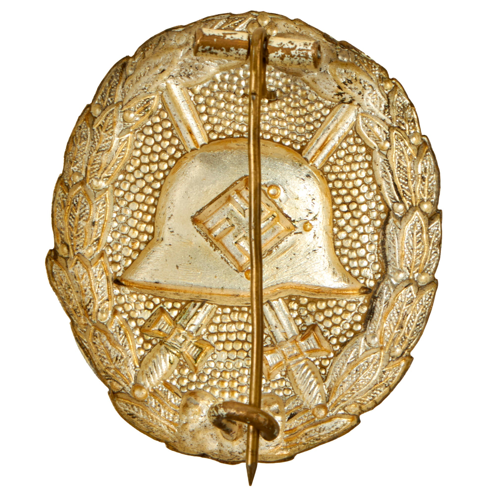 The German Wound Badge was instituted during the First World War to recognize those wounded in the conflict. It was designed using a World War One style Imperial German helmet as the main motif. The helmet was set on top two crossed swords against a pebbled background and surrounded by a laurel leaves wreath.