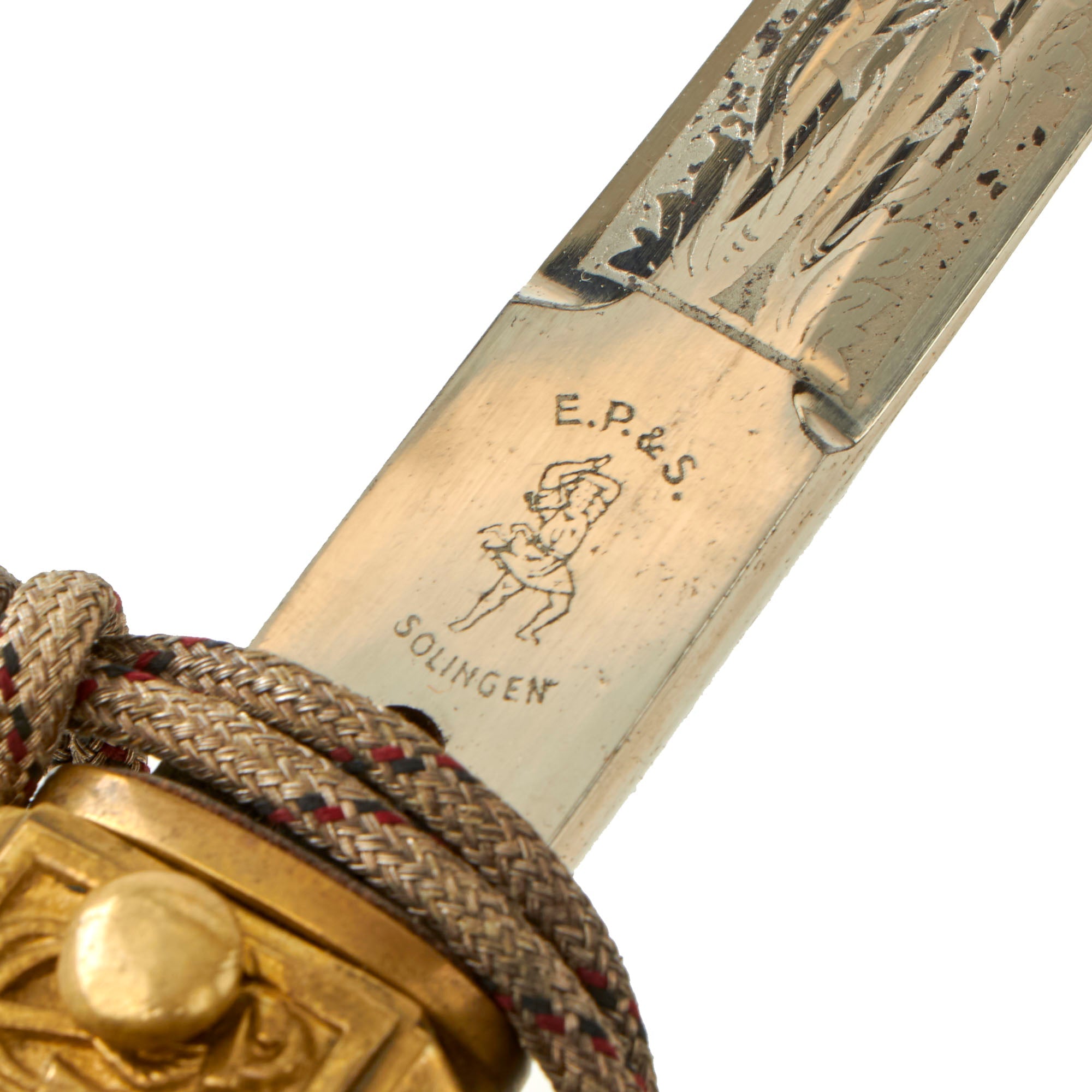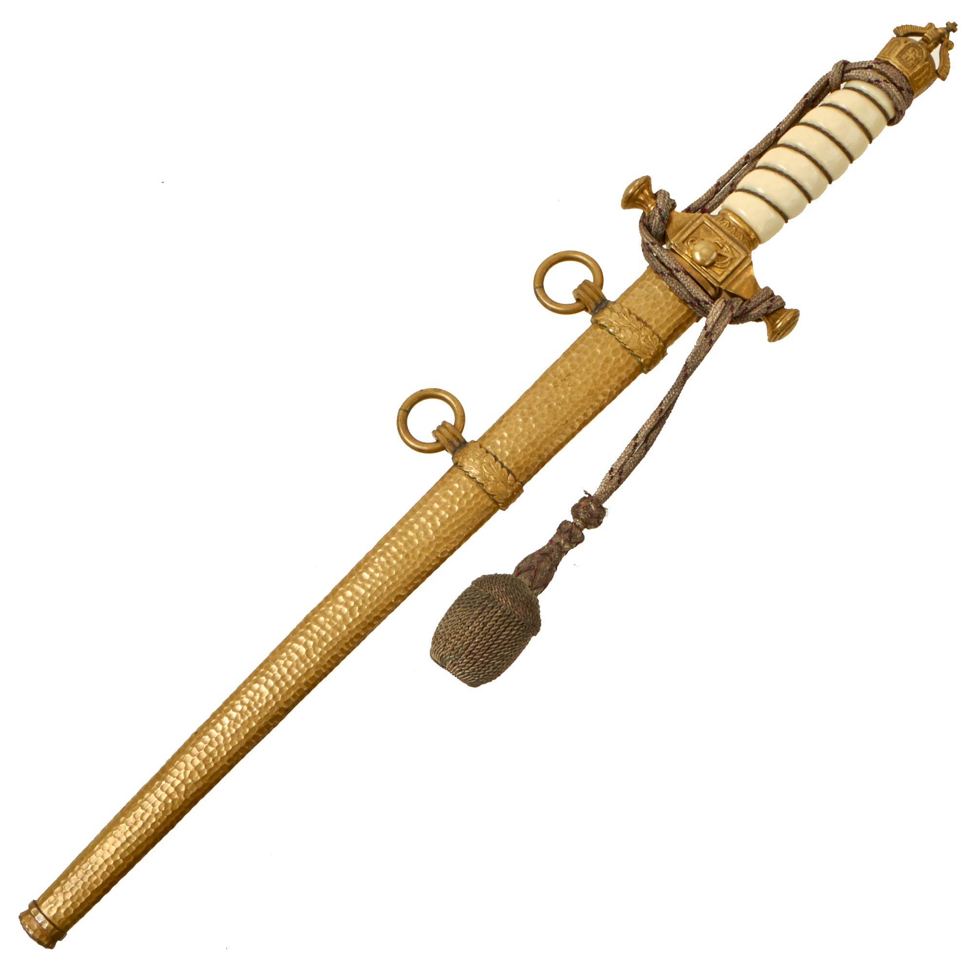 Original Item: Only One Available. This is a rare Solingen-Produced totally original German Early Weimar Period "Deluxe" Model 1902 Style Naval Officer's Dagger by E. Pack & Söhne, Ritterwerk, complete with the original "hammered" brass scabbard and correct portepee. These fittings are based on the Imperial German Kaiserliche Marine Model 1902 Naval Officer's Dirk, and feature a brass "Imperial Crown" pommel and a cross guard with round finials and flutes towards the end. The Model 1919/1921 "ball pommel" daggers have a different cross guard, which is essentially the same as the later NSDAP issued examples. This is the first example we have had of one of these rare daggers, and it features a lovely etched Nickel-plated blade with a double fuller, which clearly shows an Imperial Crown on top of the "fouled anchor". Definitely a great opportunity to pick up a rare dagger!