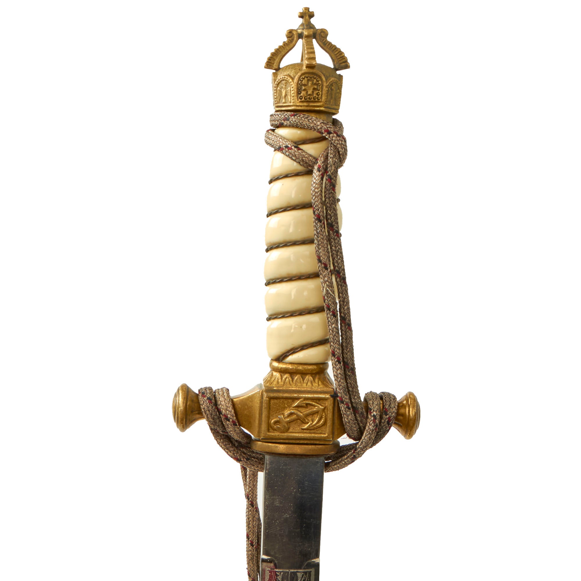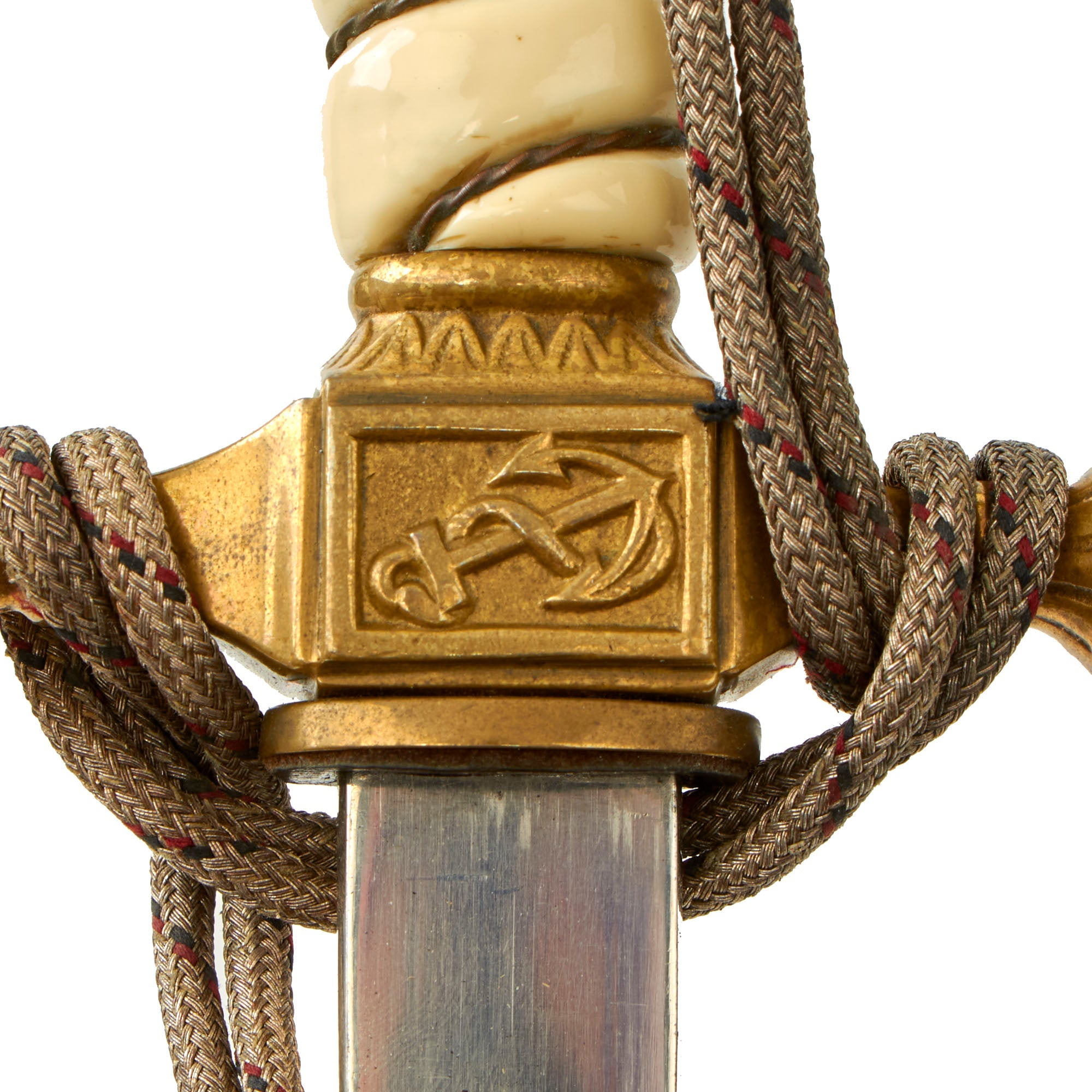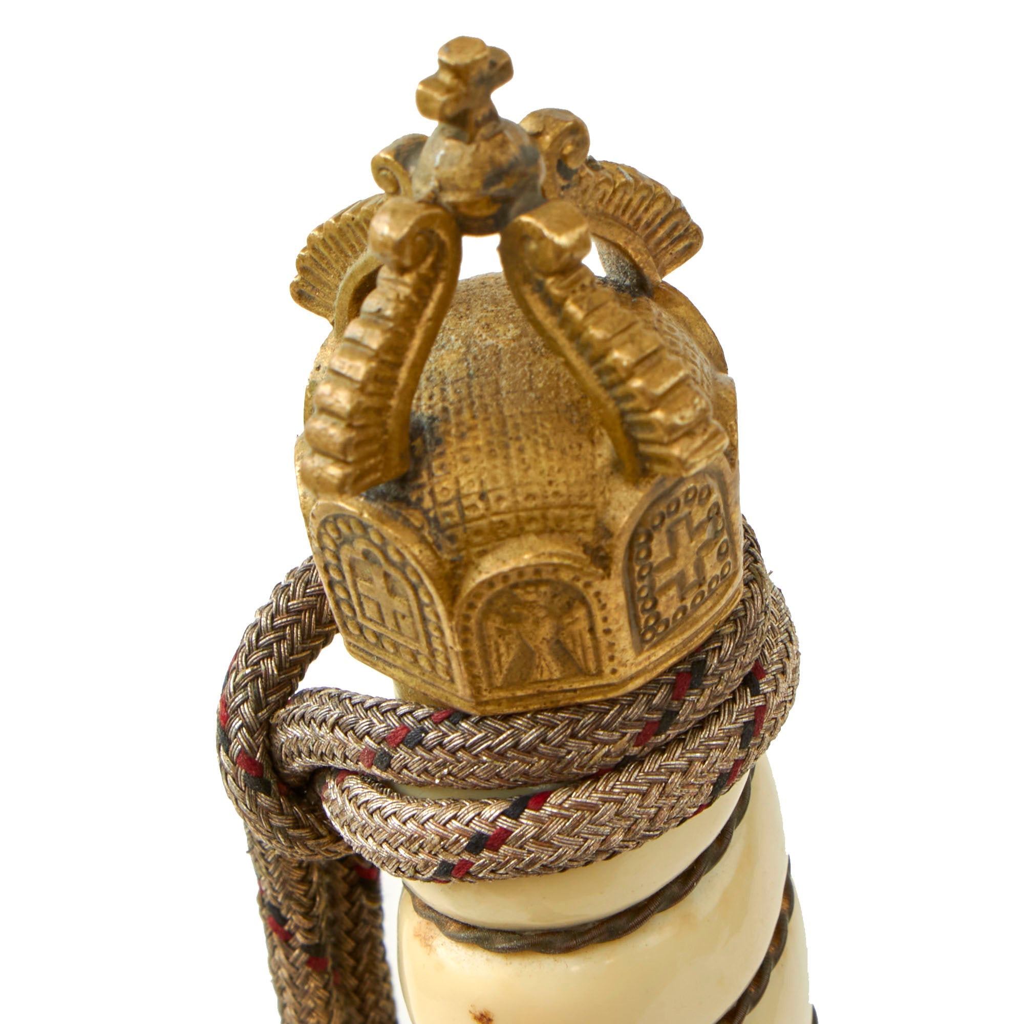 The "Deluxe" Model is equipped with an open Imperial Crown pommel attachment, as used during the German Imperial period, and features a white celluloid covered wooden grip, wrapped in bullion bound twisted brass wires. This dagger design would be phased out as the Weimar Period continued, and would be replaced by the Model 1929 with a ball pommel, which would remain the standard German Naval dagger until 1938, well into the NSDAP period.