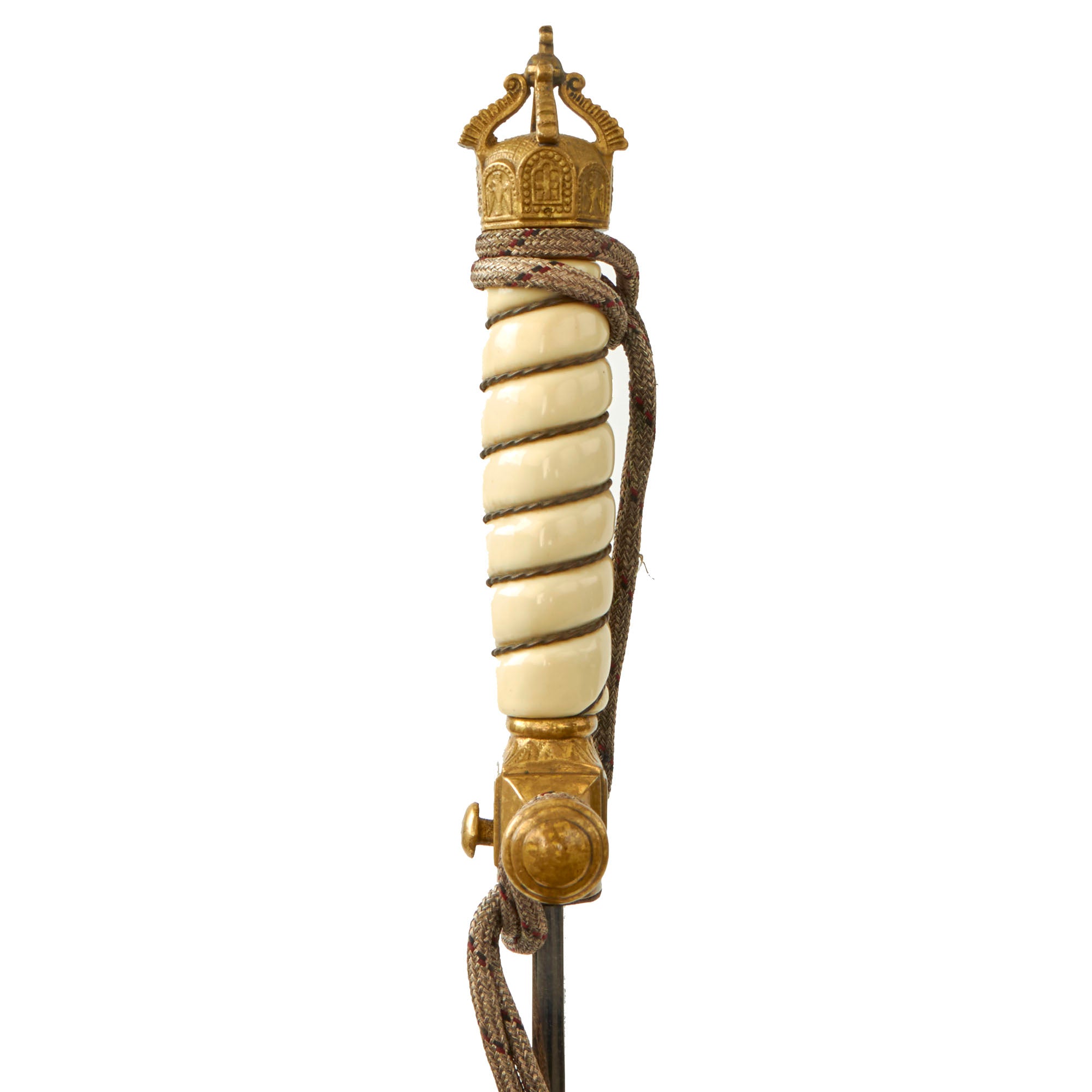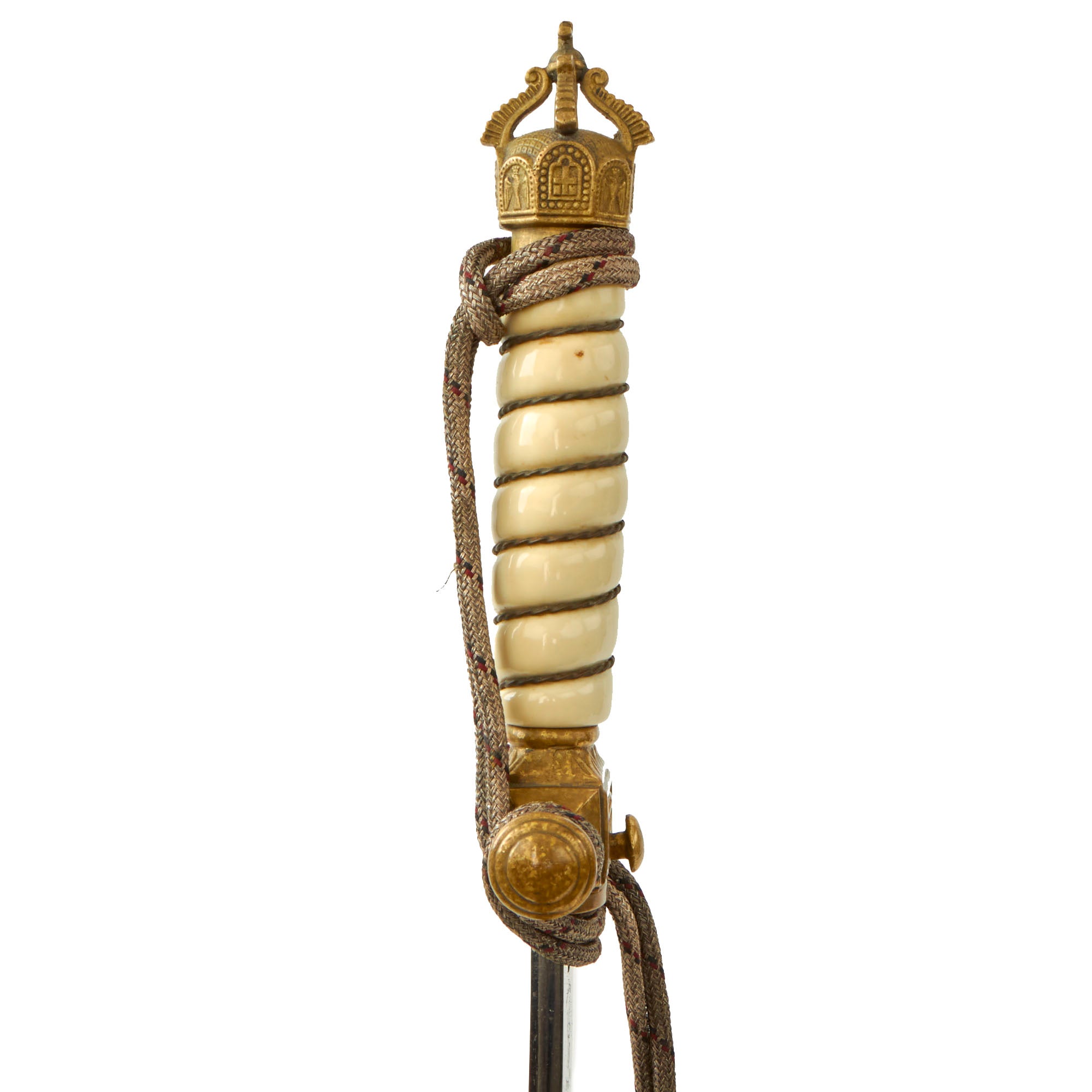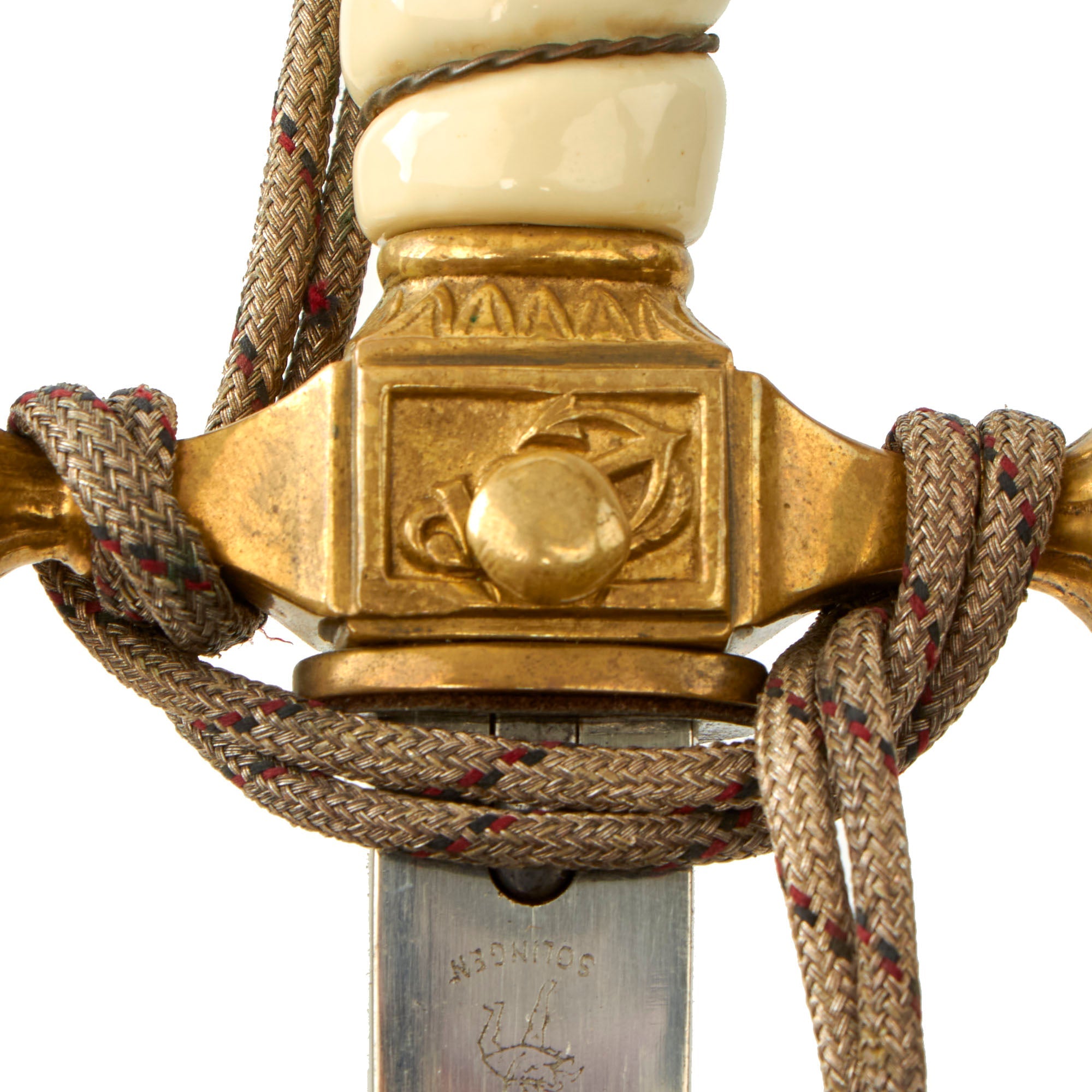 The "Deluxe" Model is equipped with an open Imperial Crown pommel attachment, as used during the German Imperial period, and features a white celluloid covered wooden grip, wrapped in bullion bound twisted brass wires. This dagger design would be phased out as the Weimar Period continued, and would be replaced by the Model 1929 with a ball pommel, which would remain the standard German Naval dagger until 1938, well into the NSDAP period.