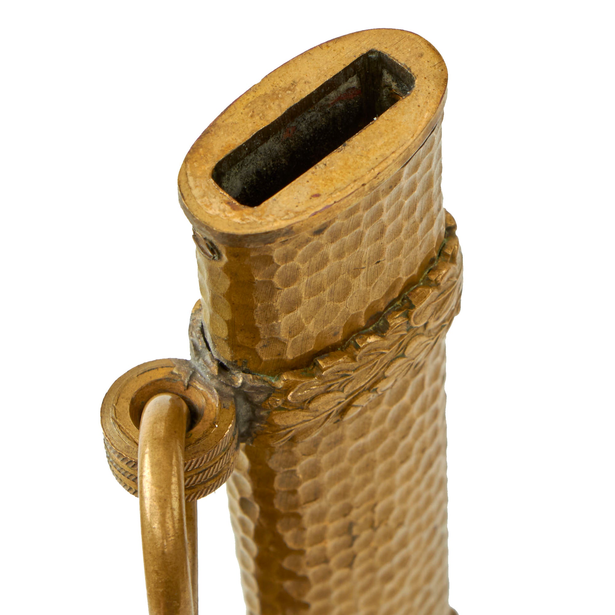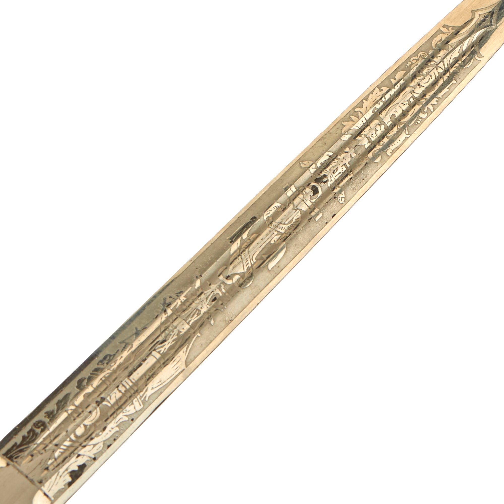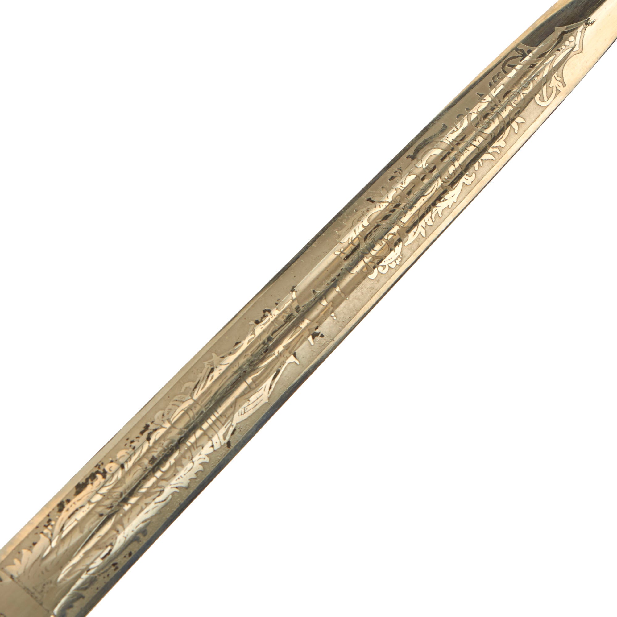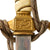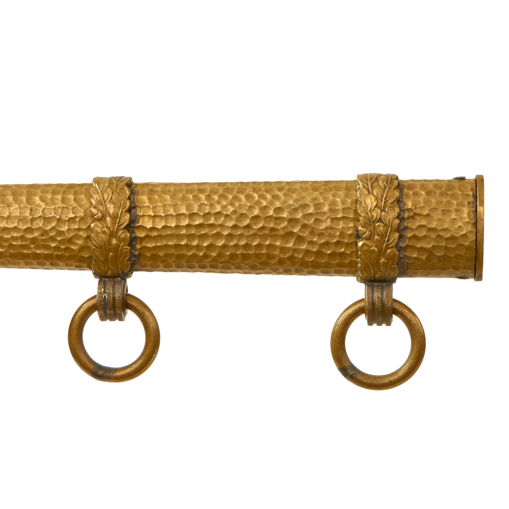 The hammered-brass scabbard is in very good used condition, with a lovely patina of age. The original gold plating is almost completely gone, as it was most likely "Mercury Gilt", which is the type that evaporates over time. The hammer marks on the body are still present and look great. We cannot see any dents or bends in the scabbard, and the blade sheathes easily. The bands feature overlapping oak leaves and acorns, and are quite a bit more ornate than usually seen. The ring ferrules are the rarely seen oak leaf type, and the rings are still present. The throat is retained by two flush head screws on the narrow sides, which show no signs of turning.