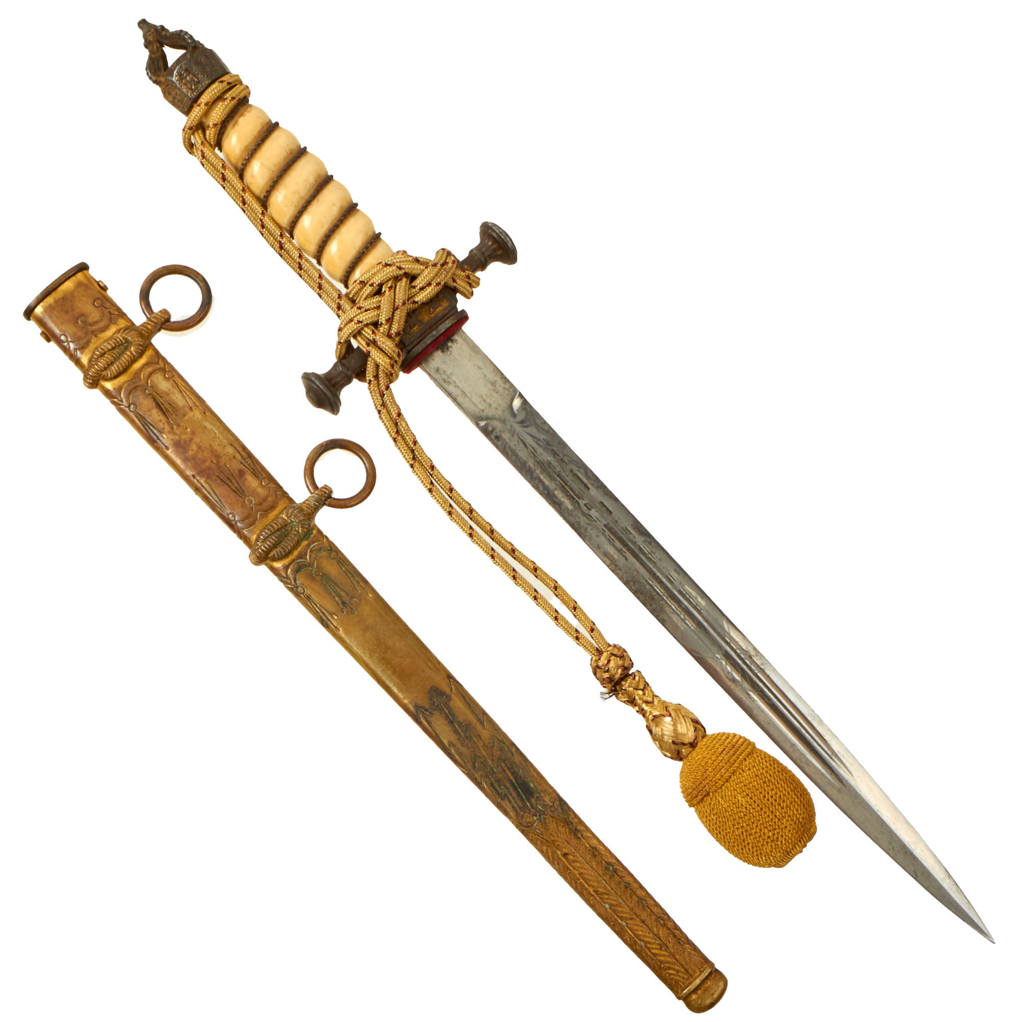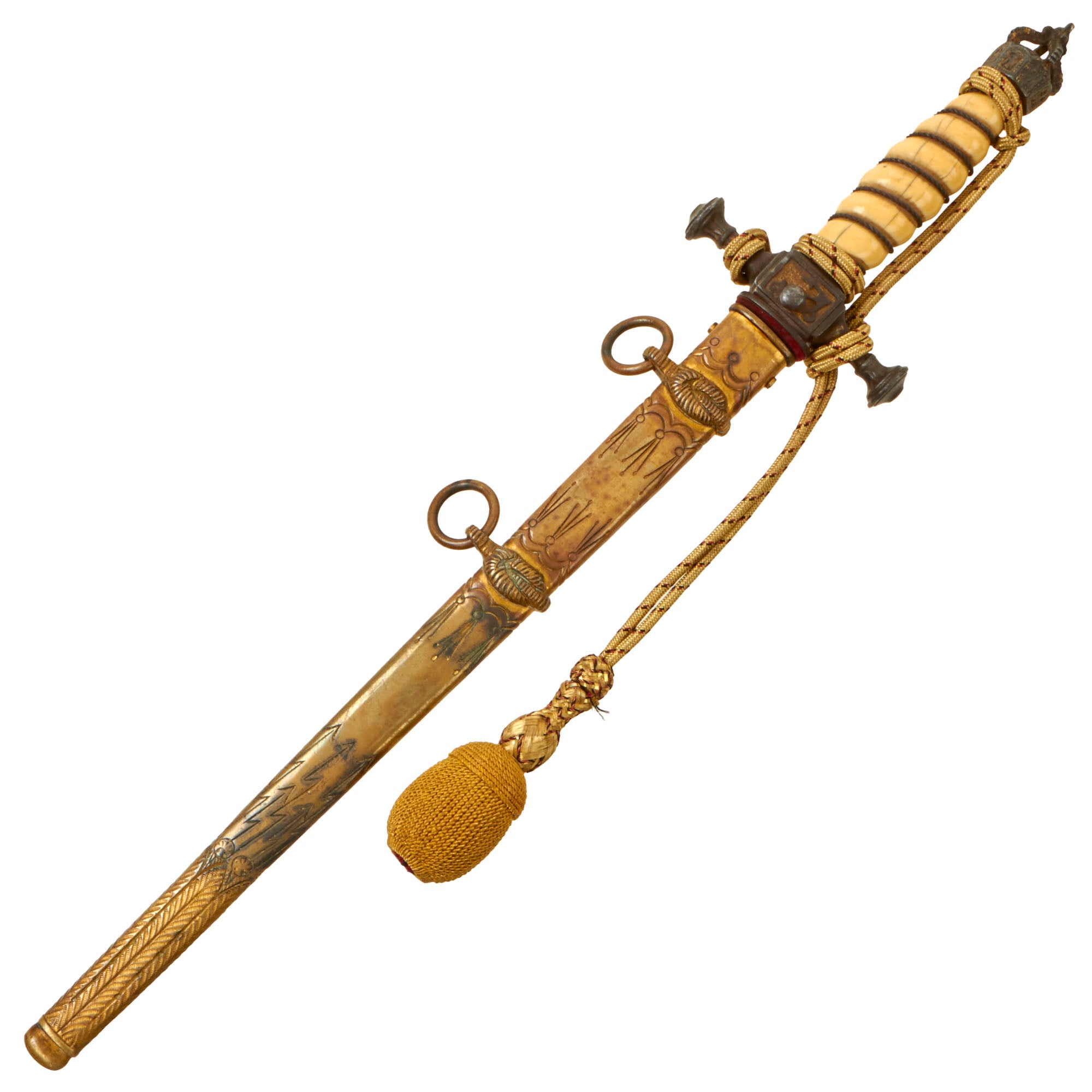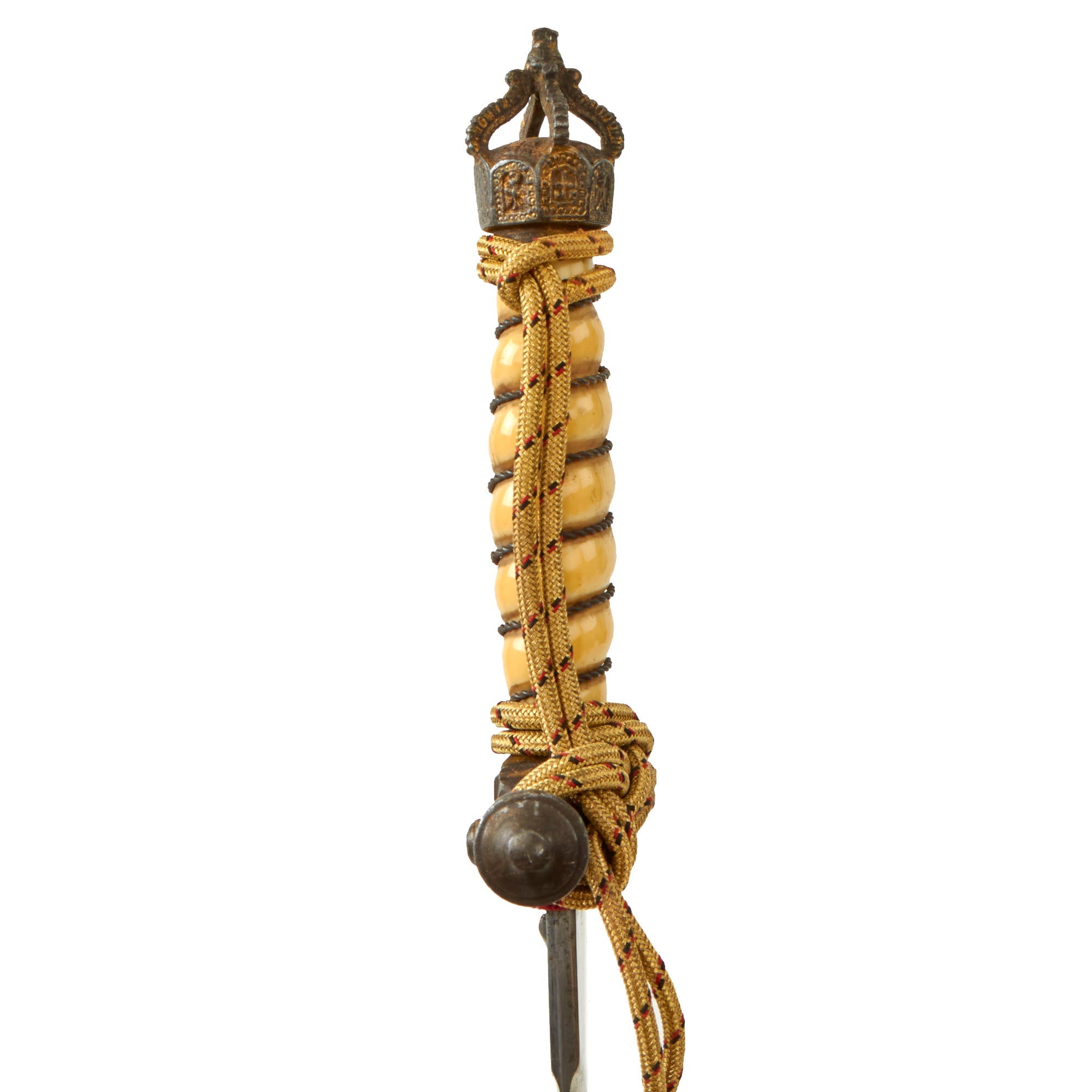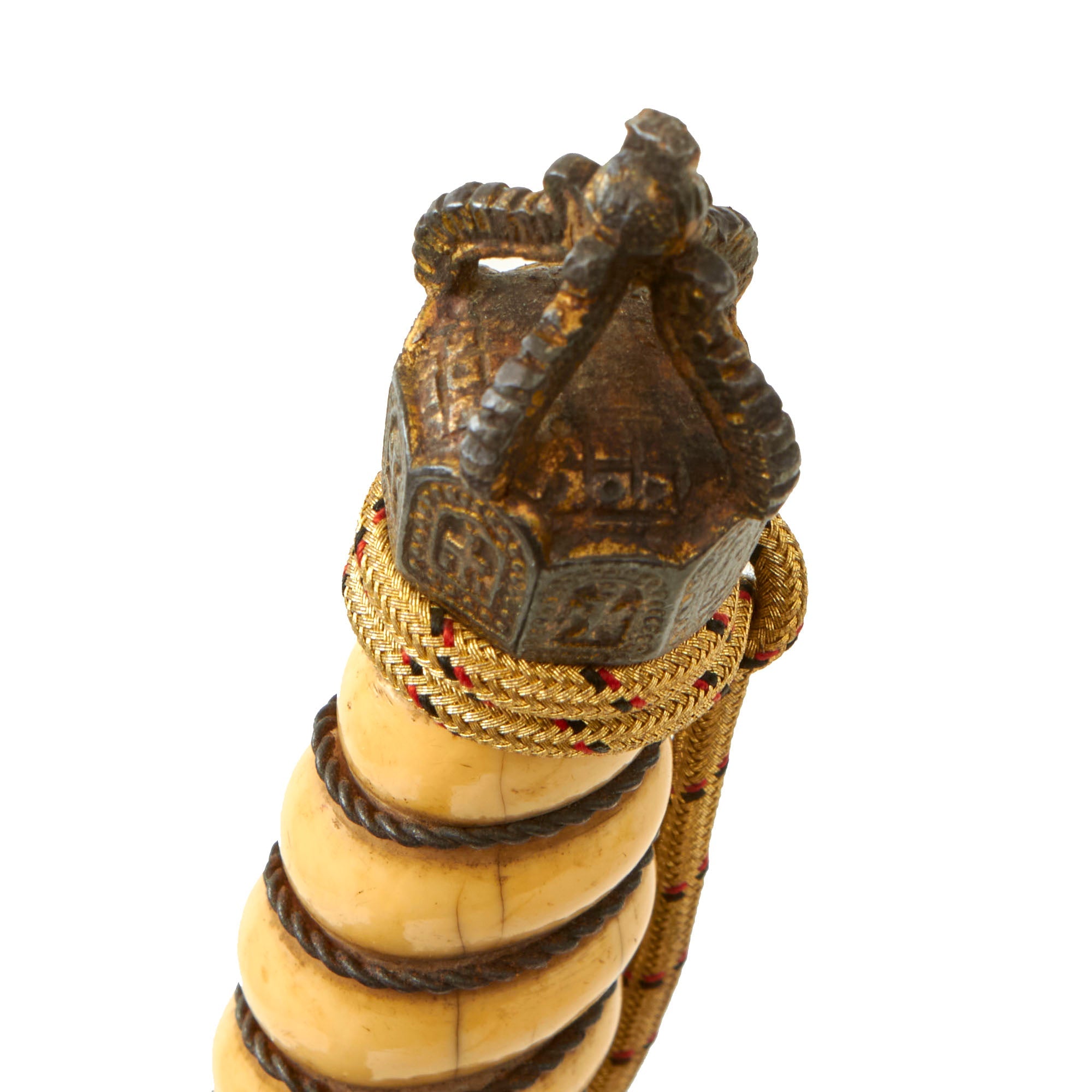 The "Deluxe" Model is equipped with an open Imperial Crown pommel attachment, as used during the German Imperial period, and features an ivory type grip, wrapped in bullion bound twisted brass wires. This dagger design would be phased out as the Weimar Period continued, and would be replaced by the Model 1929 with a ball pommel, which would remain the standard German Naval dagger until 1938, well into the NSDAP period.