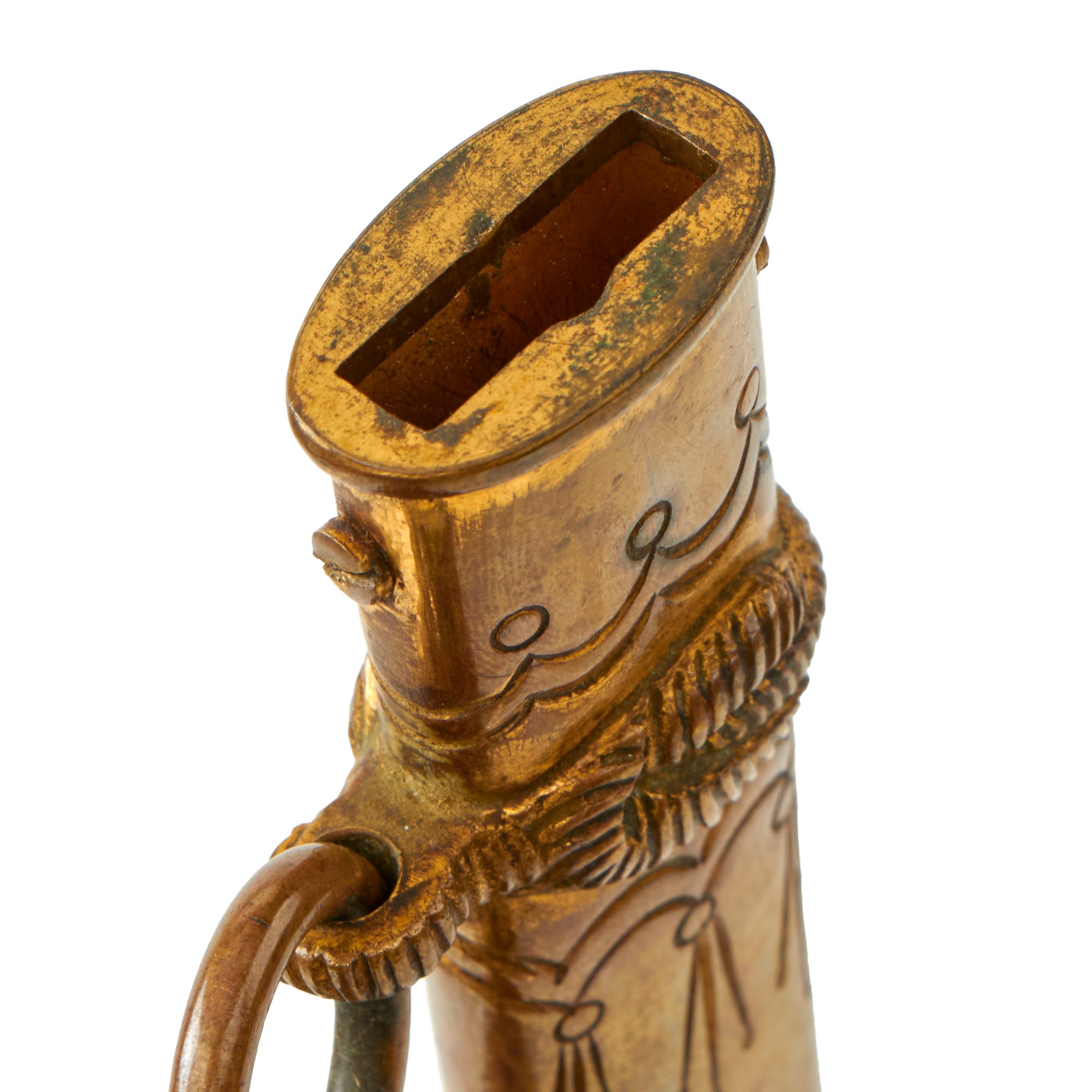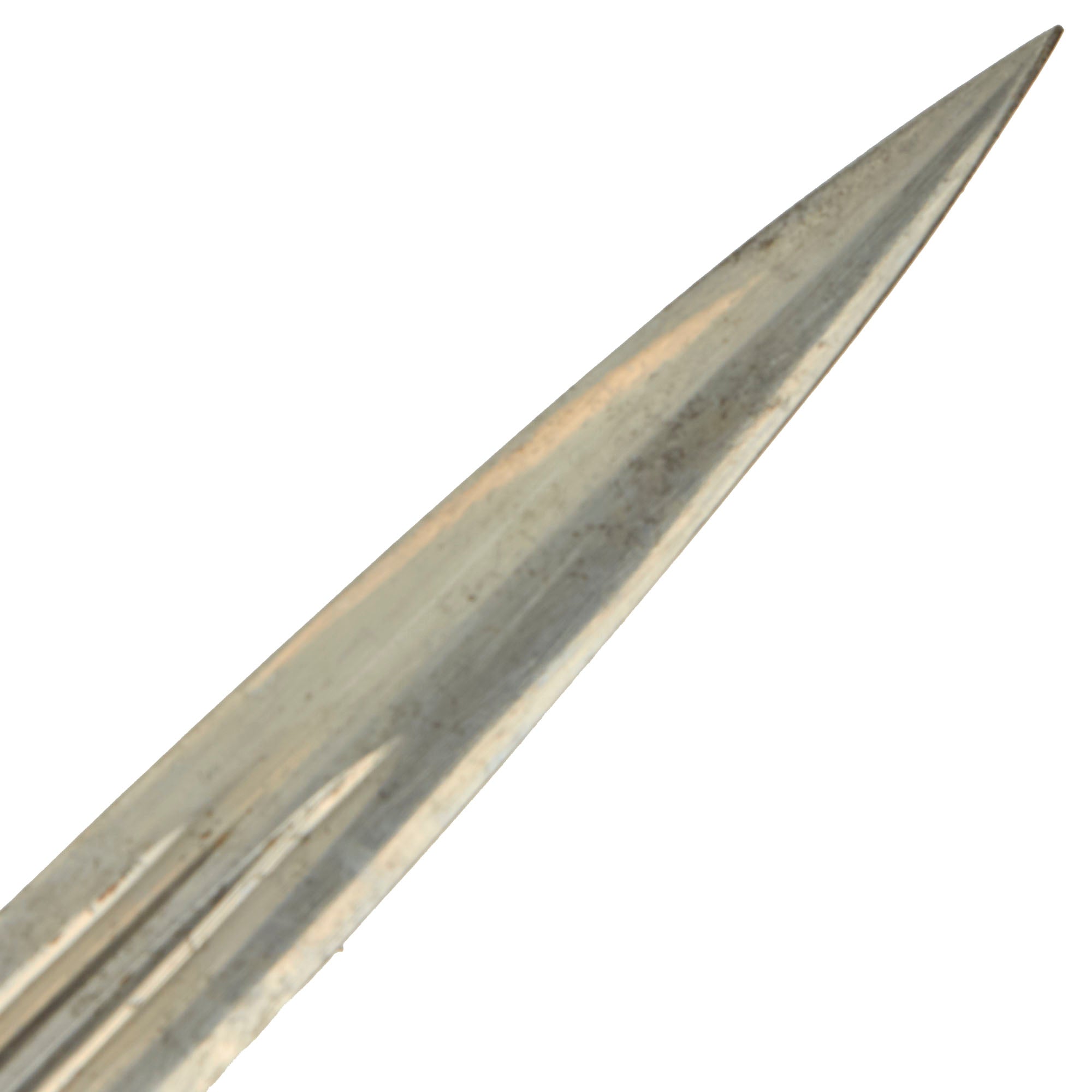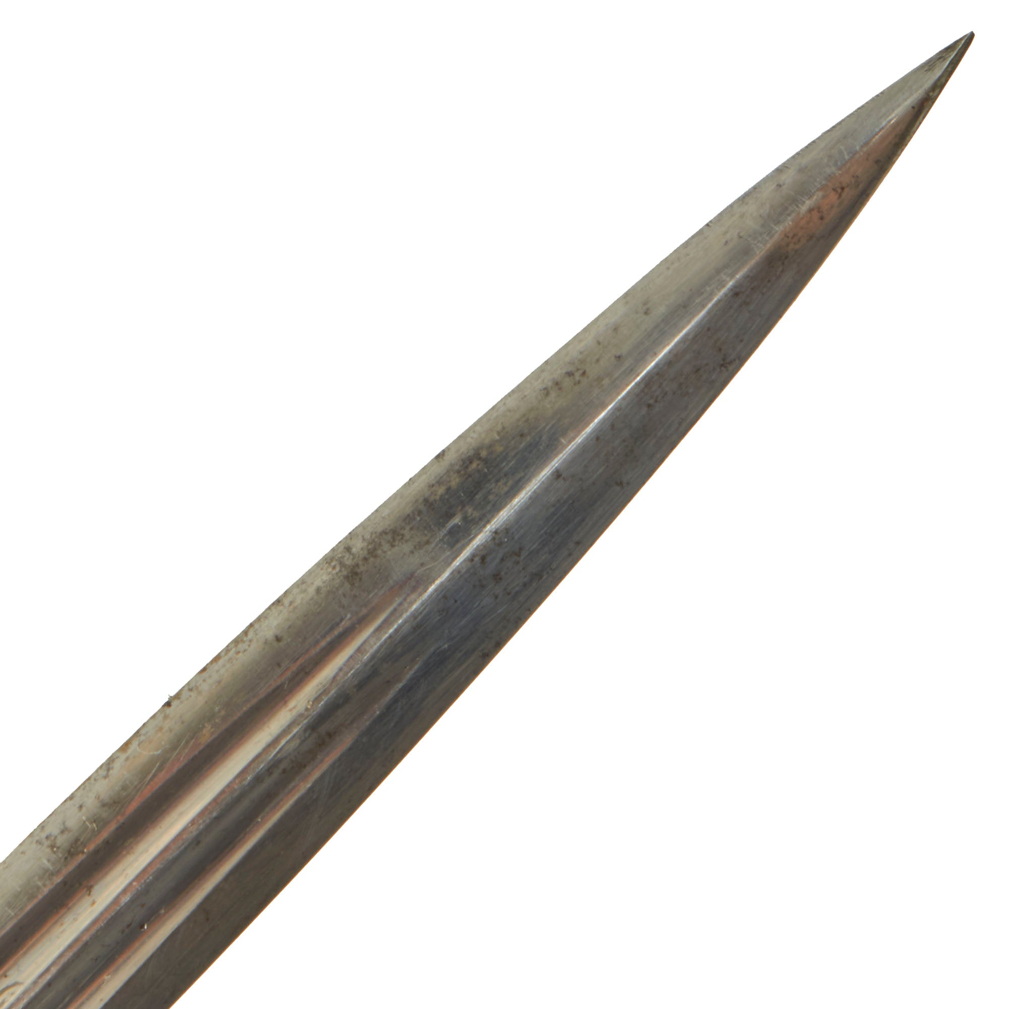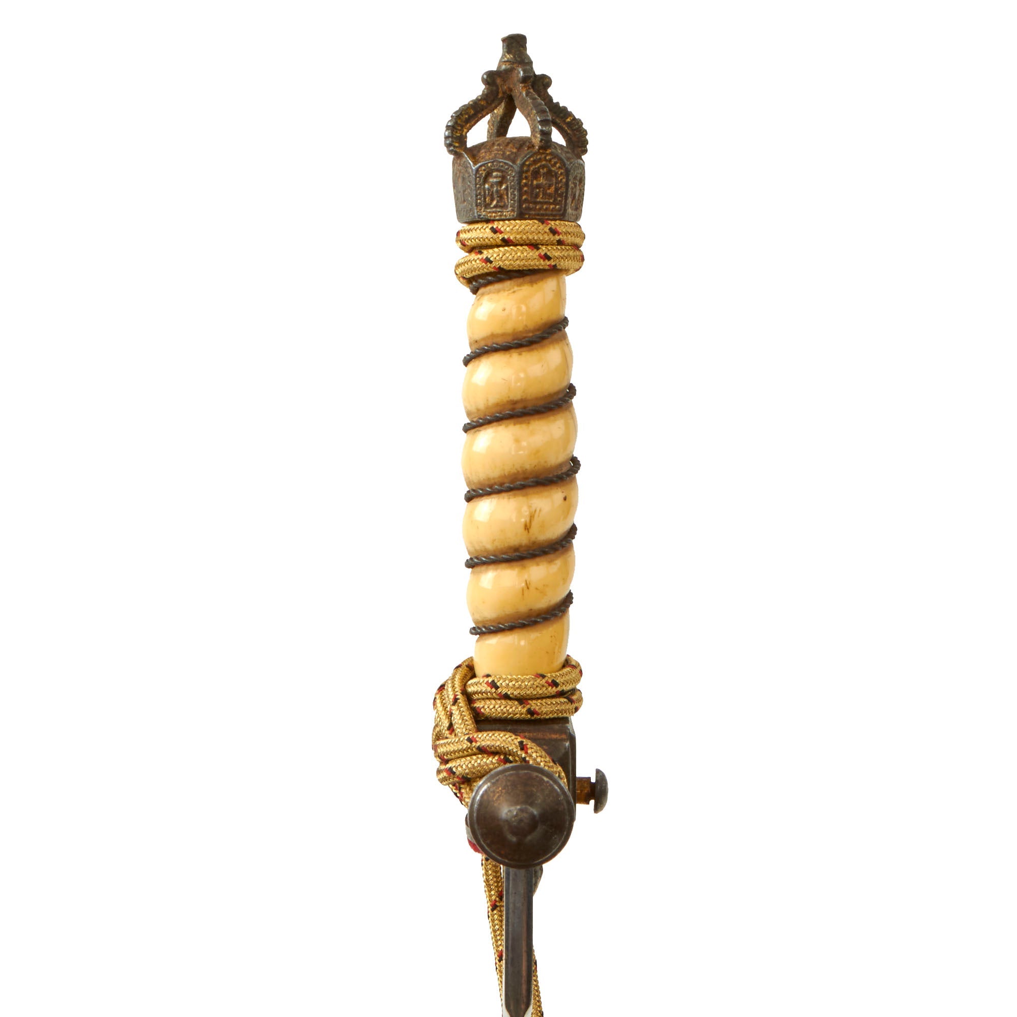 The "Deluxe" Model is equipped with an open Imperial Crown pommel attachment, as used during the German Imperial period, and features an ivory type grip, wrapped in bullion bound twisted brass wires. This dagger design would be phased out as the Weimar Period continued, and would be replaced by the Model 1929 with a ball pommel, which would remain the standard German Naval dagger until 1938, well into the NSDAP period.