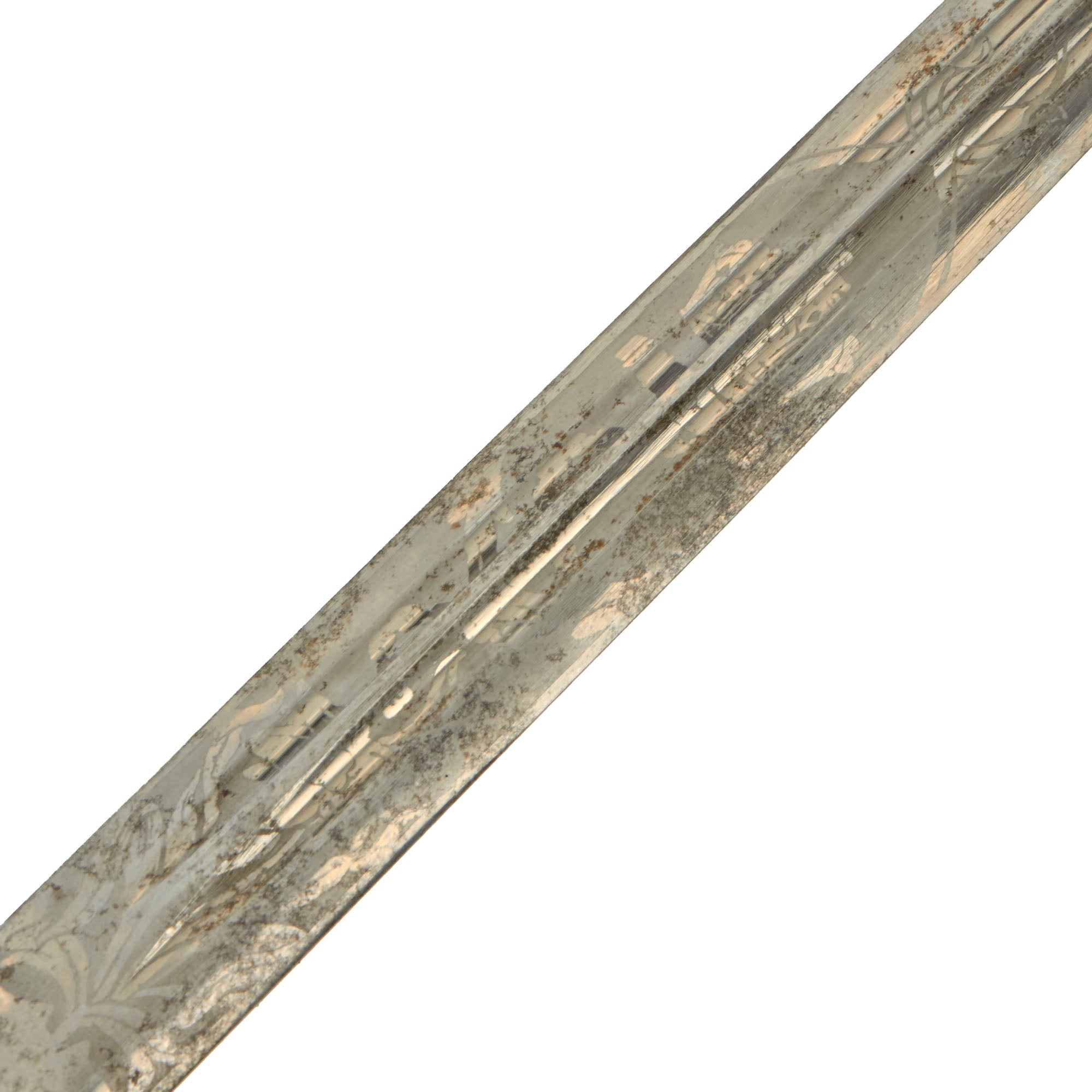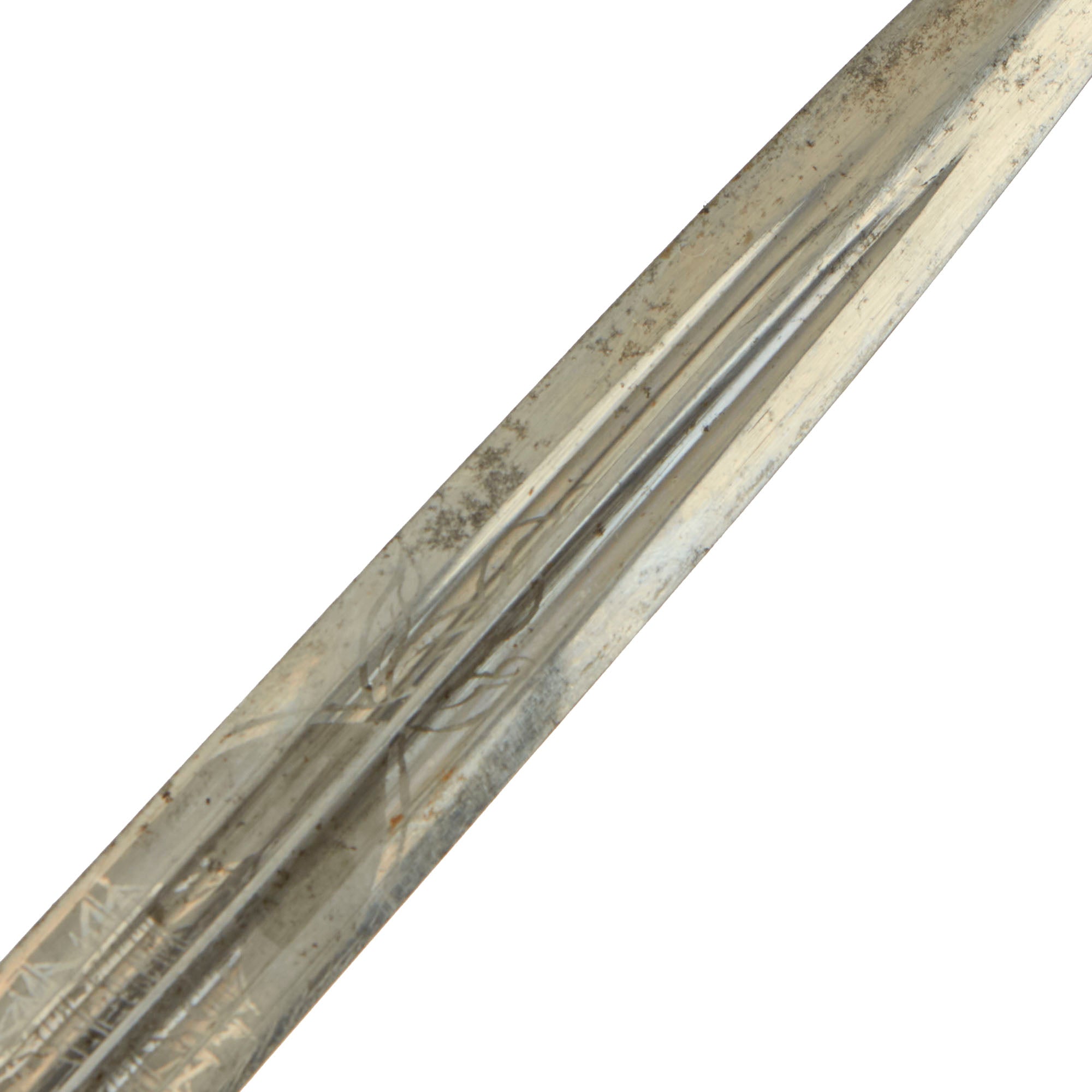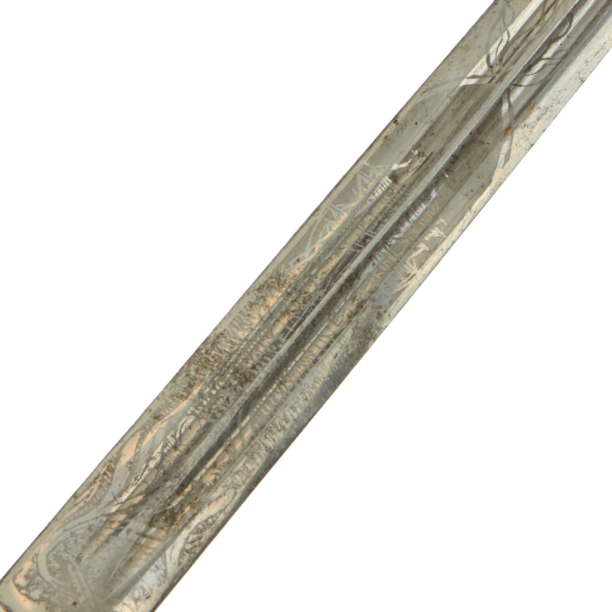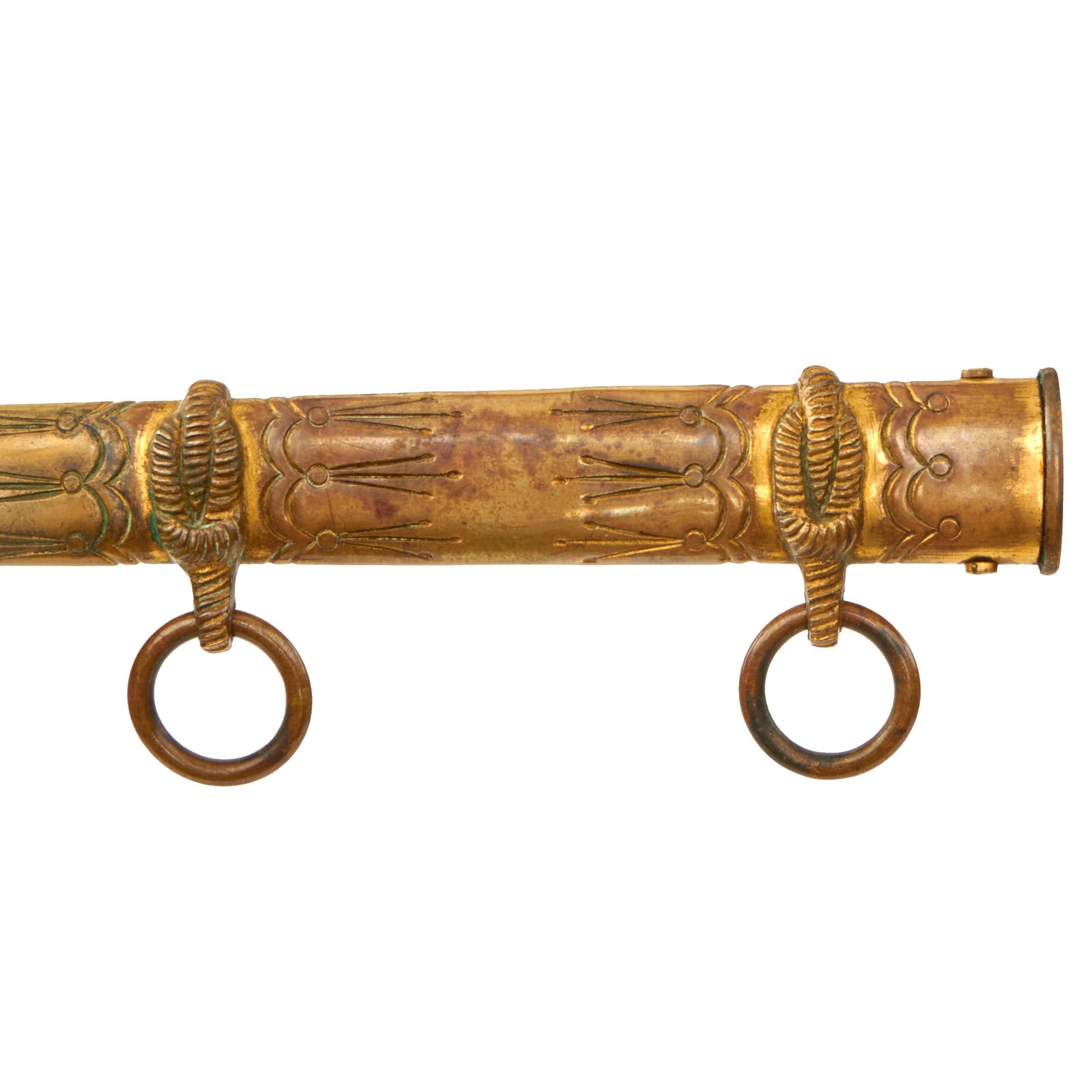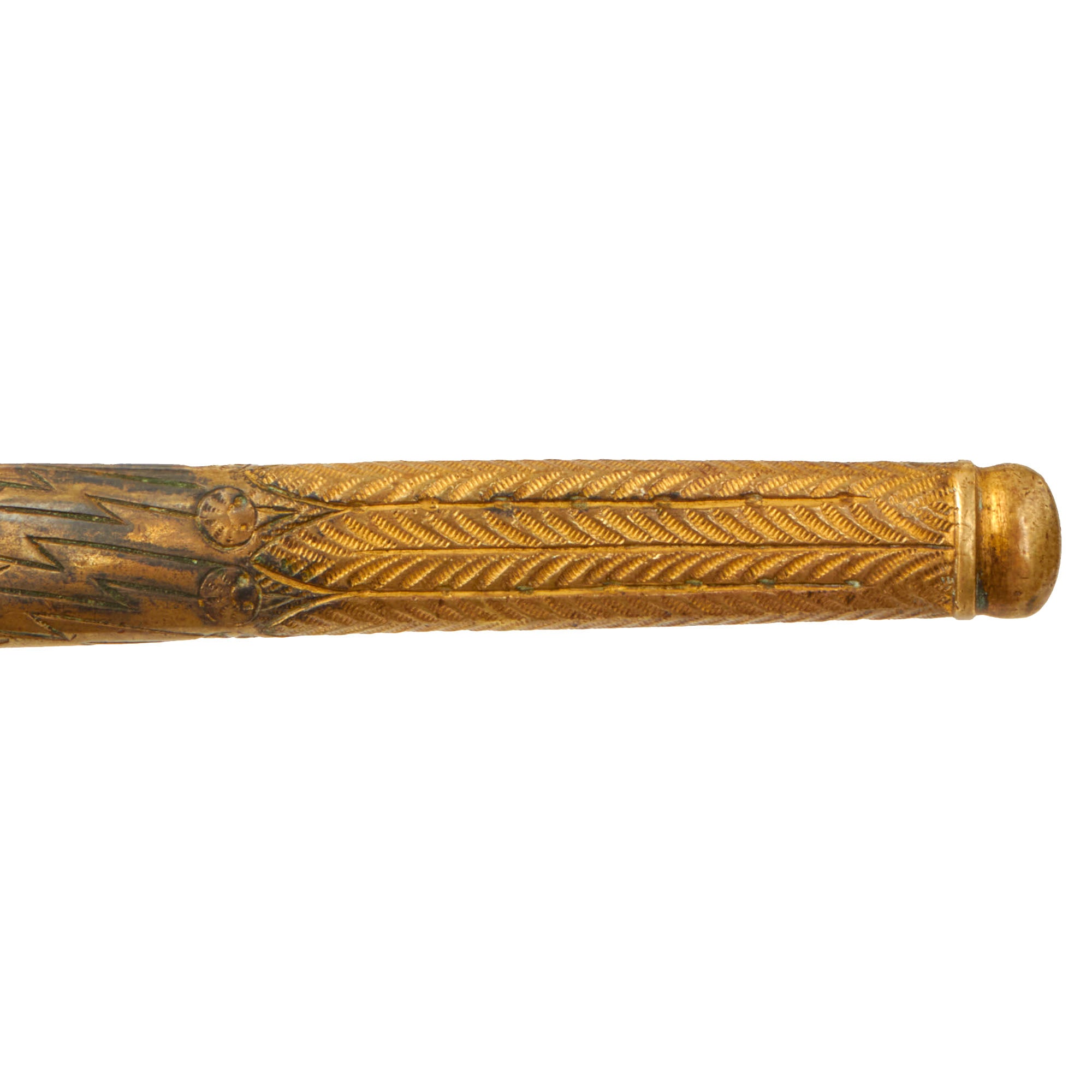 The-brass scabbard is in very good used condition, with a lovely patina of age. The original gold plating is almost completely gone, as it was most likely "Mercury Gilt", which is the type that evaporates over time. The decorative etching on the body is still present and looks great. We cannot see any dents or bends in the scabbard, and the blade sheathes easily. The bands feature overlapping oak leaves and acorns, and are quite a bit more ornate than usually seen. The ring ferrules are the rarely seen oak leaf type, and the rings are still present. The throat is retained by two flush head screws on the narrow sides, which show no signs of turning.
