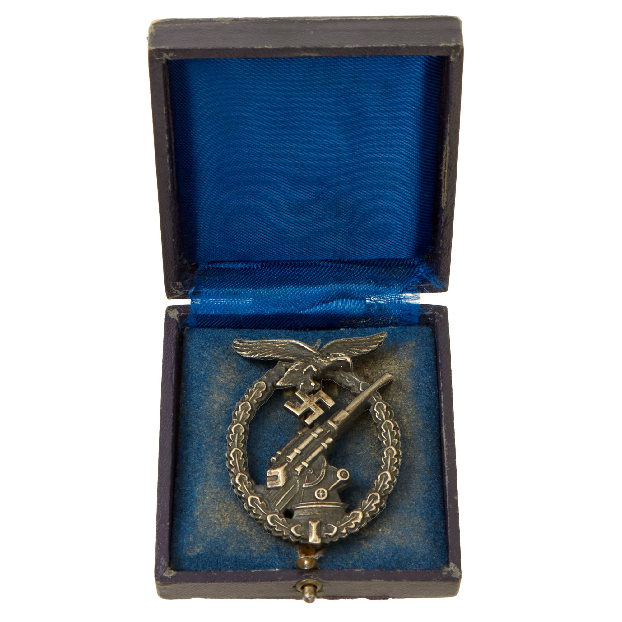 Original Item: Only One Available. This is a lovely Luftwaffe Anti-Aircraft Flak Battle Badge (Flak-Kampfabzeichen der Luftwaffe), complete with a very rare original presentation case! It is a textbook example, consisting of an oak leaf wreath, with a ribbon on the bottom, and a Luftwaffe eagle on the top of the badge, clutching a swas, and a Flak 88 facing towards the top right, with the barrel extending past the badge. It looks to be an early war example made from Tombak alloy, which was then silver plated and blacked to give it a great antiqued look. It is a solid back design, with a nice slightly vaulted contour.