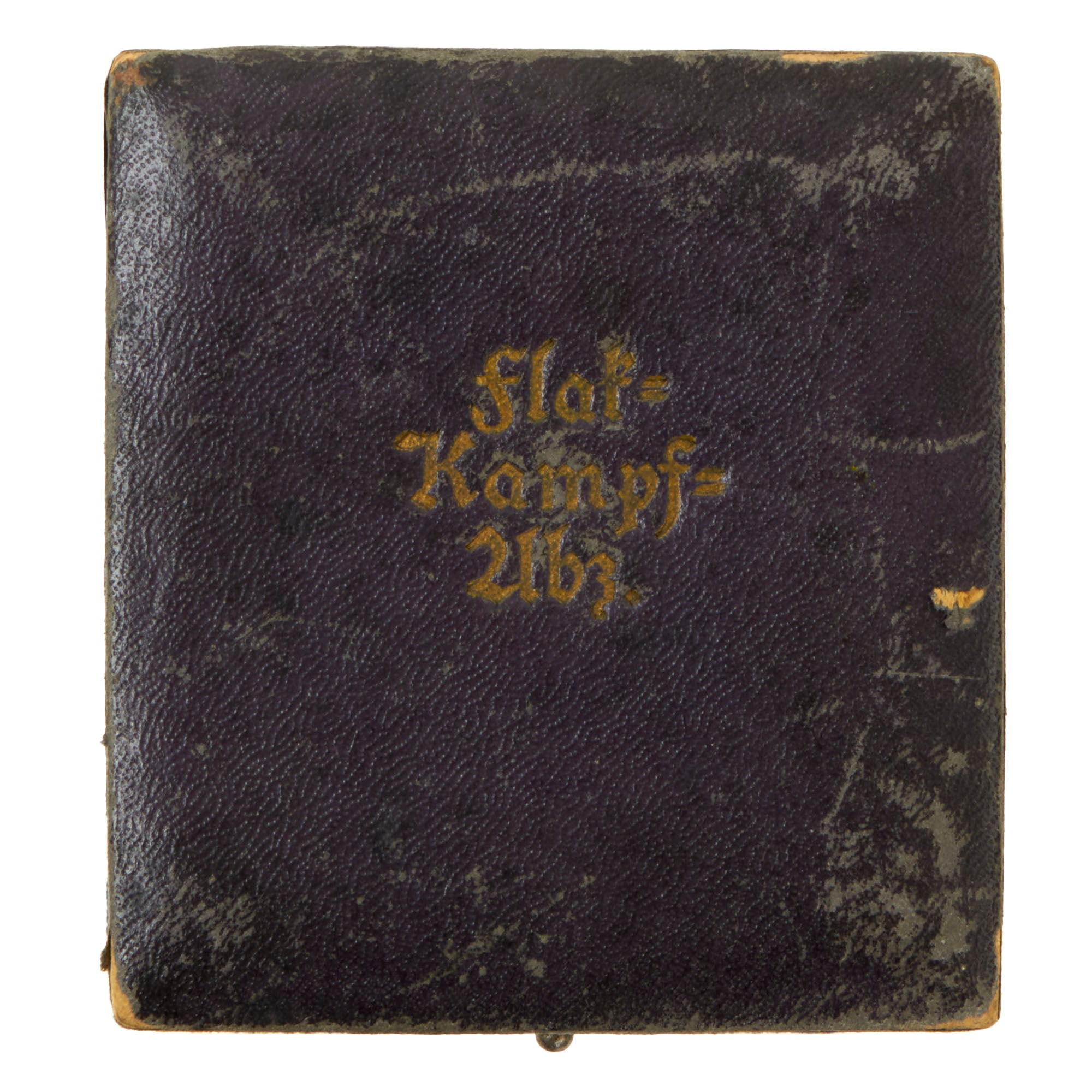 The original dark blue leatherette case is in very good intact condition, with a functional hinge and front catch. It is embossed on the top with Flak=Kampf=Abz. in German "Black Letter" type, and the interior has an inlet blue plush material bottom that holds the badge in place. The inside of the lid is lined with lovely blue rayon, which is also present over the hinge, though that area has started to fray.