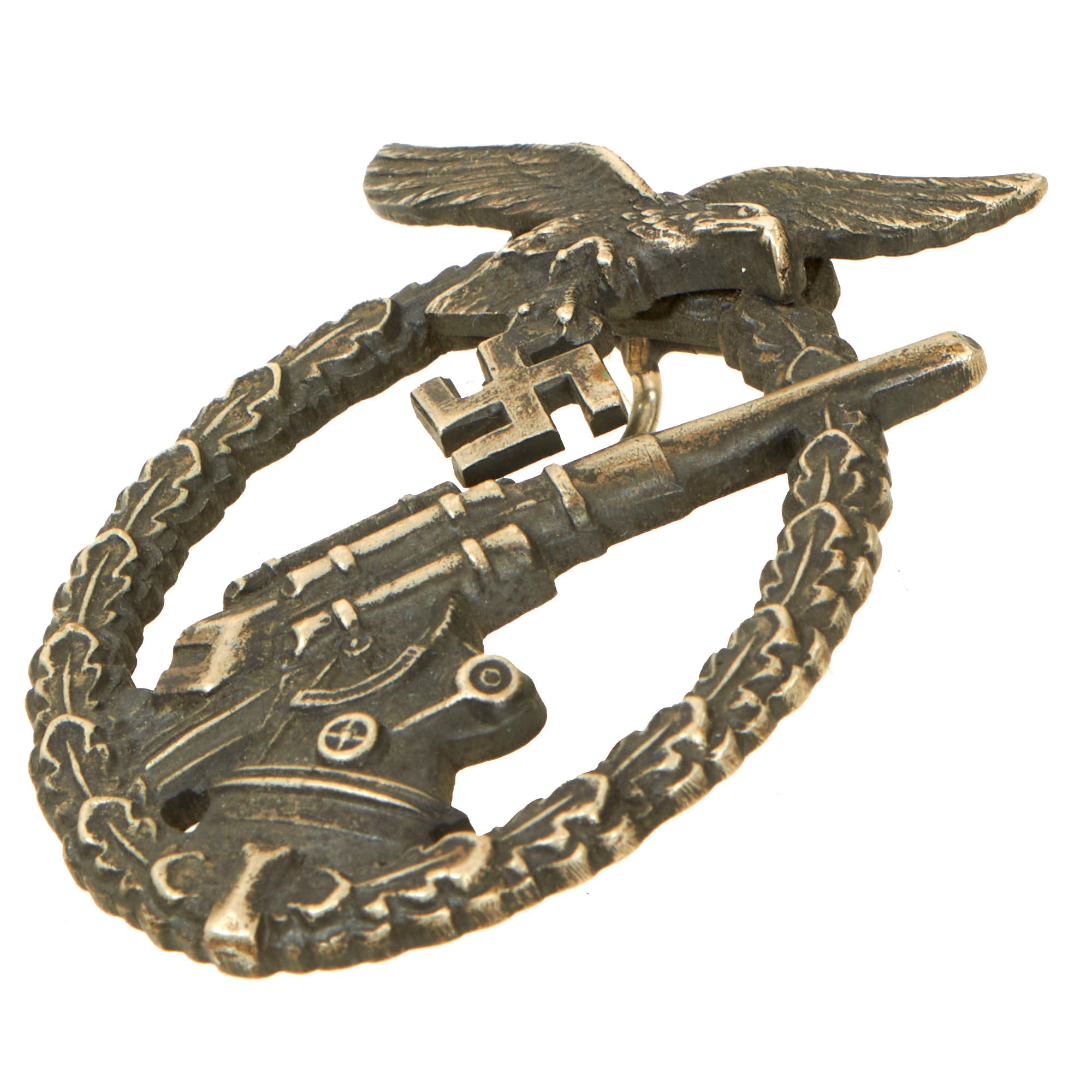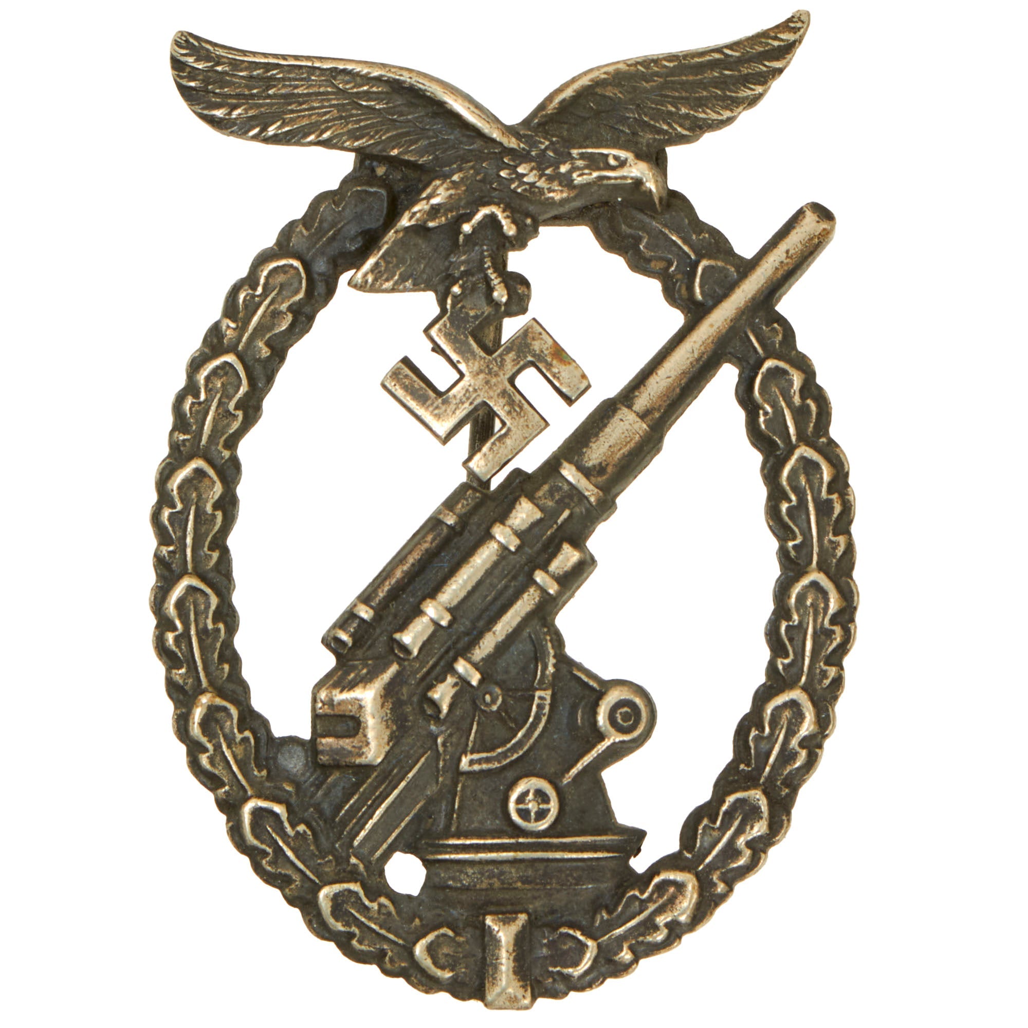 Designed by Wilhelm Ernst Peekhaus, the badge was of single piece construction with a pin back and clasp. It was made in one grade; it had a Luftwaffe eagle at the top, and an oak leaf wreath around the outside rim. In the middle was an 88 mm flak gun with the barrel facing upwards to the right. The badge was worn on the lower part of the left breast pocket of the service tunic, underneath the 1st class Iron Cross if awarded.