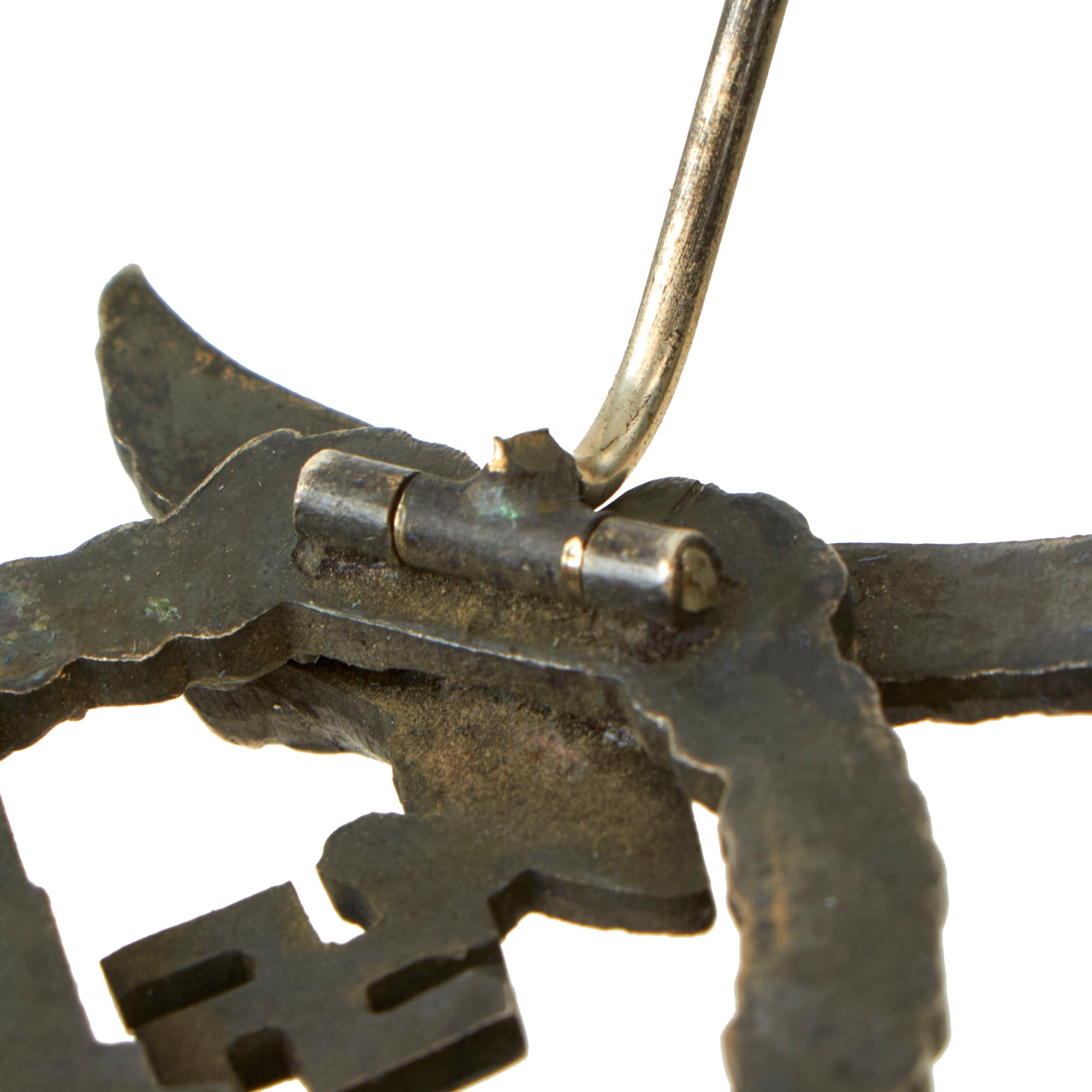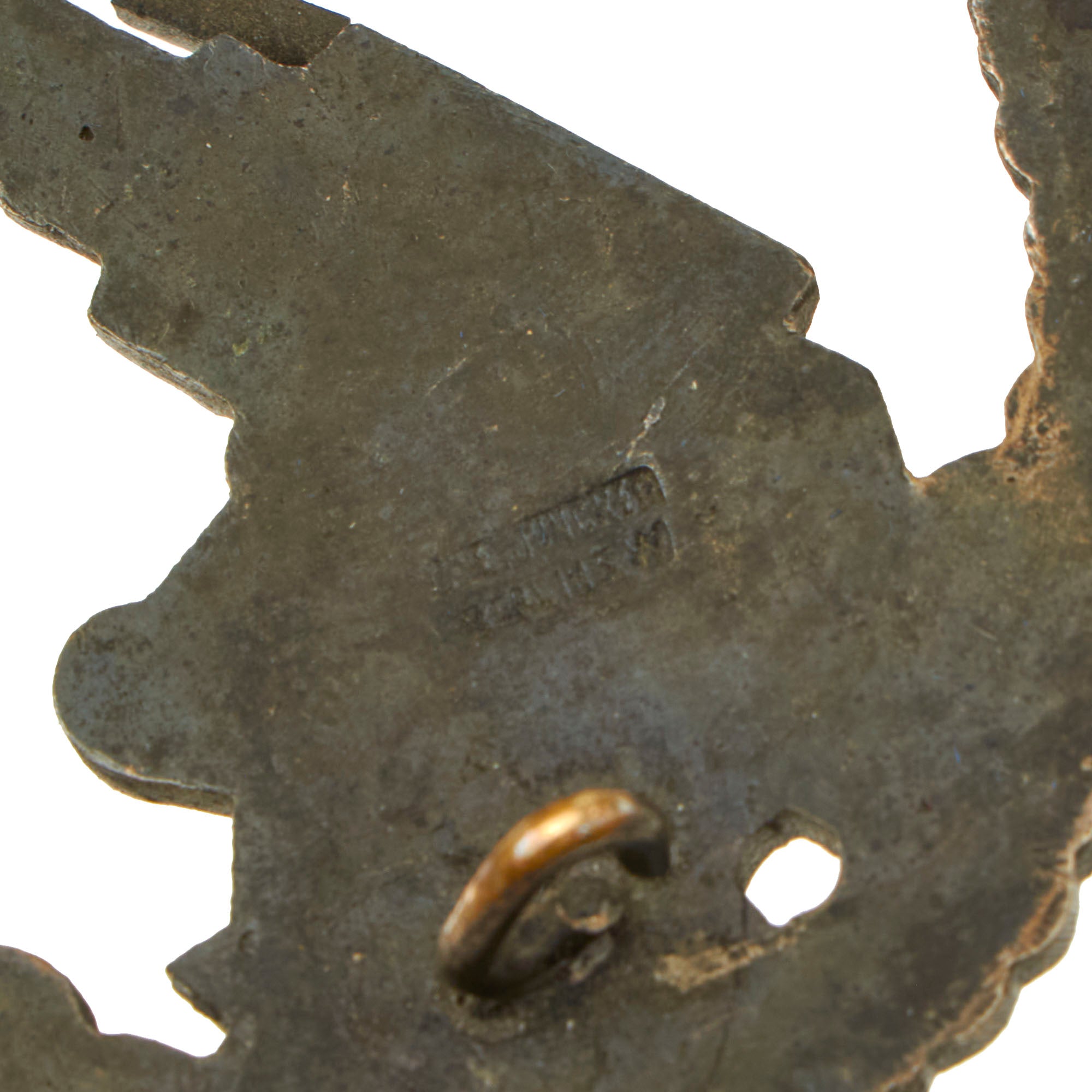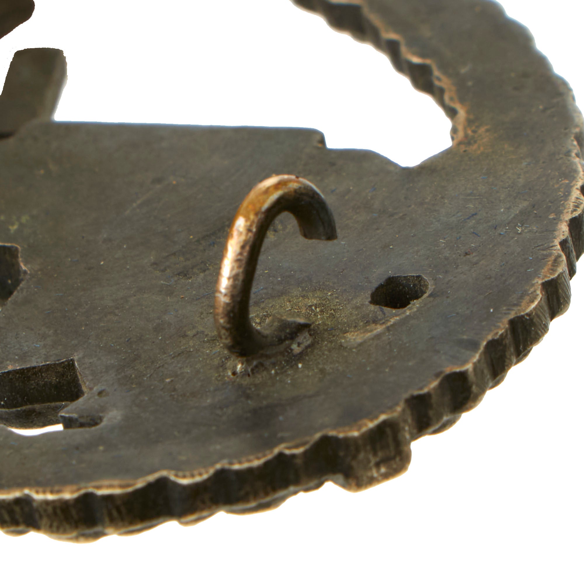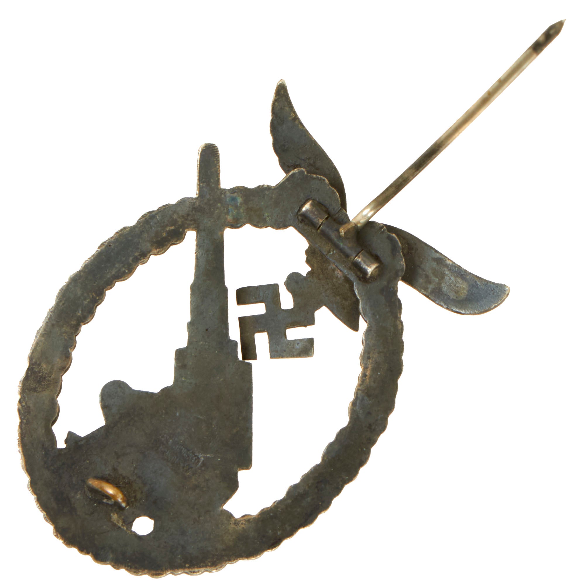 The reverse is plain with a hinge and vertical pinback meeting a round wire catch. It is maker marked by C.E. JUNCKER / BERLIN S.W. on the back in the middle of the Flak 88, for the well known top class German badge maker. Medal measures approximately 1.75 inches (44.80 mm) x 2.4 inches (60.02 mm) weighing 31.0 grams. Offered in very good condition, the badge has a lovely dark tarnished patina, showing much of the original silvering present. The raised areas are worn bright, giving it a fantastic look.