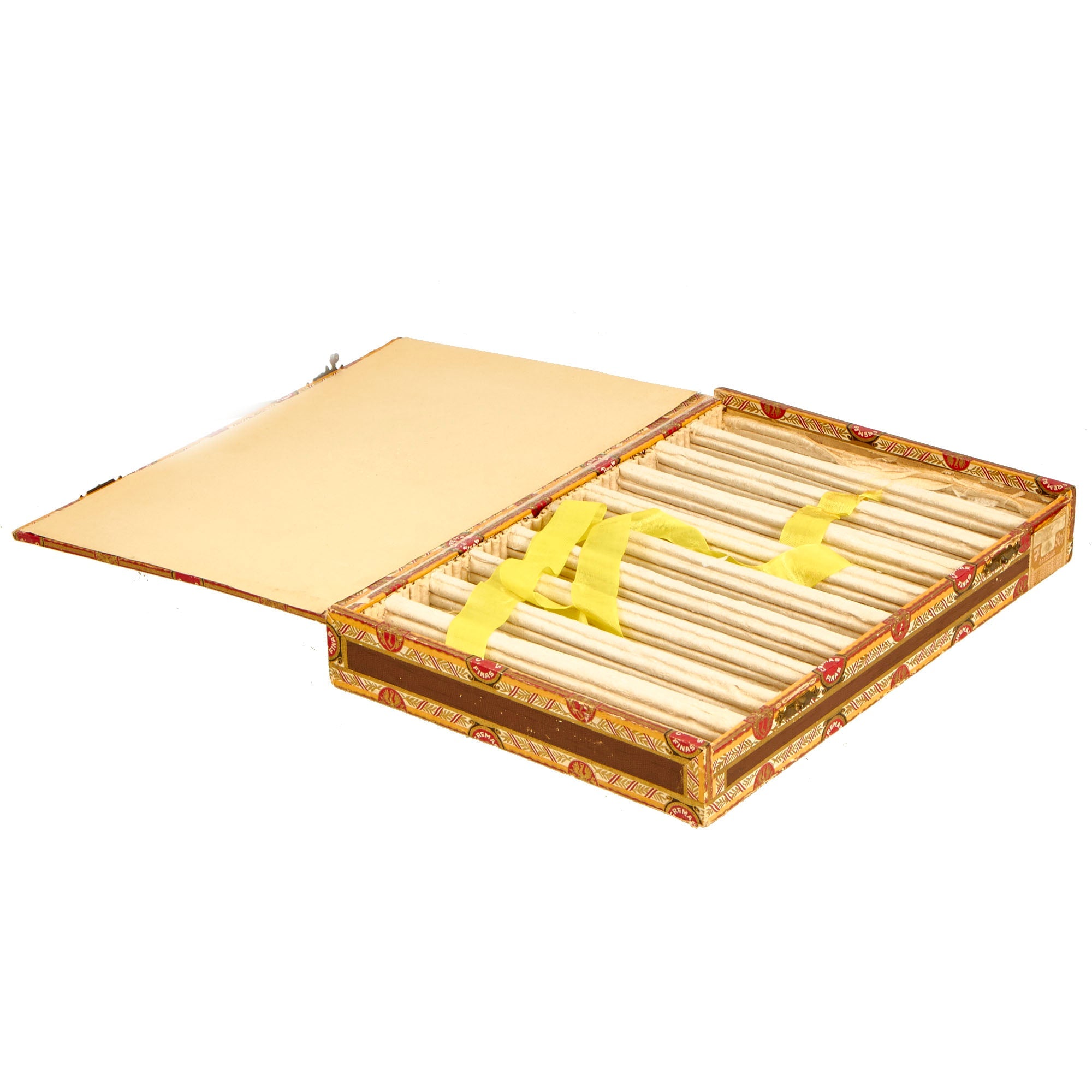 This gives the maker of the the cigars on the bottom line, and indicates that they were custom made for the Reichsmarschall himself. We have compared this box to other known examples, including some that still have cigars, and it is definitely genuine. It measures 11 5/8" x 7 7/8" x 1 1/2", and looks t be made from wood covered with paper. It still has the internal dividers for the cigars, as well as the yellow strip of fabric to pull out the cigars. It even has the original cardboard padding and liner paper bearing a raised Göring crest.