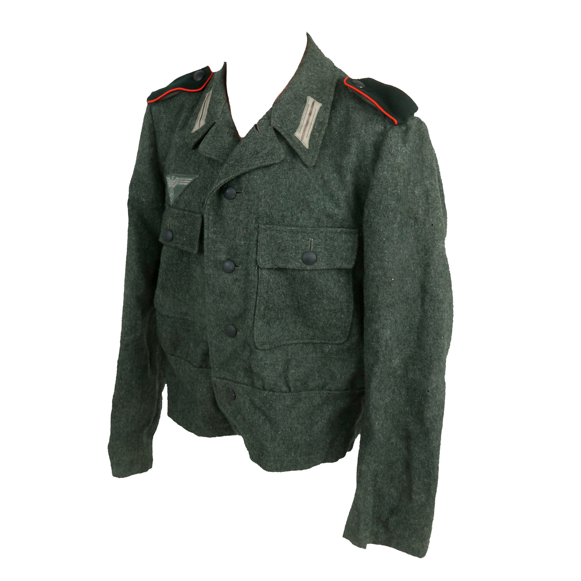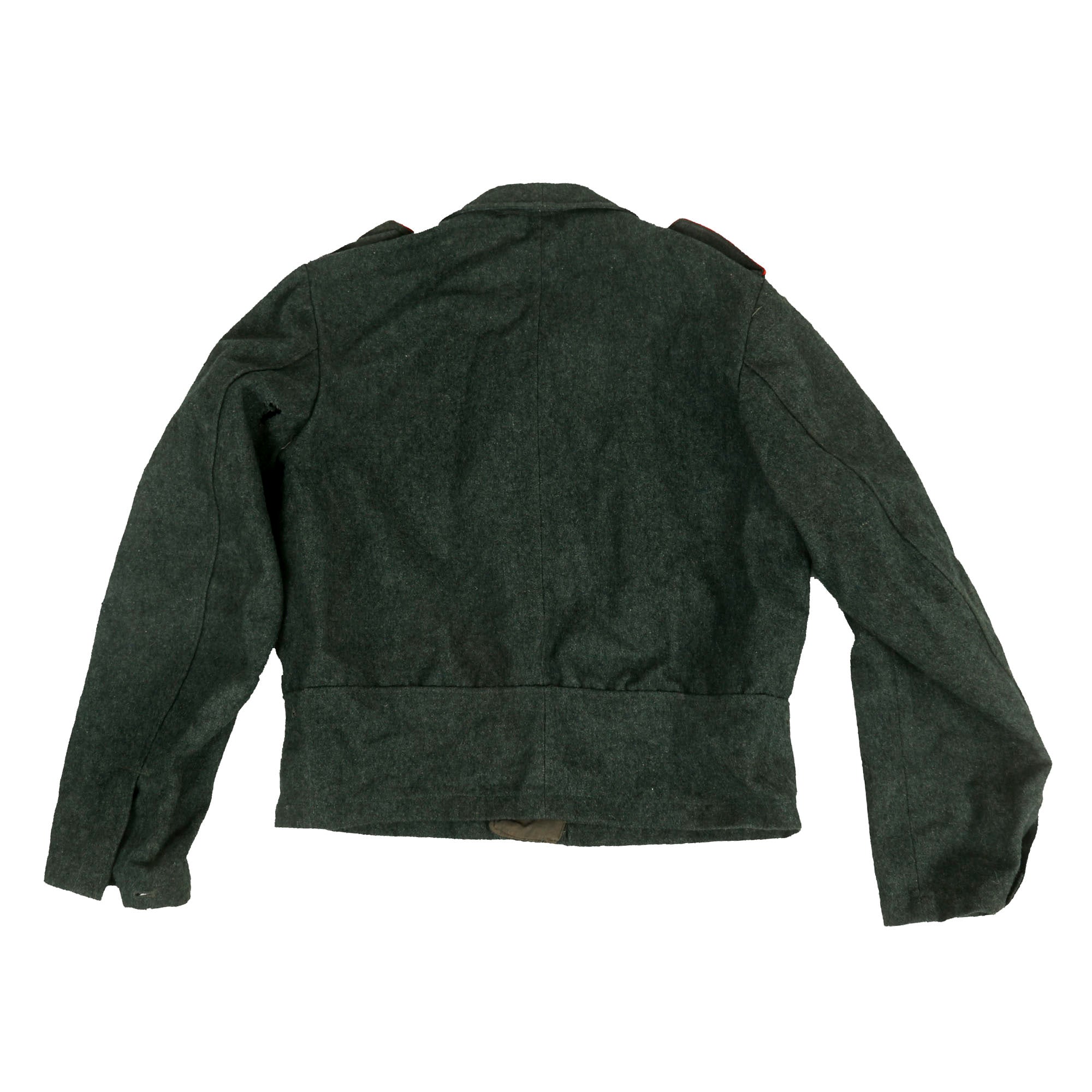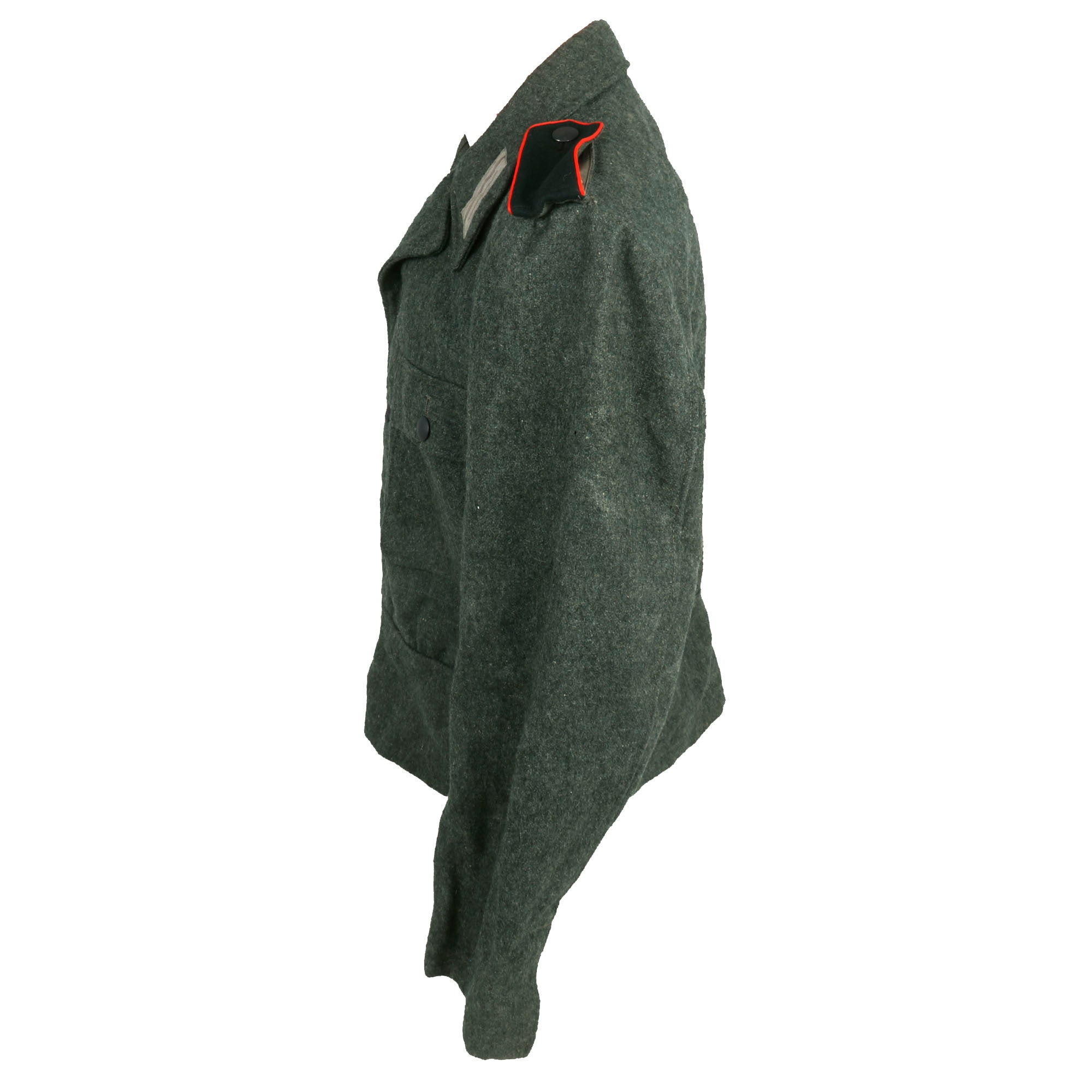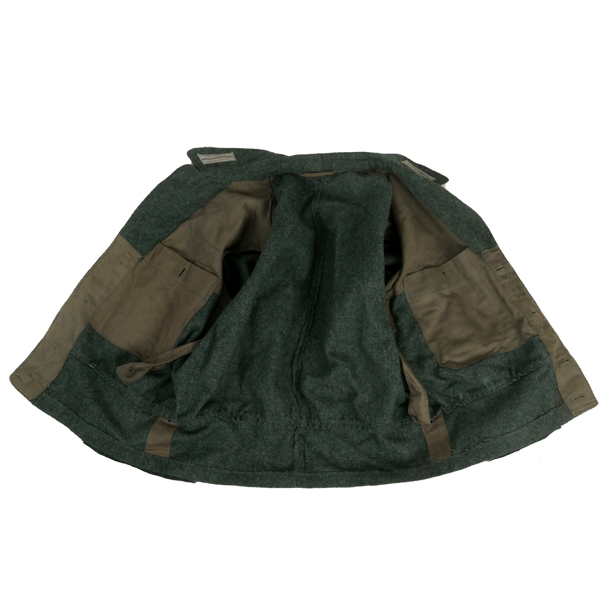 Original Item: Only One Available. Towards the end of the Second World War in late 1944, Germany was looking to to cut down on tailoring and production costs as material shortages continued to mount. The Wehrmacht's answer to this issue was the introduction of the M44 pattern uniform. Similar in appearance to the British Battle Dress or the related US “Ike” jacket, the M44 was unlike any other German pattern uniform, and the first major deviation in uniform design since 1936. The front still featured the button front closure, but the the tunic skirt was shortened to waist length, the number of pockets was reduced to two. The tunic could be worn with an open or closed collar.
