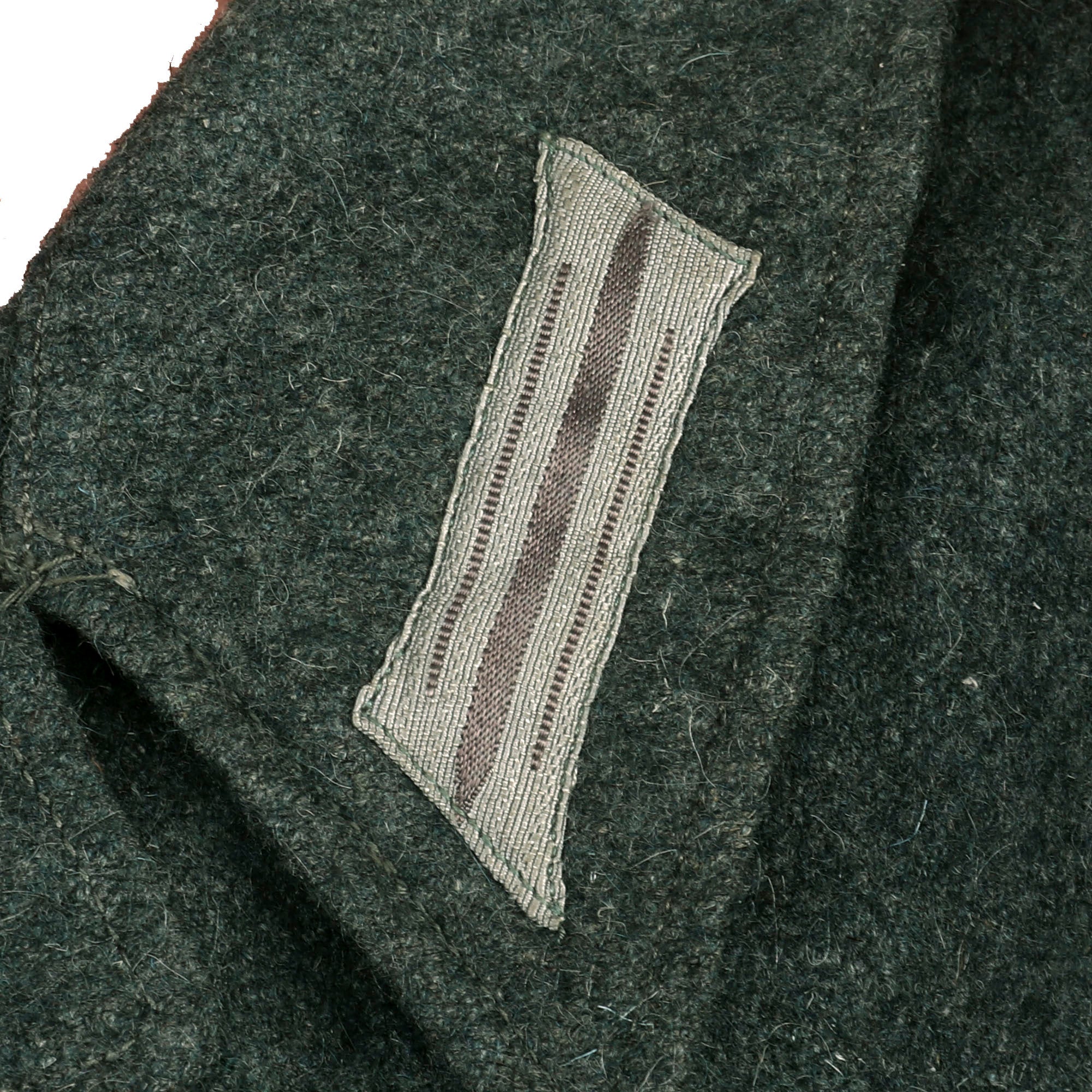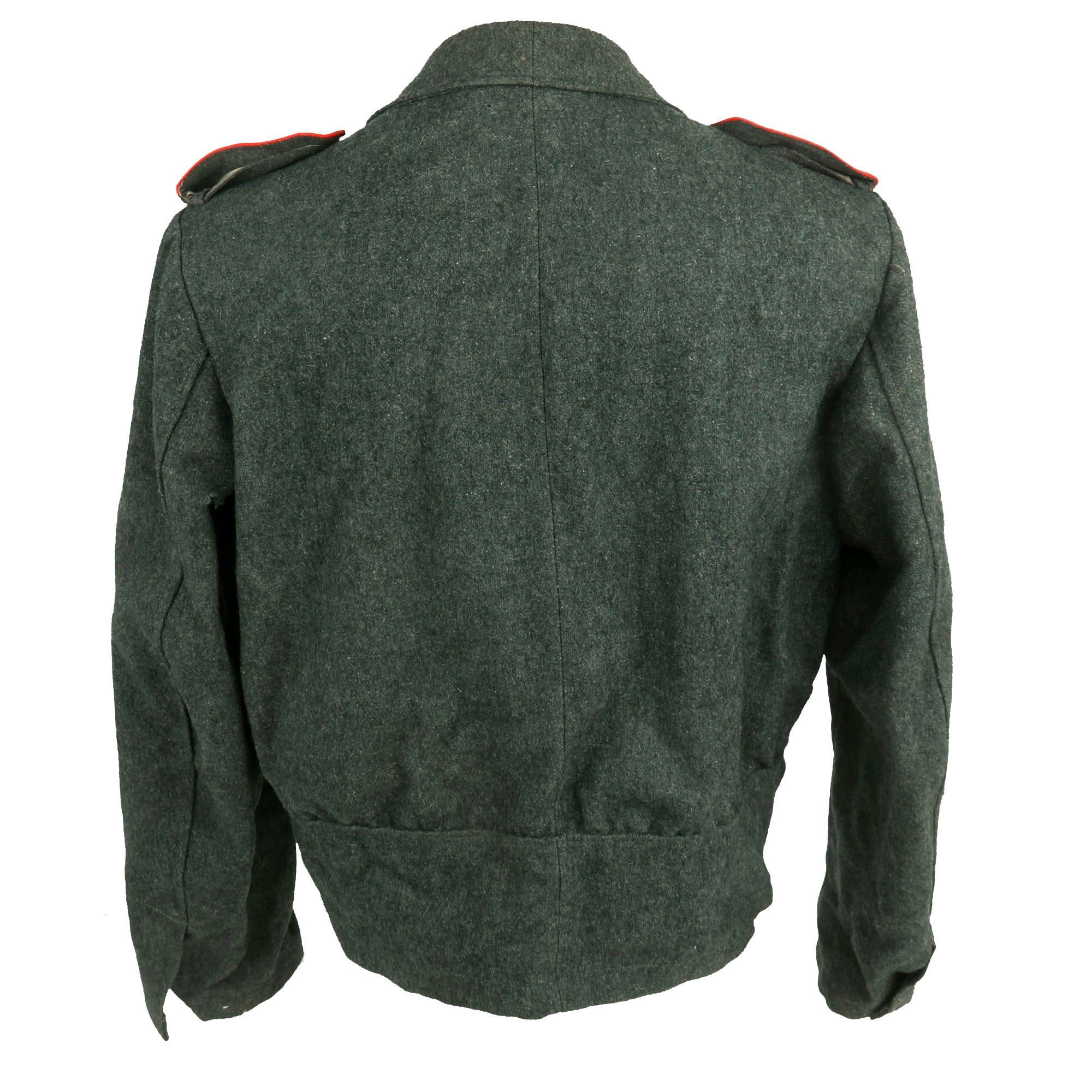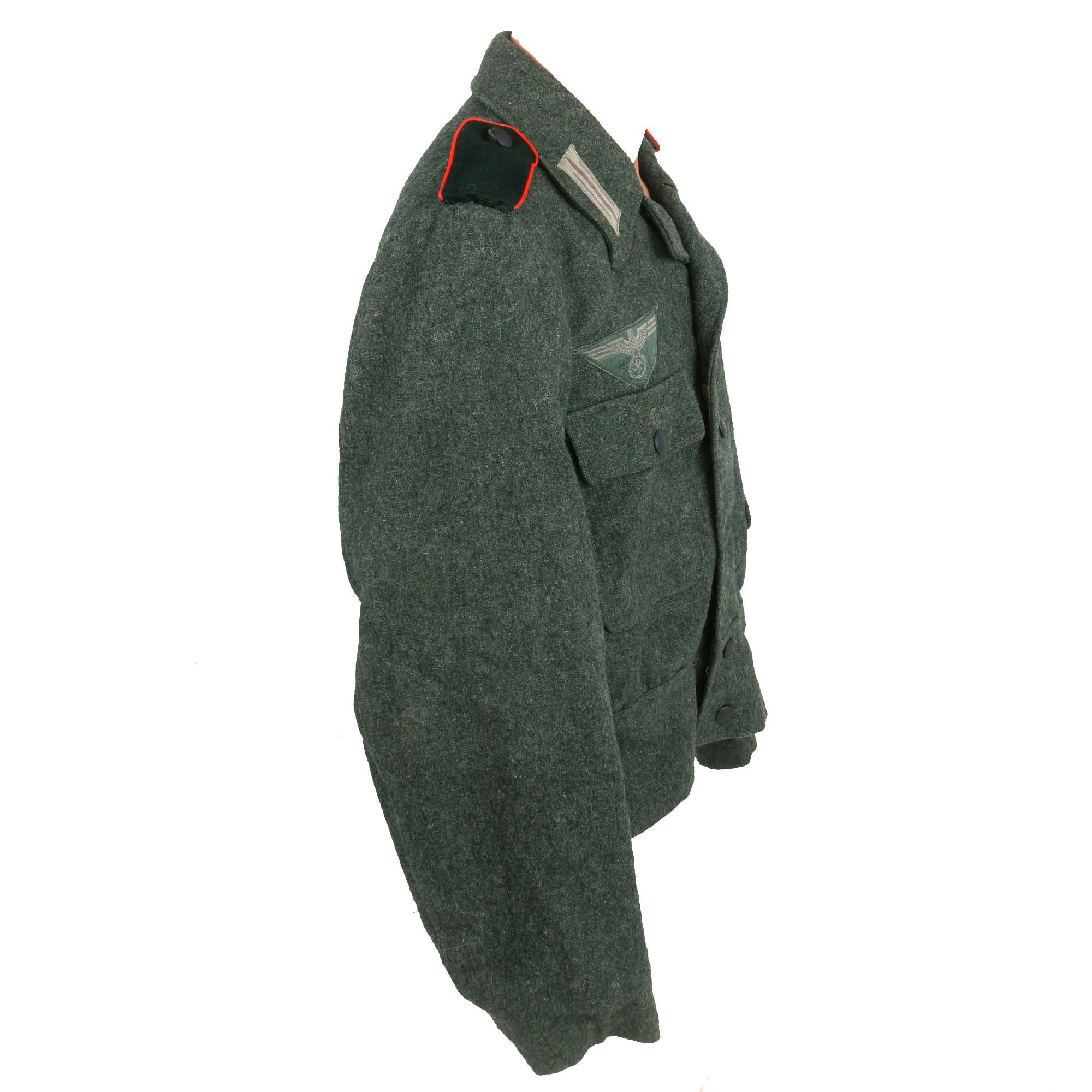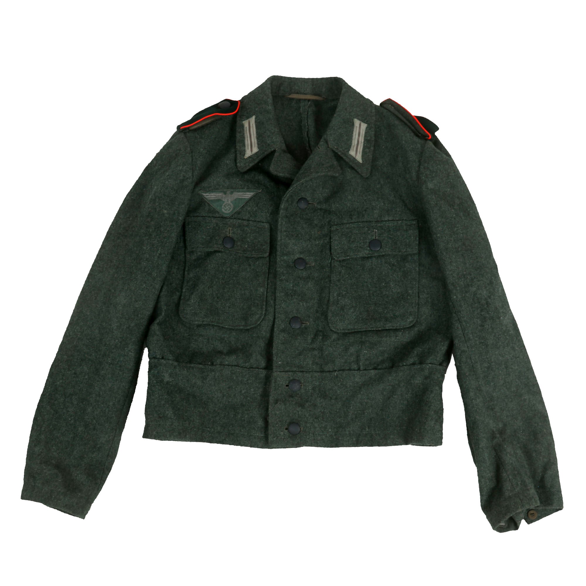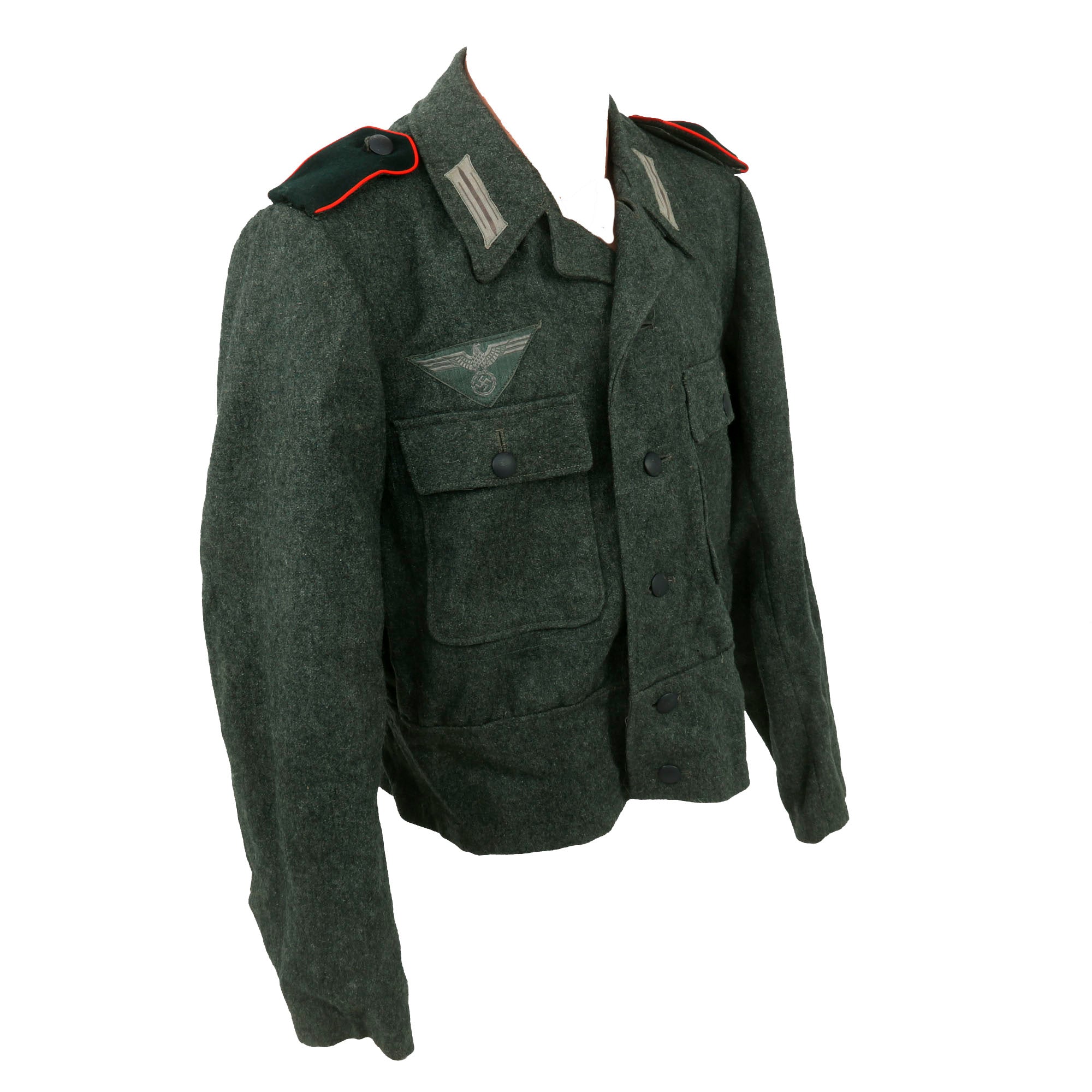 Original Item: Only One Available. Towards the end of the Second World War in late 1944, Germany was looking to to cut down on tailoring and production costs as material shortages continued to mount. The Wehrmacht's answer to this issue was the introduction of the M44 pattern uniform. Similar in appearance to the British Battle Dress or the related US “Ike” jacket, the M44 was unlike any other German pattern uniform, and the first major deviation in uniform design since 1936. The front still featured the button front closure, but the the tunic skirt was shortened to waist length, the number of pockets was reduced to two. The tunic could be worn with an open or closed collar.