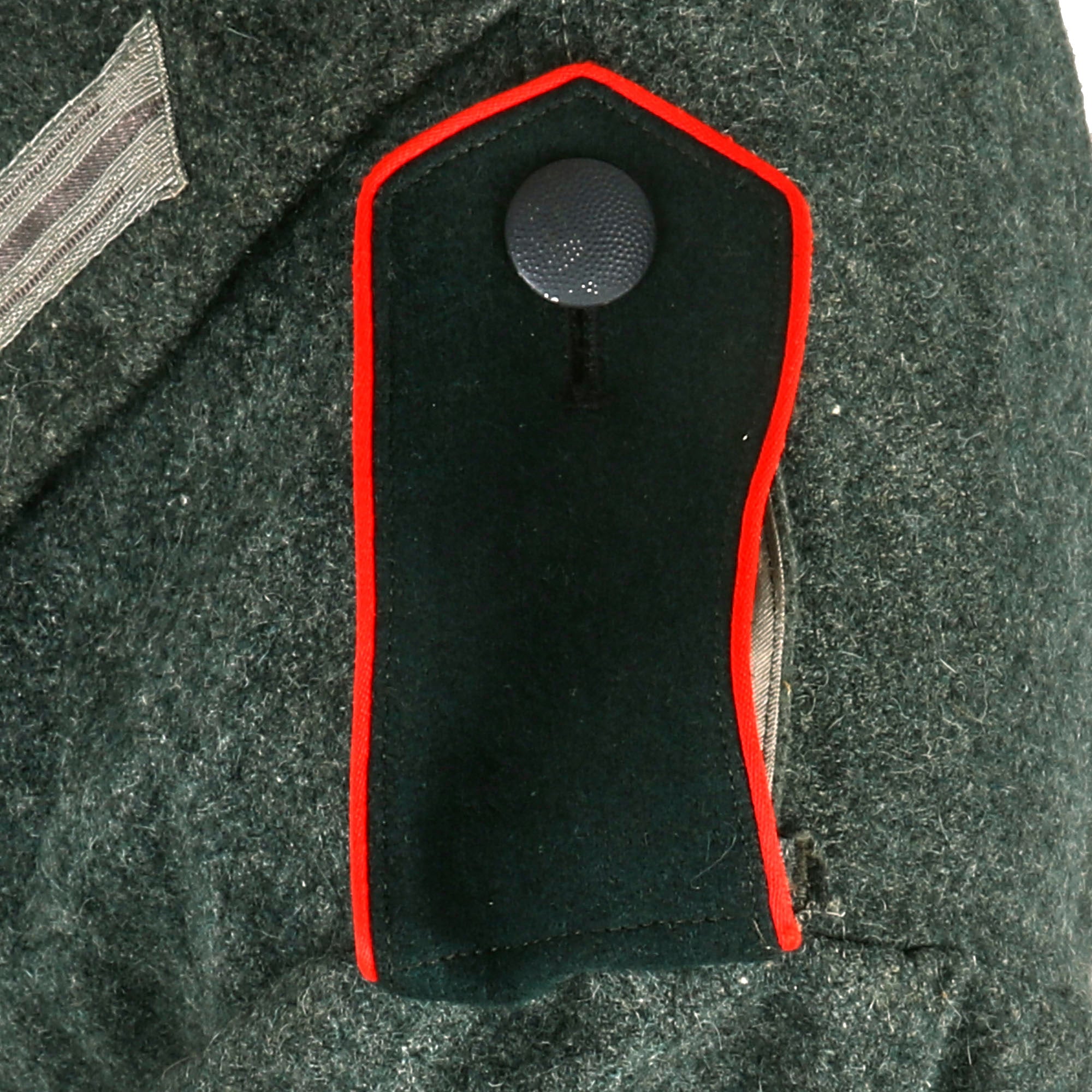 The tunic does however have a set of large WWI style Mannschaften Schulterklappen (Enlisted Shoulder straps), which are a flaschengrün (dark bottle-green) color with hochrot (deep red) piping around the edges. While one might assume these are for artillery, these are actually the style and size used for foreign volunteers later in the war. With these, the color of the piping indicated where they were from, and the deep red color were for Cossack volunteers, which were mostly from the Don Cossack group. Turkish volunteers had light blue piping, while volunteers from Azerbaidjan were green.