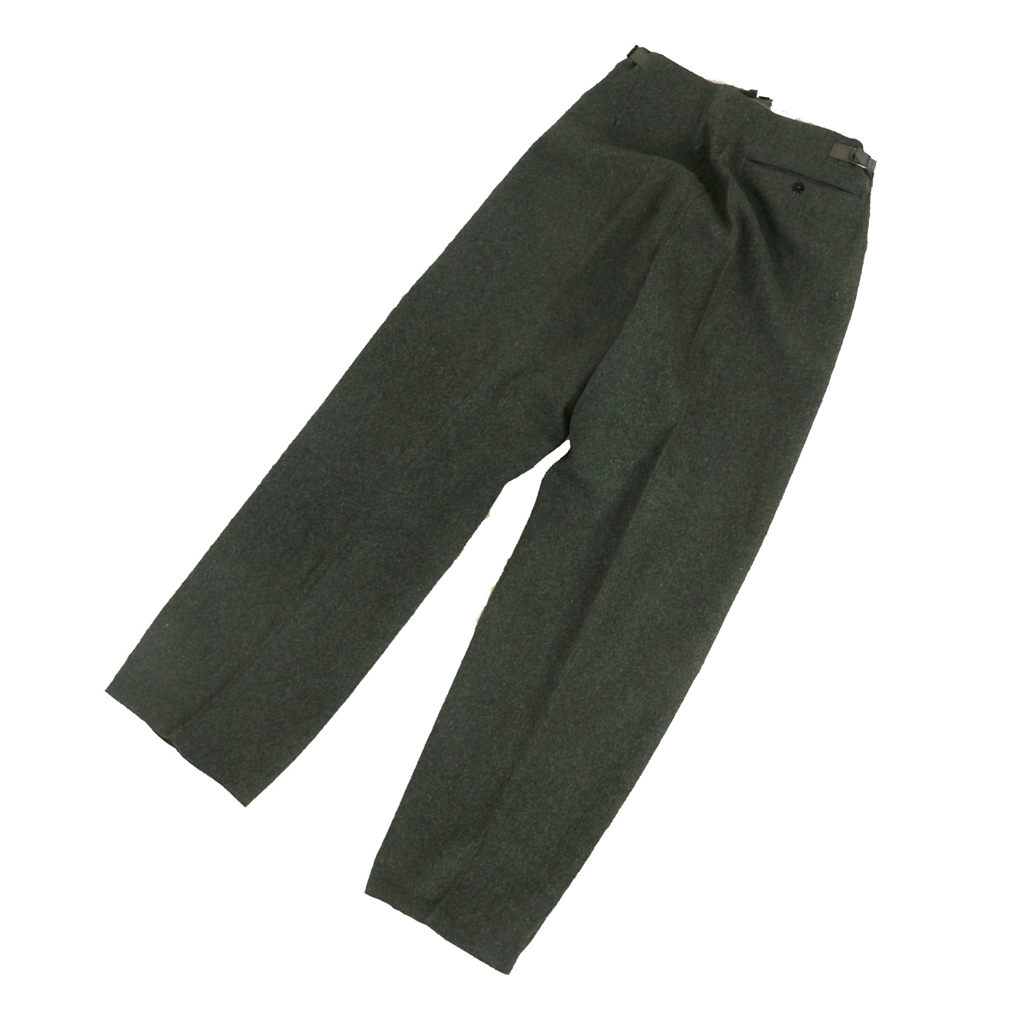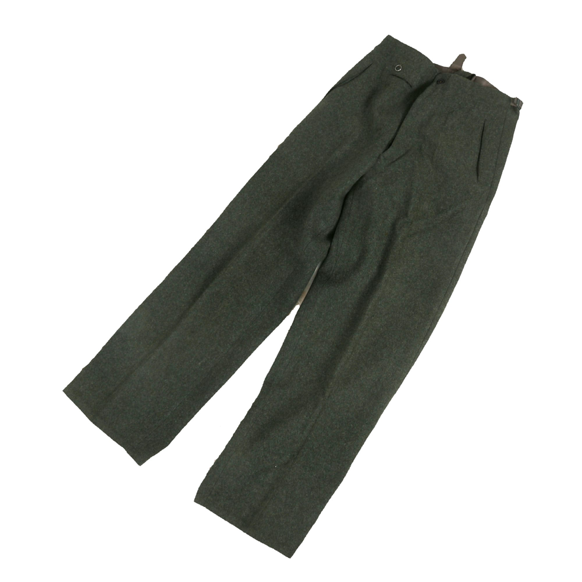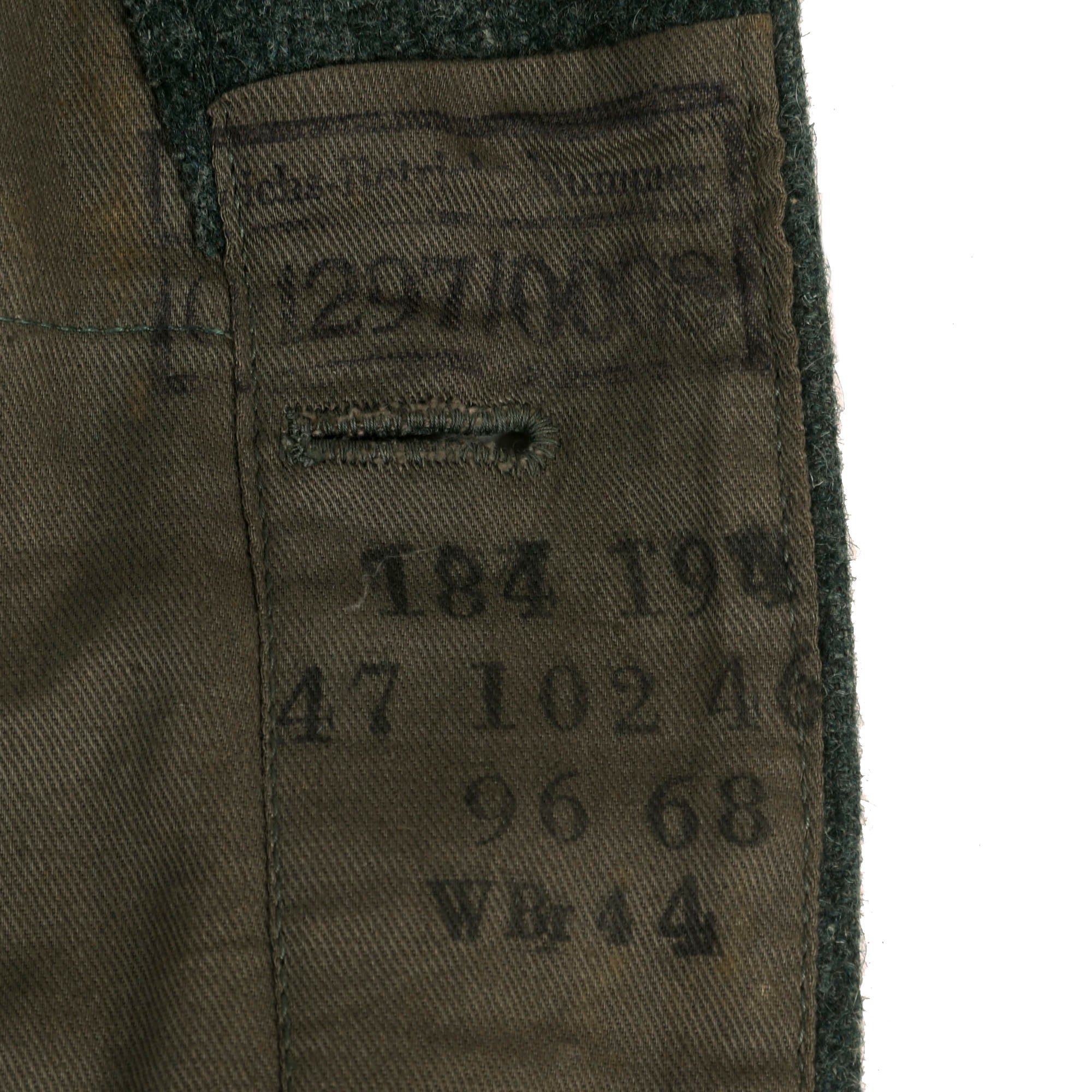 This is a lovely 1944 dated service used example of the Heer Army Issue M44 tunic, which shows some great period wear, and comes complete with a pair of standard uniform trousers. It is made of very nice "Italian Cloth" style wool, in the correct Feldgrau 44 color. It features two un-pleated chest pockets with square flaps, each secured with a green painted pebbled button. The front closure features five of the same buttons on the right breast flap meeting an equal number of reinforced buttonholes on the left flap. The buttons do all look to be maker marked, but we cannot read the stamps, and all are sewn directly to the fabric.