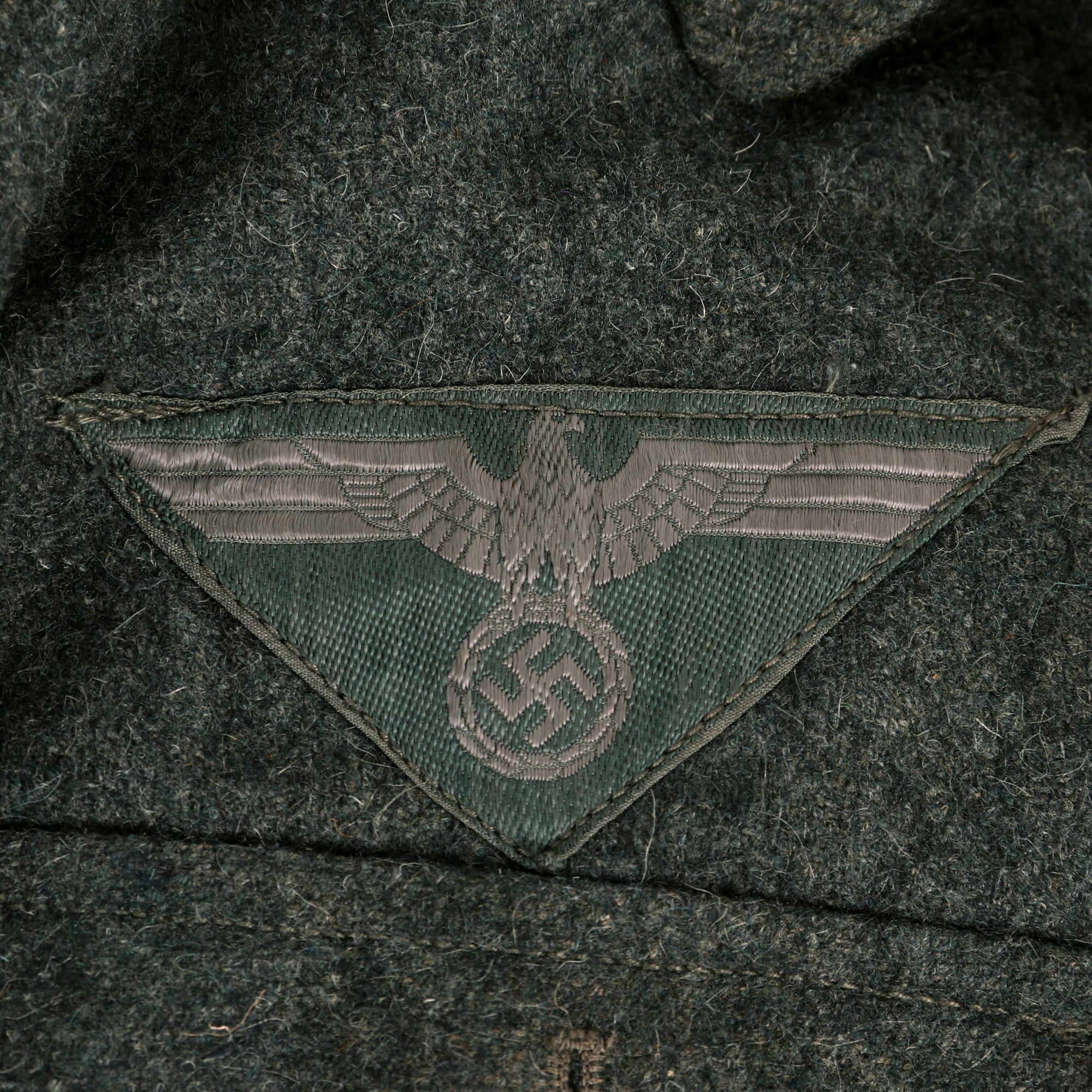 The tunic is fitted with the correct insignia, including late war enlisted gray BeVo style litzen on the collar, and a green / gray triangular BeVO machine embroidered breast eagle, totally correct for this type of tunic. We cannot see any signs that other insignia were sewn onto the tunic, which was fairly typical for examples made late in the war.