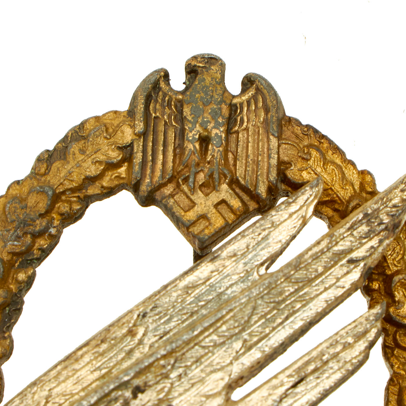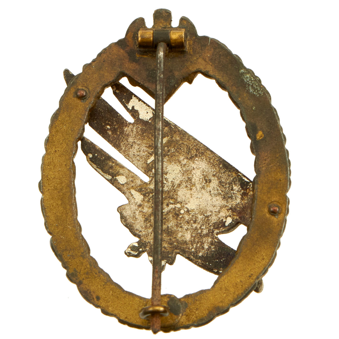 The basic design of the Heer badge is different from the Luftwaffe badge, with a gilt Oak Leaf wreath, surmounted by the Army closed wing Wehrmachtadler (Armed Forces Eagle. The Luftwaffe example has no eagle at the top, and the wreath is silvered and half Laurel. In the middle of the badge is a silvered "Diving Eagle", which is not clutching a swas as in the Luftwaffe version.The eagle is attached to the wreath with two fully intact rivets. It features a needle style vertical pinback with a barrel hinge, with an intact bent metal pin catch.