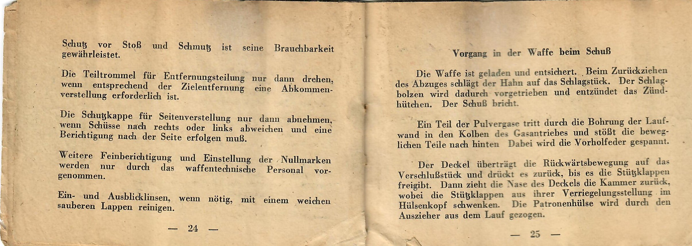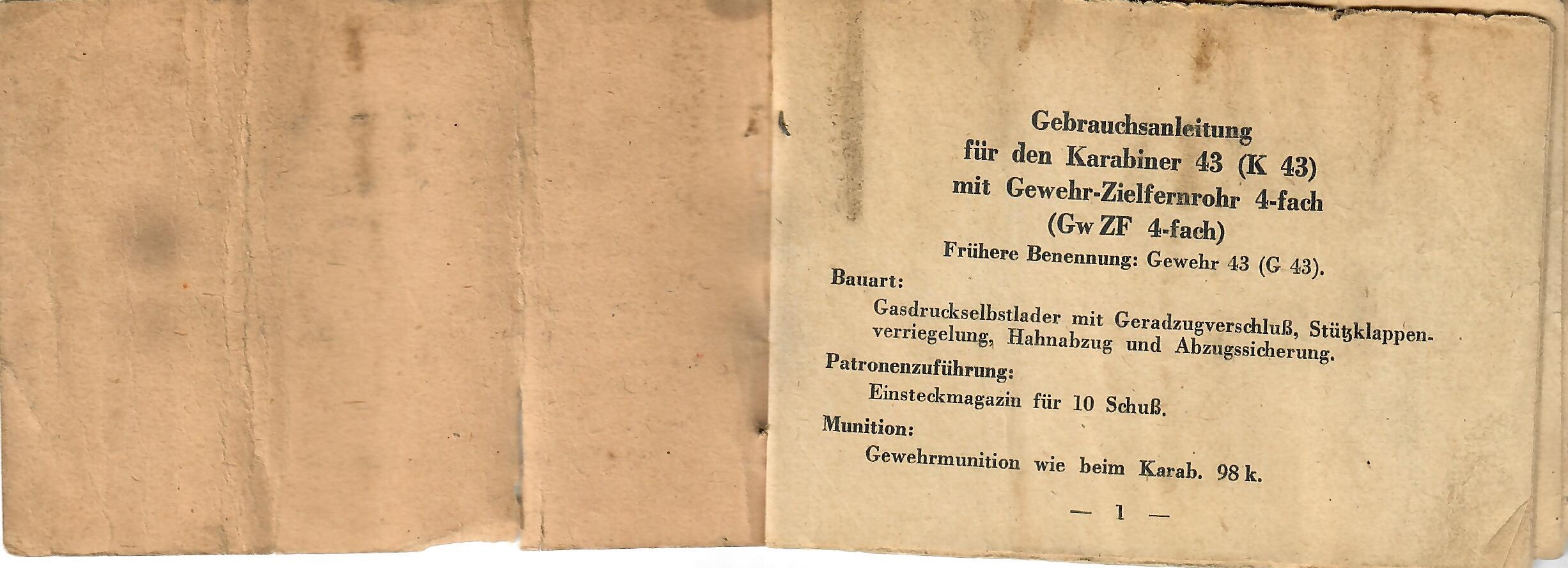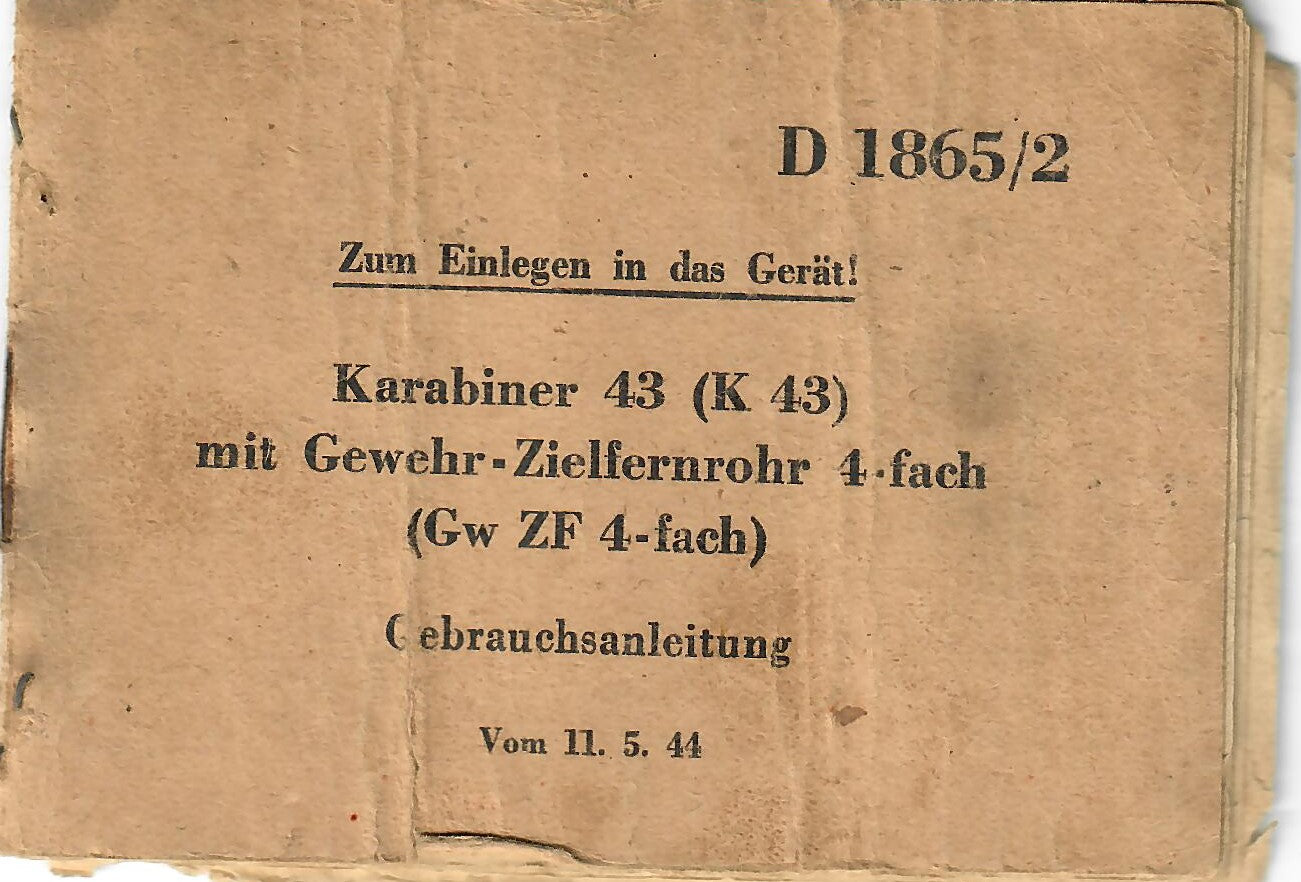 This is a rare manual for a rifle equipped with the scope. The manual was intended to be inserted into the butt trap of the rifle, so almost all of them remained there when the rifles were captured or destroyed. This example definitely looks to have been rolled up at one point, but it is definitely intact, and can still be read if handled carefully. The front cover reads: