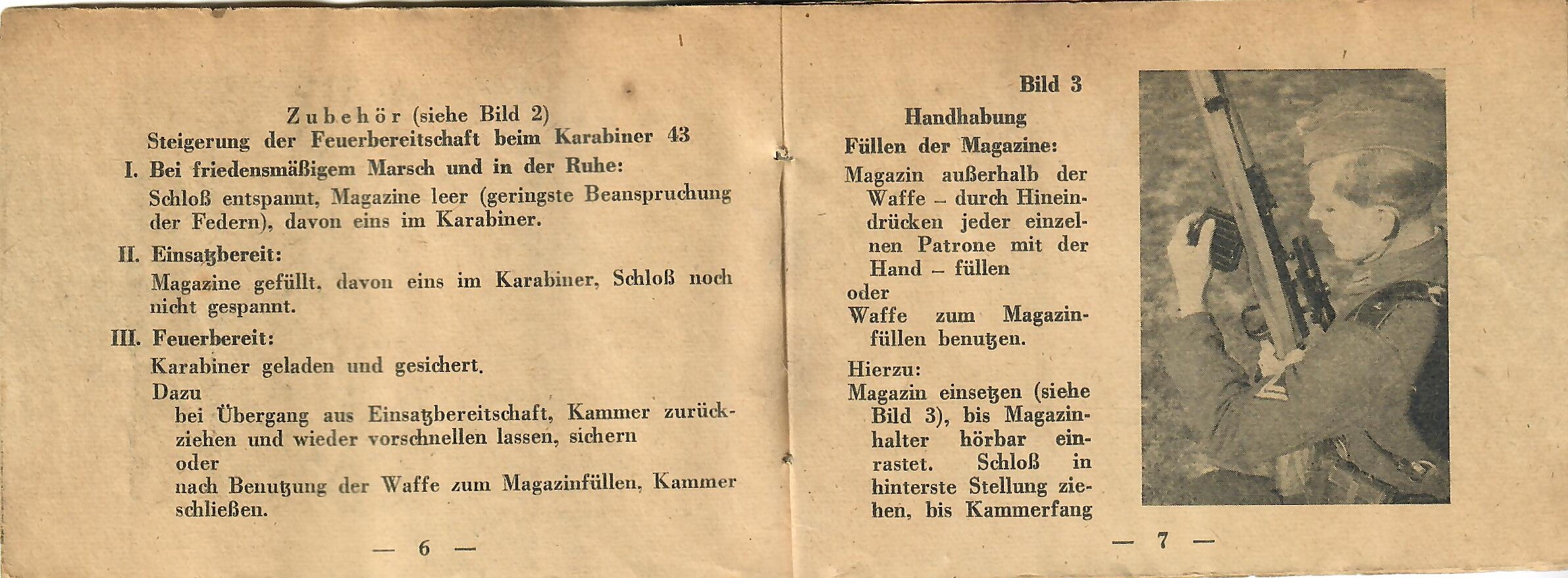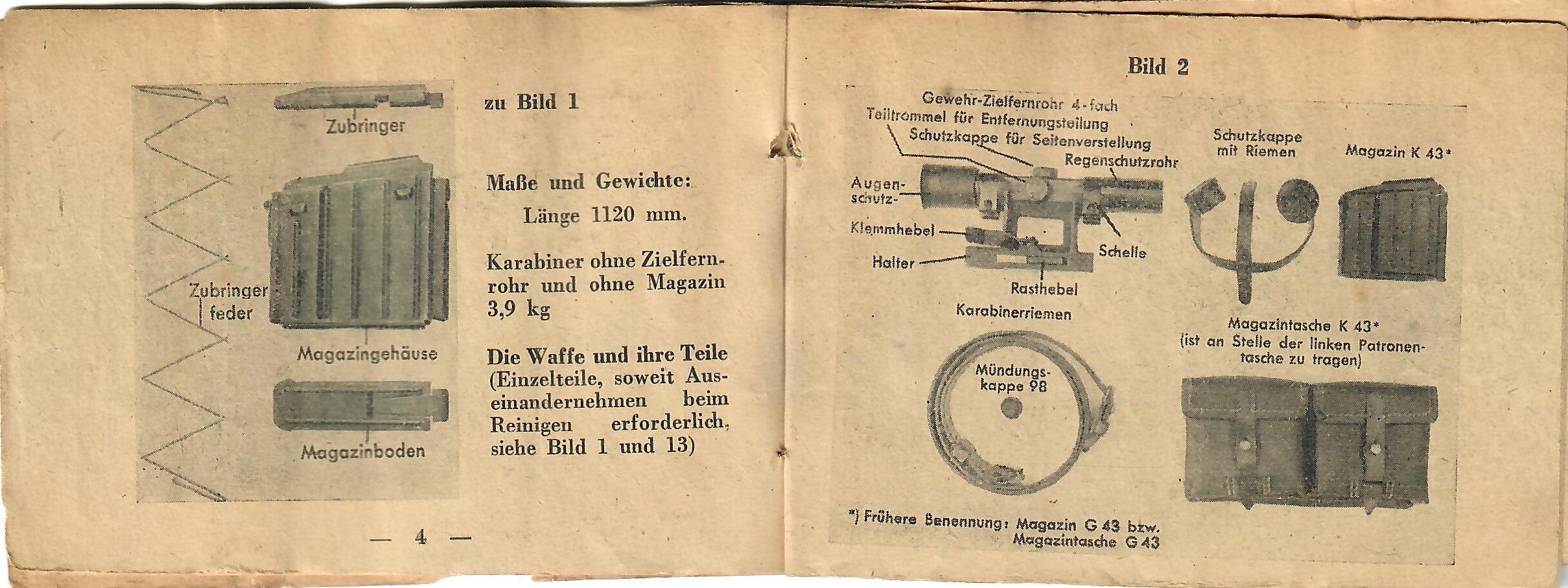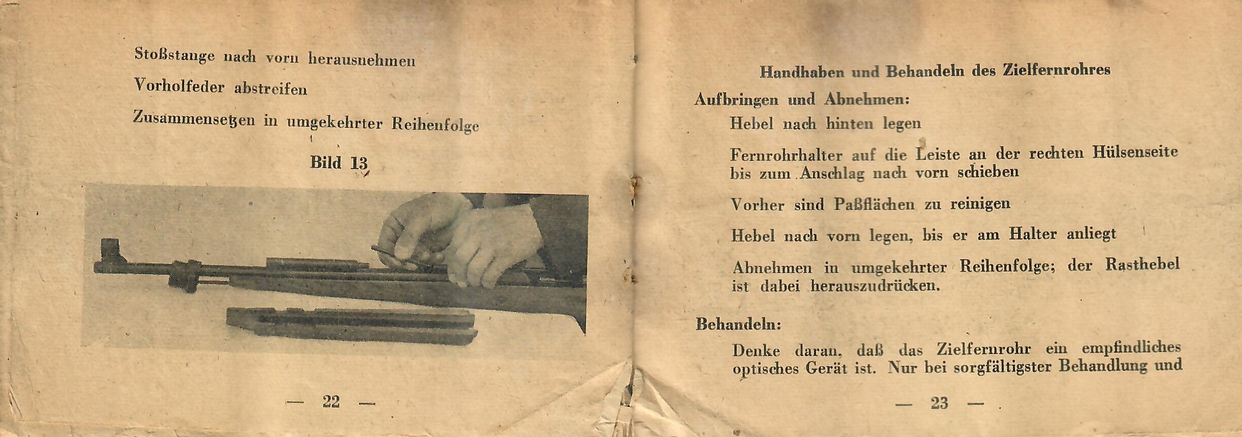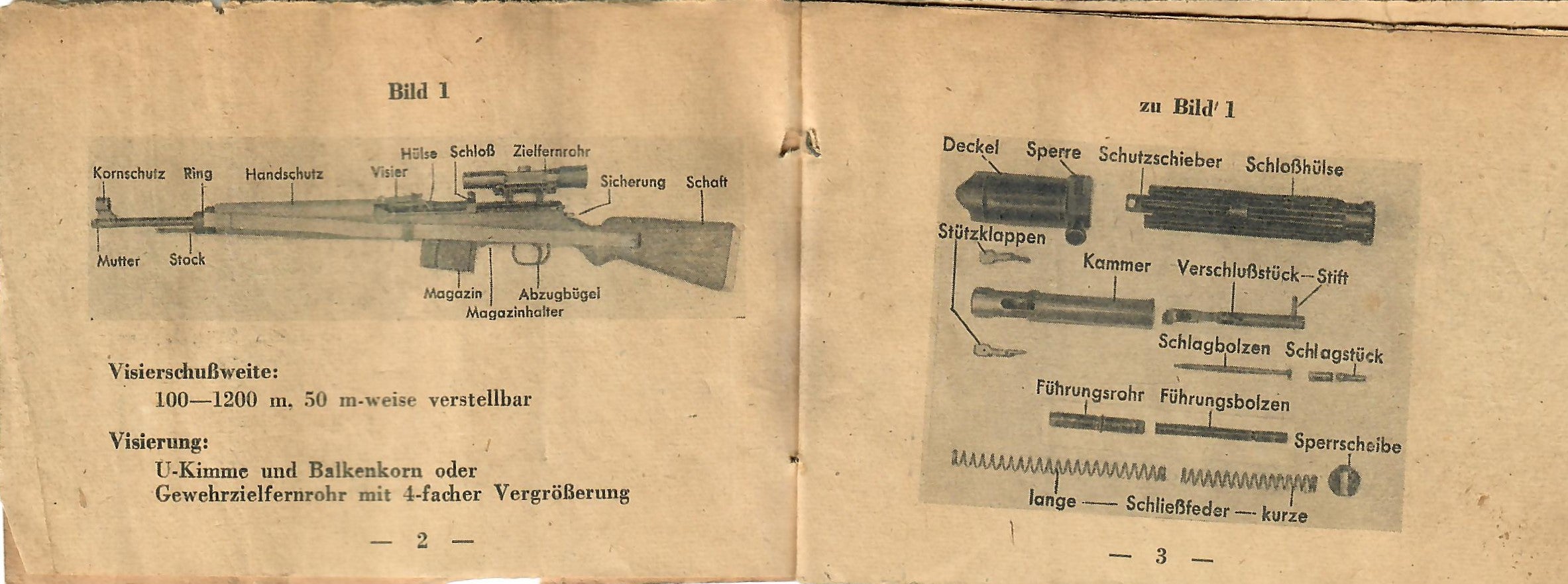 This basically translates to "To Insert Into the Device" and "Instruction Manual for the Gewehr 43 Rifle with ZF 4X Telescopic Sight). As the instructions are still curled up, getting scans of them was somewhat difficult, resulting in shadows which do not exist on the actual manual.