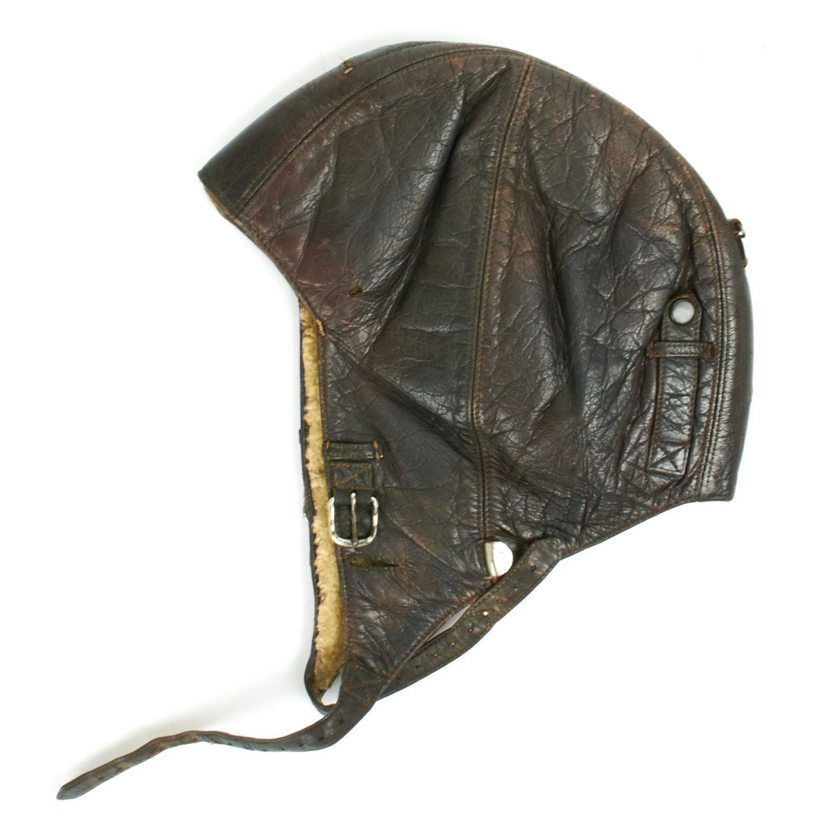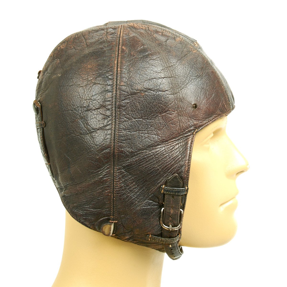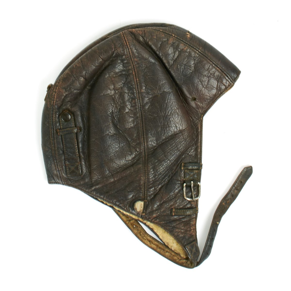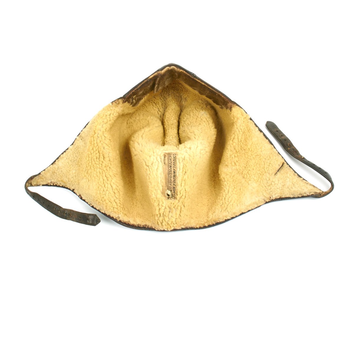 The size 58cm flying helmet is in excellent condition constructed of brown supple leather with two crossing chinstraps. The interior is finely wool lined and bears a maker label that reads: