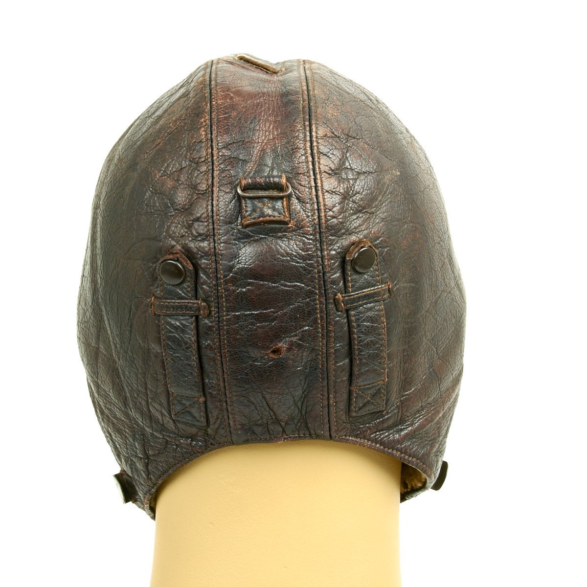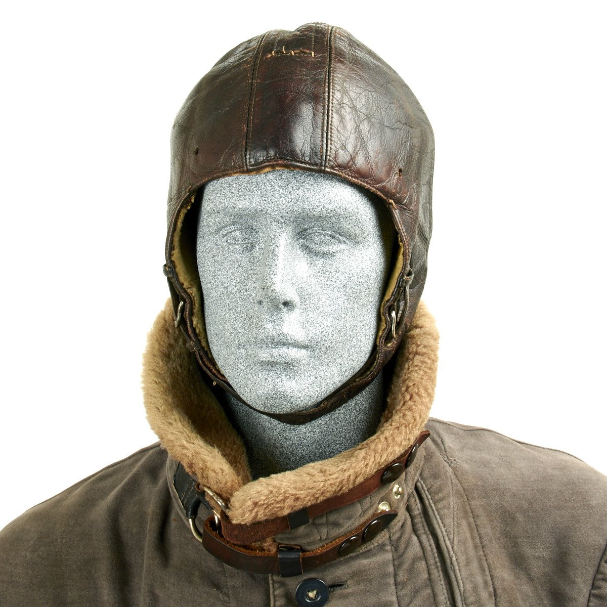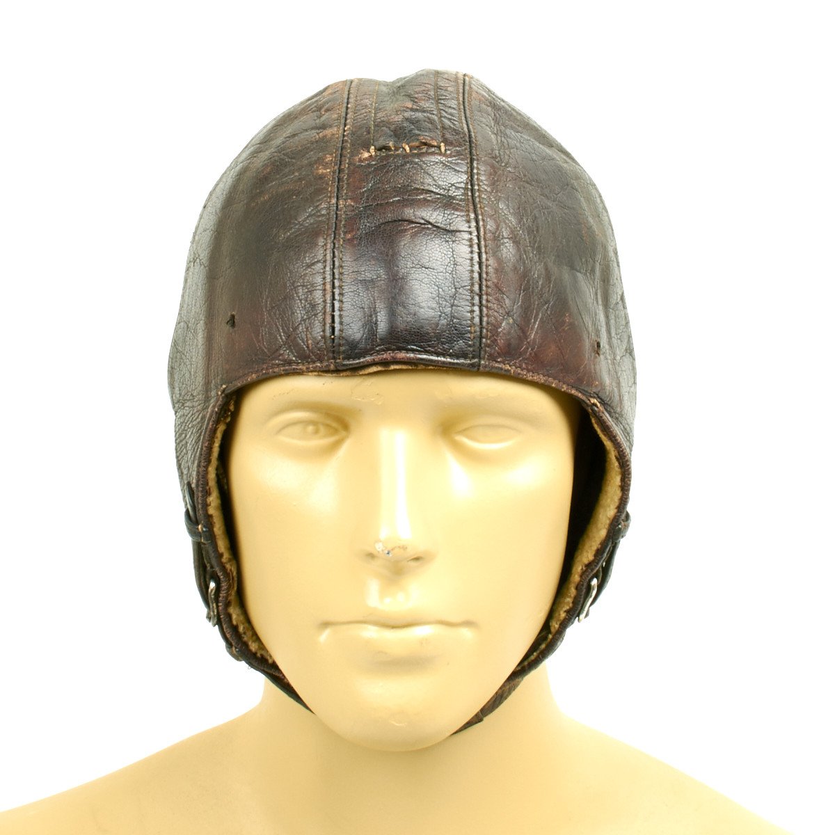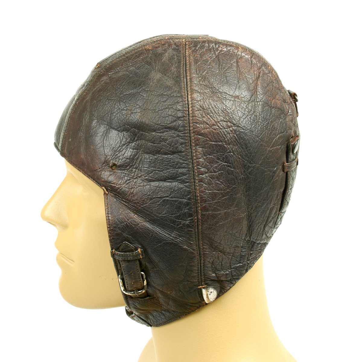 The size 58cm flying helmet is in excellent condition constructed of brown supple leather with two crossing chinstraps. The interior is finely wool lined and bears a maker label that reads: