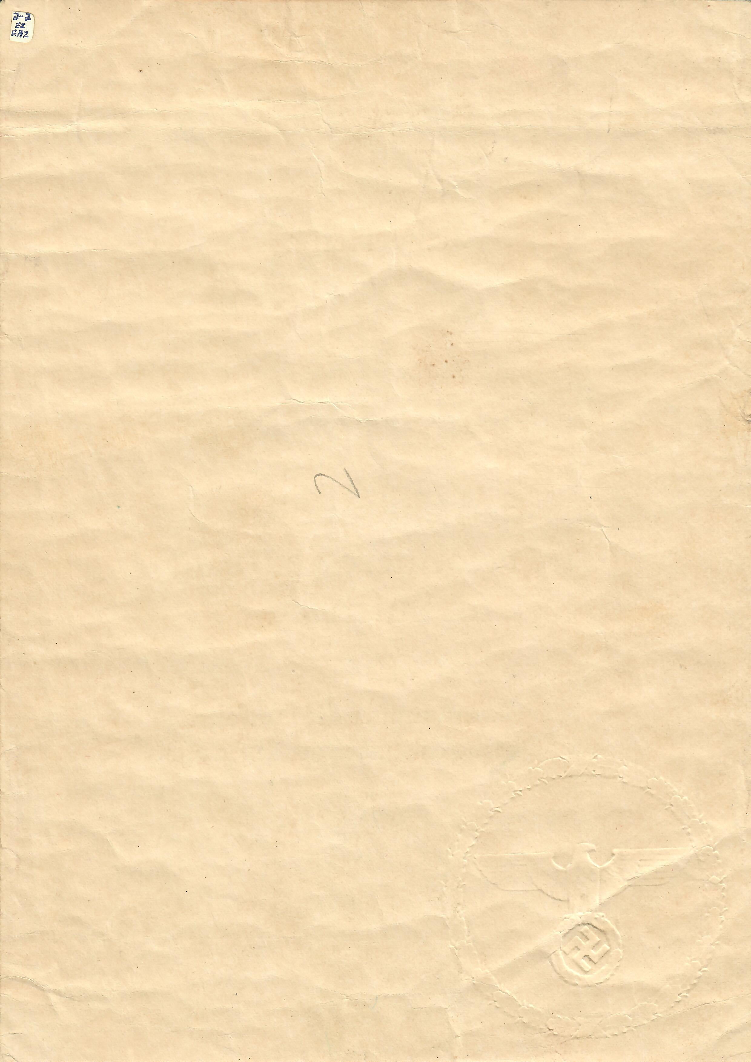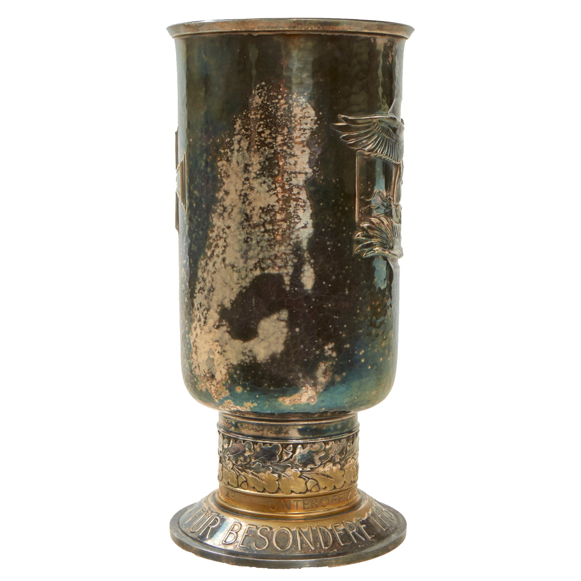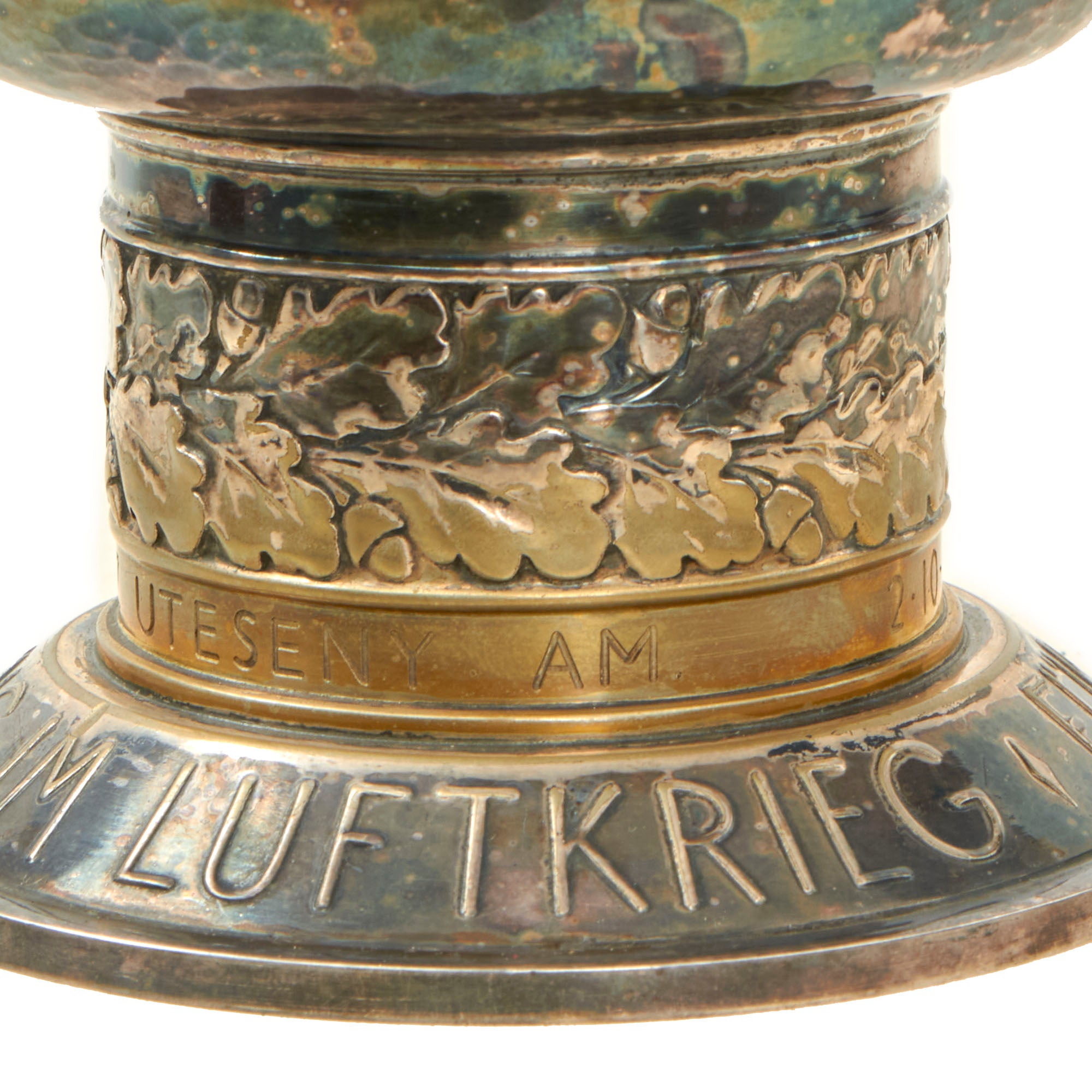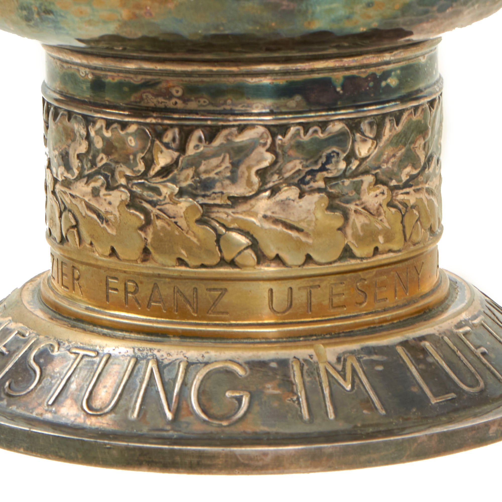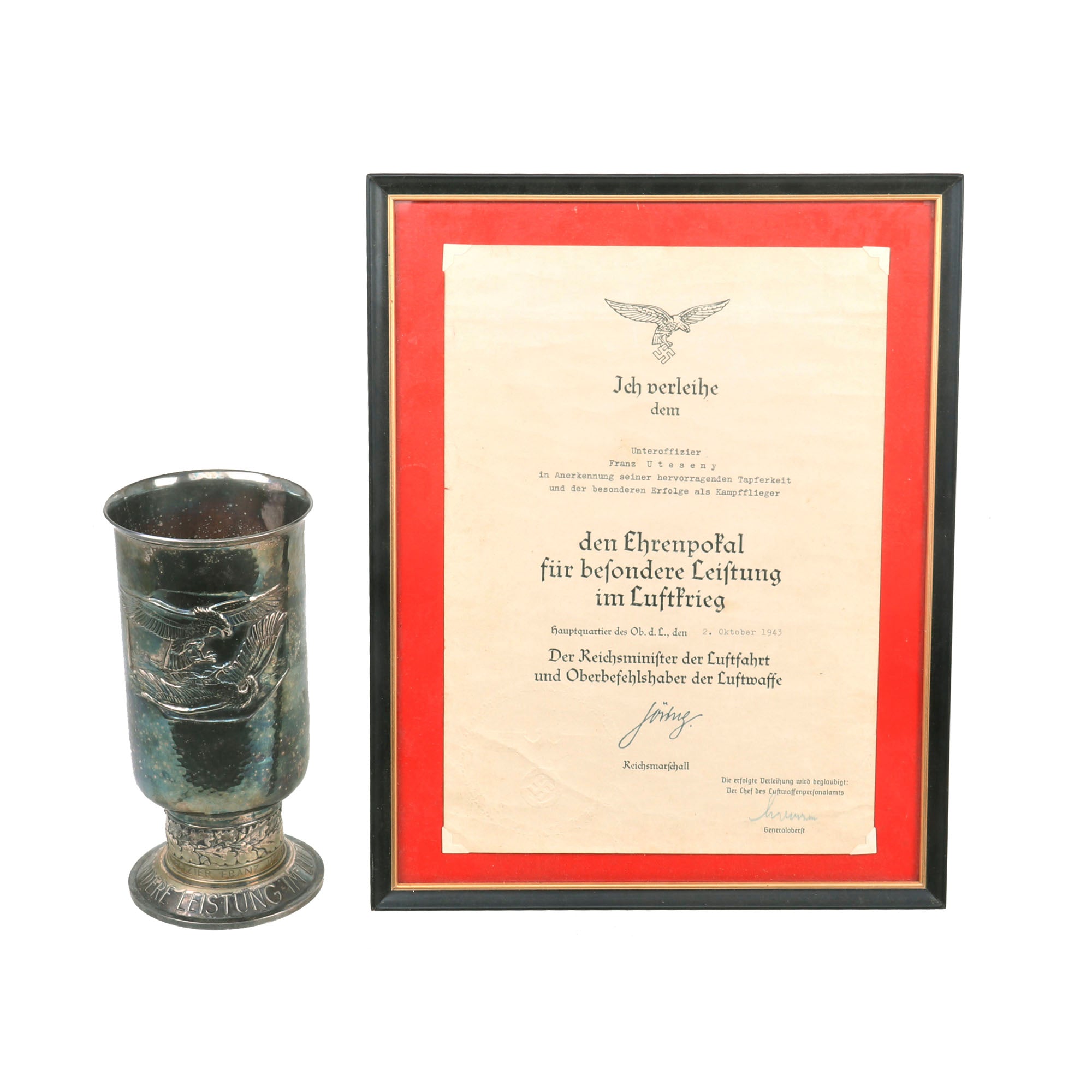 This goblet was presented on October 2nd, 1943 to Unteroffizier Franz Uteseny, who had previously been awarded the Iron Cross 2nd and 1st Class awards, and comes complete with the original award document! The document is printed on the correct mid weight A4 size (8.27 in x 11.69 in) paper. It begins with the standard award statement under an early war Luftwaffe "Droop Tail" eagle: