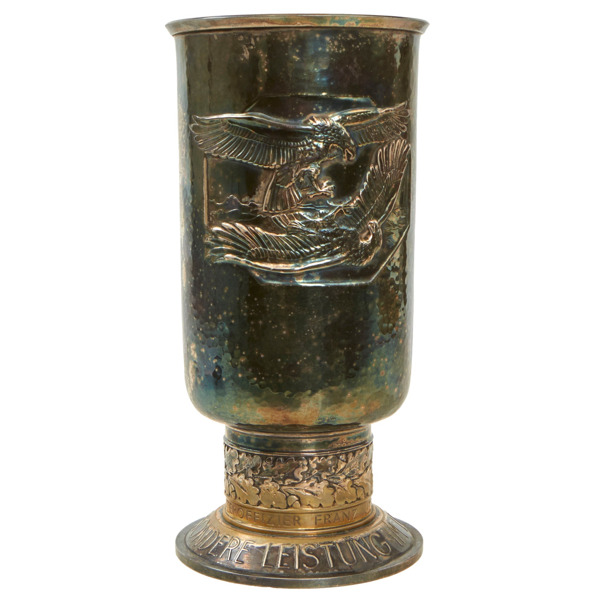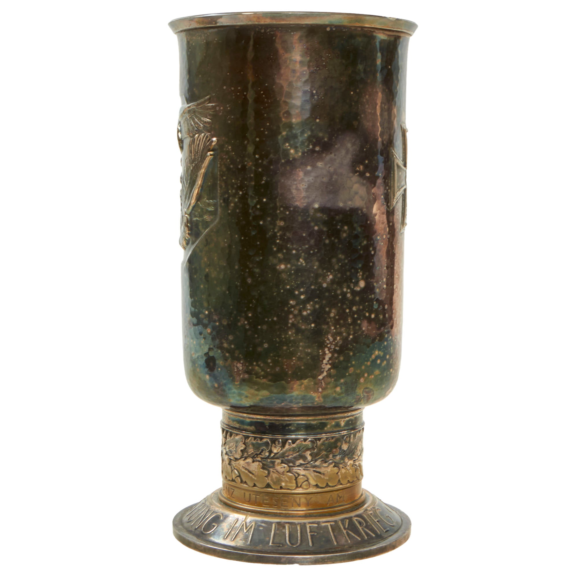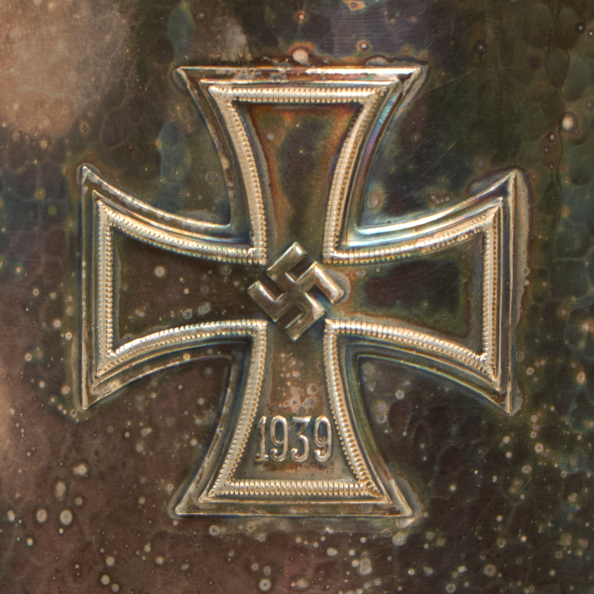 The goblet itself measures 8 ⅛ inches tall, with a diameter of 3 ¾ inches at the mouth. This example is made from "German Silver", a cupronickel alloy also called Neusilber, Nickel Silver, and often "Alpaka", which was then fully silver plated. The design shows the 1939 Iron Cross on one side, with the Luftwaffe Eagle in combat with another eagle on the opposite side. The silver plating is well retained on almost all of the goblet, except around the bottom where it is named, which looks to have been polished to keep the name fresh.