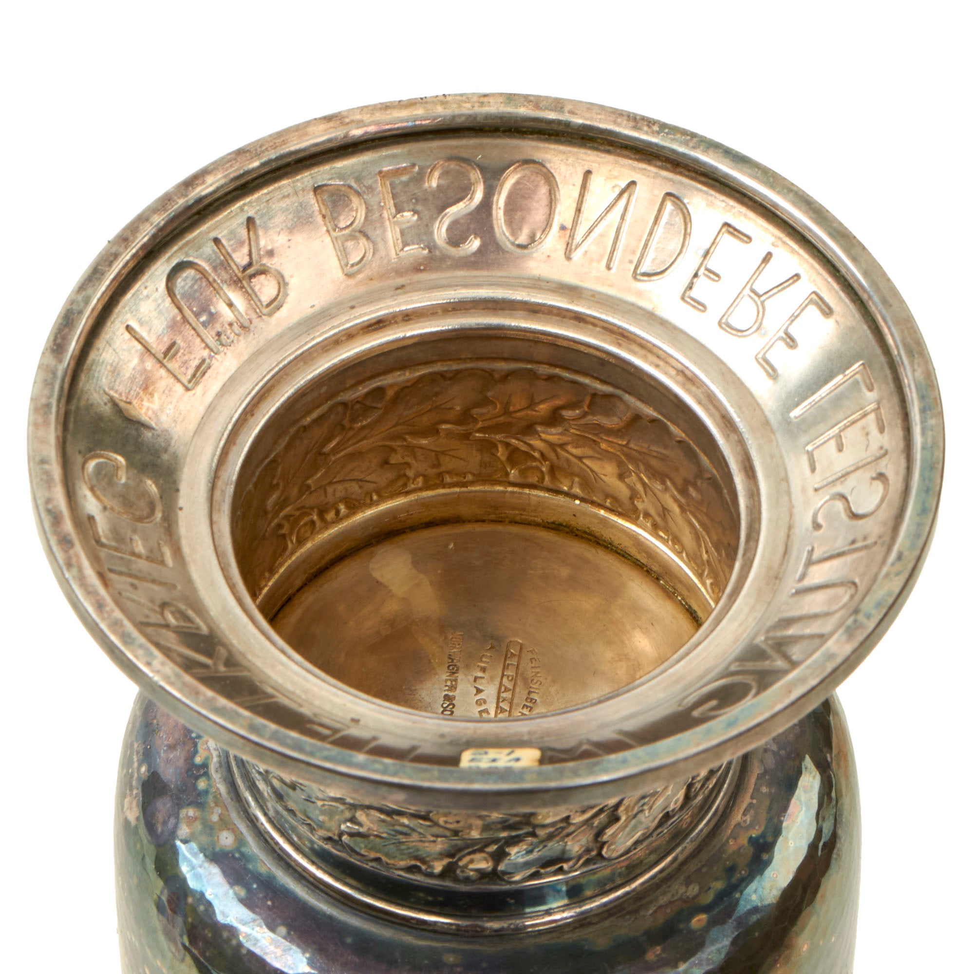 This is a known and well-regarded maker of fine silverware, which is seen on other Luftwaffe Honor Goblets, as well as various presentation cases and other silver items. There is also an old museum asset sticker on the bottom as well.