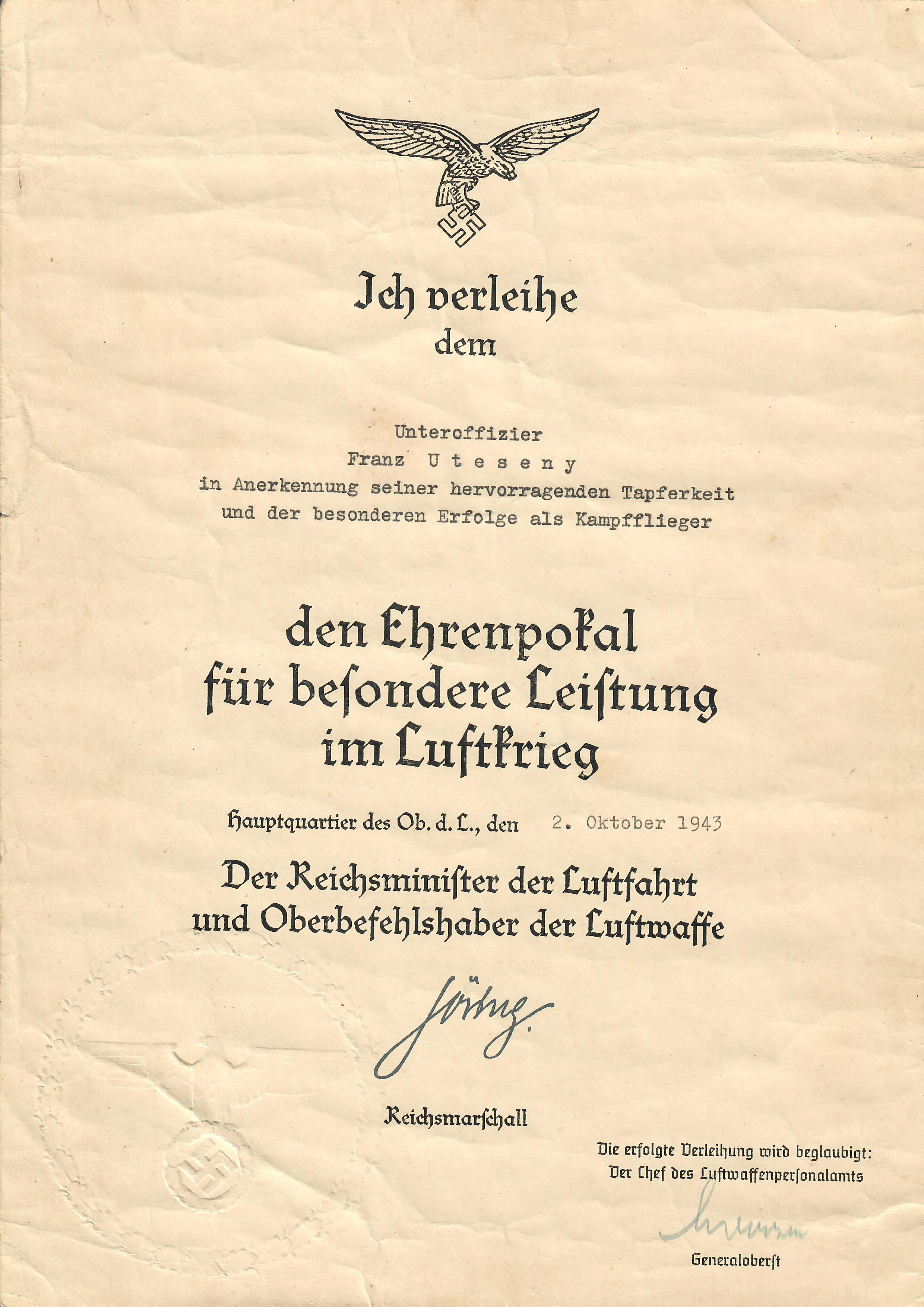 This translates roughly to "I award Corporal Franz Uteseny in recognition of his outstanding bravery and special achievements as an air fighter" and indicates he was given the Honor Goblet on 2. Oktober 1943. The document has a facsimile signature of Göring / Reichsmarſchall, and on the lower right is the signature of Der Chef des Luftwaffenperſonalamts (Chief of the Luftwaffe Personnel Department), Generaloberst Bruno Loerzer. The document is in very good condition, and has the correct raised seal on the lower left hand side. It comes in a lovely 11 1/4"W x 14 1/4"H Frame.