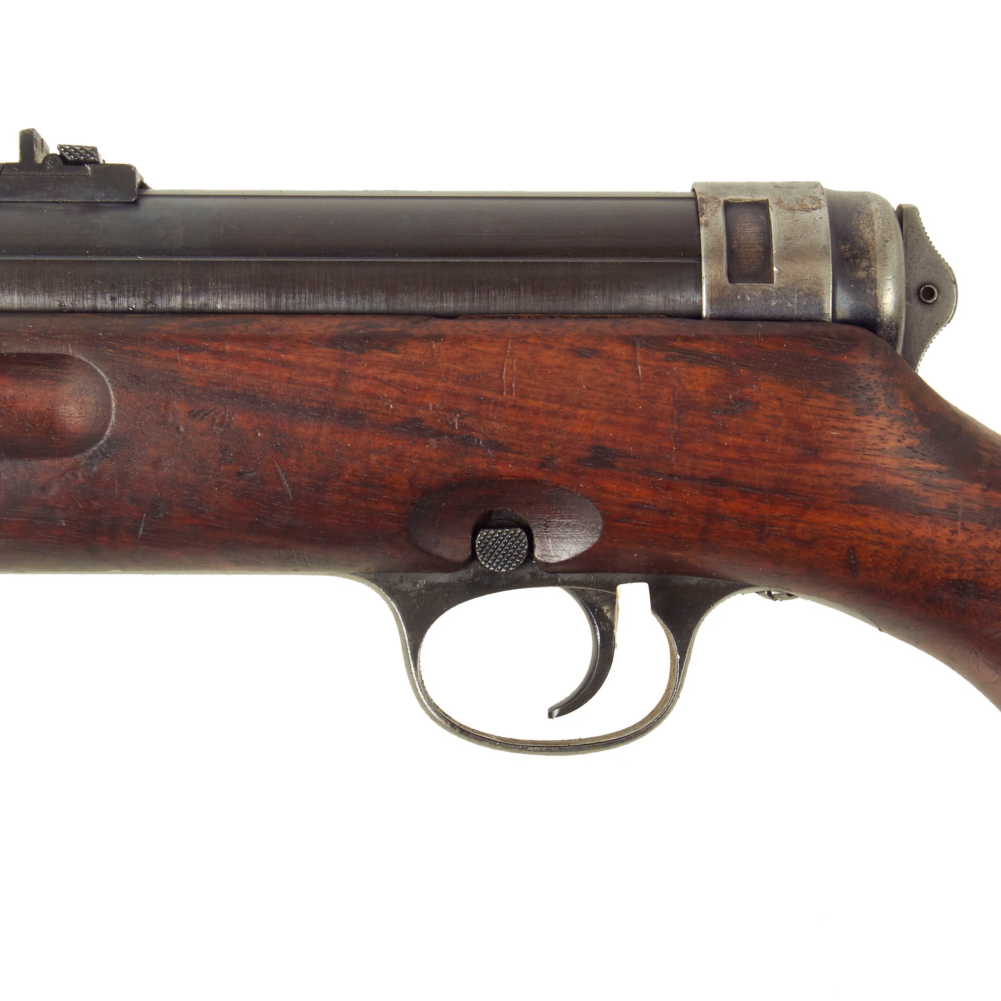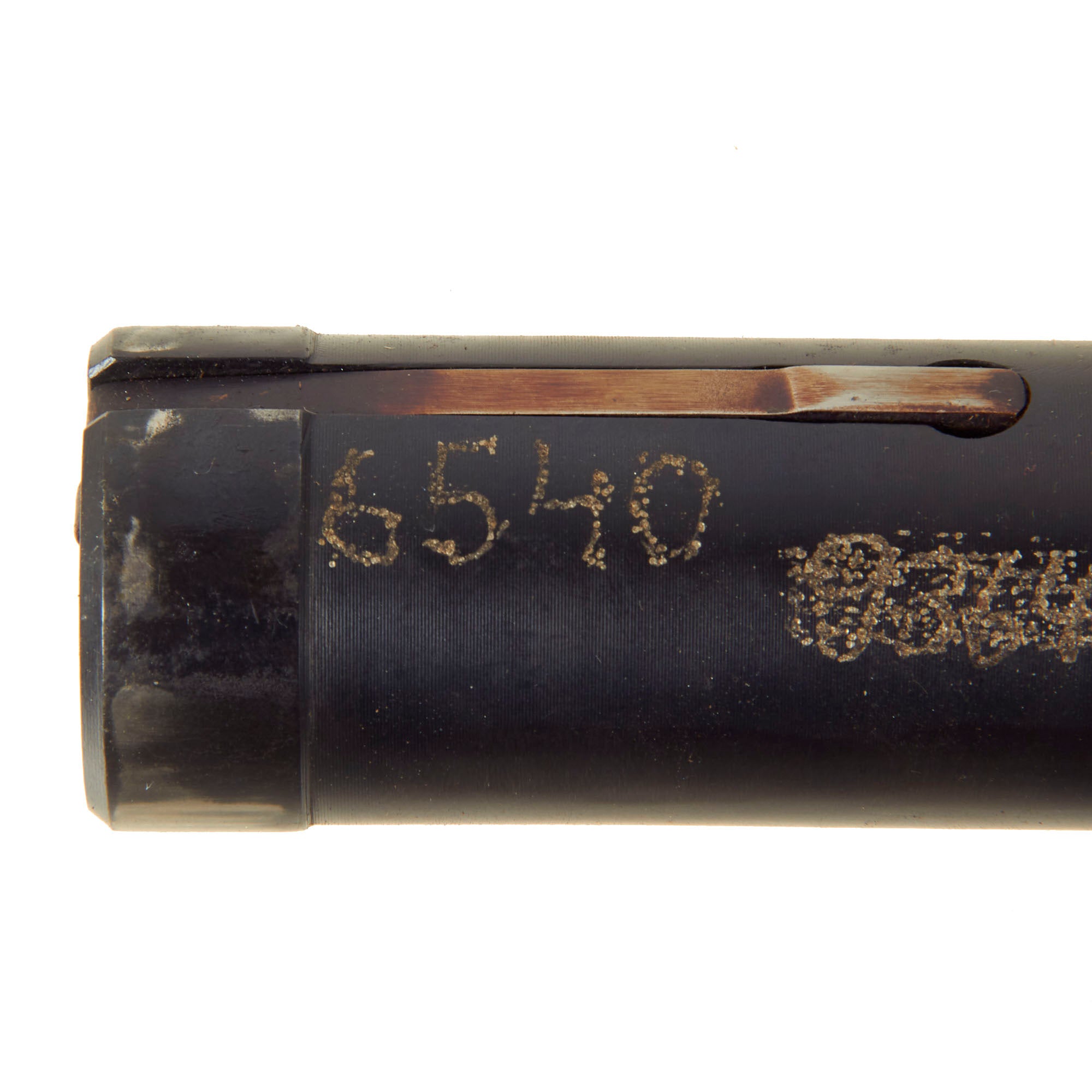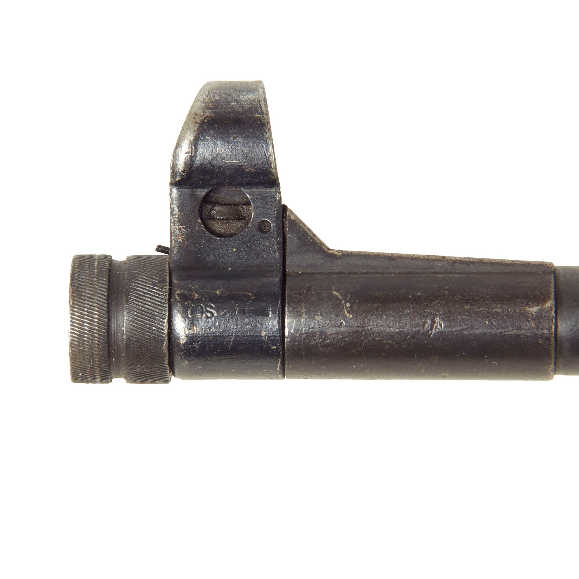 Original Item: Only One Available. This incredibly rare example features all original parts, including an original live barrel. Following guidelines provided by the BATF, the original barrel bushing and barrel have been welded to a steel dummy receiver tube, which is completely inert. There is also the required 2 inches completely replaced by solid bar stock. The original sight has been attached to the top of the receiver. The trigger still pulls, the selector still moves, and the magazine correctly locks into place. As an added bonus, we received this display gun with the original bolt and recoil assembly, as well as the ejector, which are included with this offering.